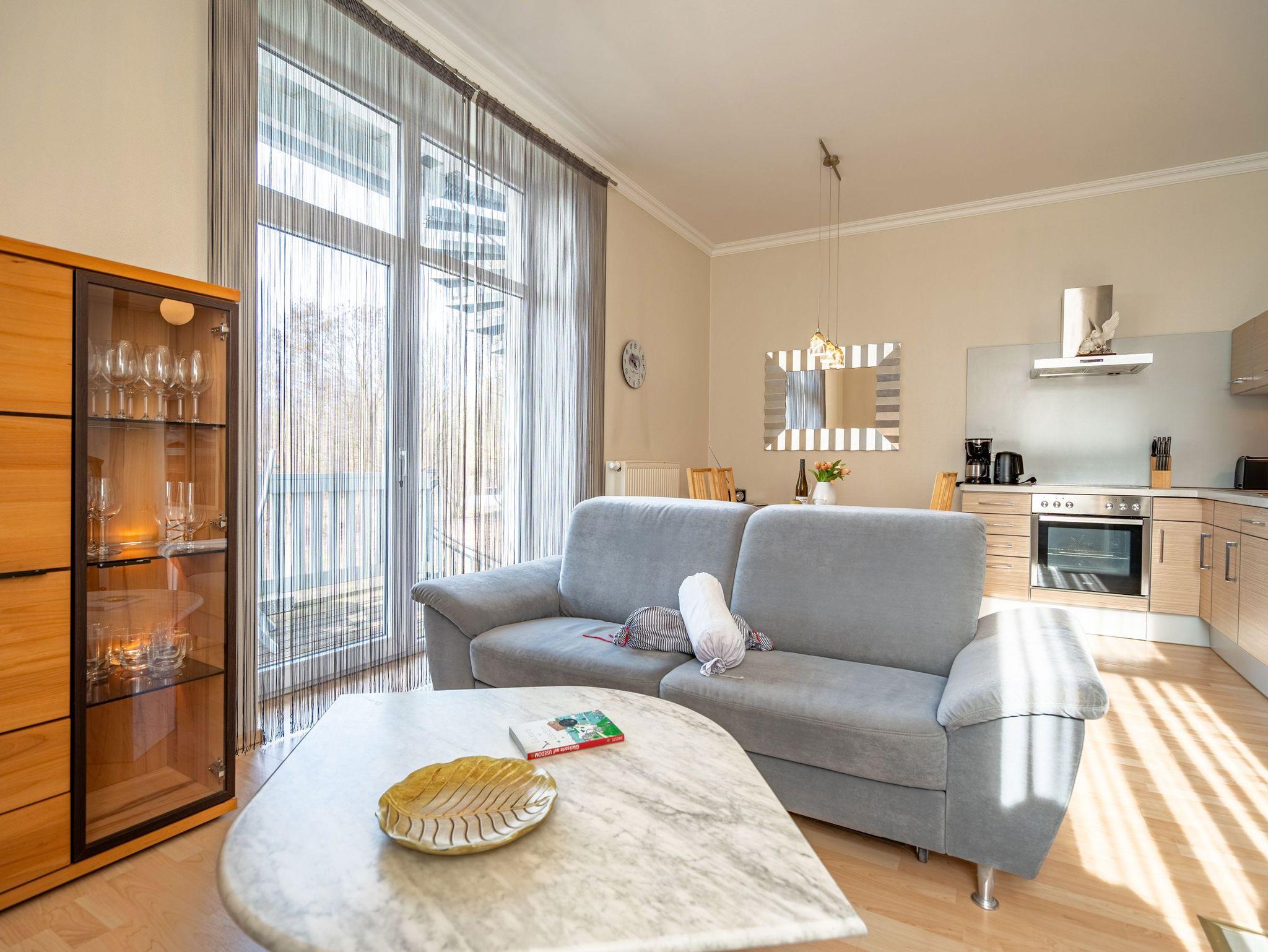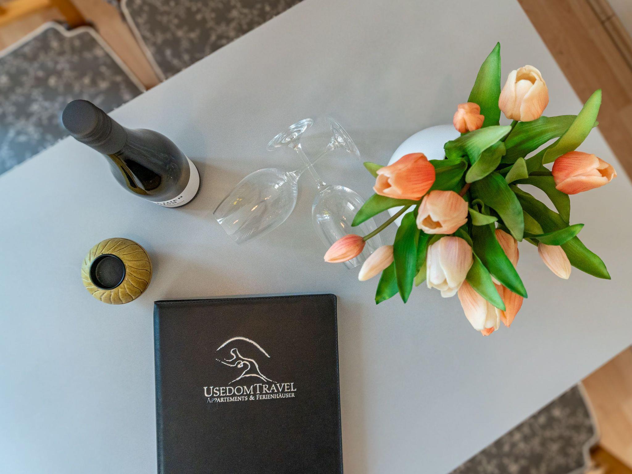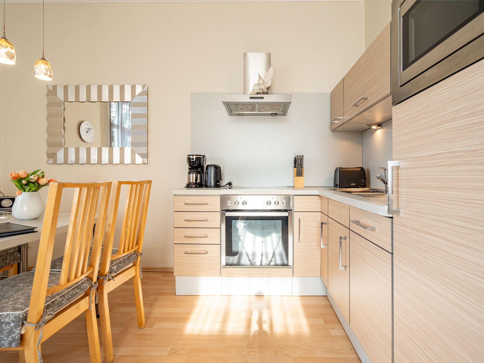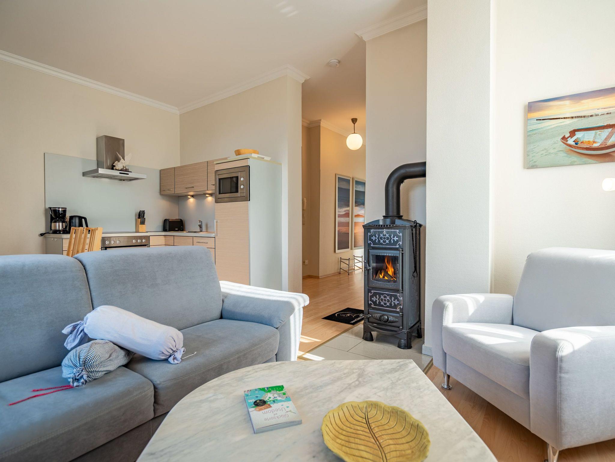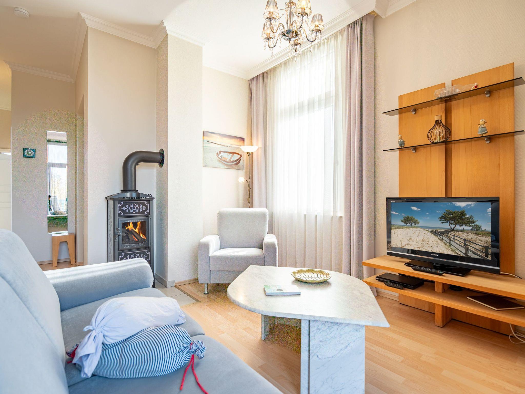 Diese wunderschön gestaltete 2-Raum-Ferienwohnung empfängt Sie in der 1. Etage der Villa Seestern und bietet Platz für 2 Personen und 1 Kleinkind bis 3 Jahre. Die stilvolle, moderne Möblierung und die geschmackvollen Dekorationen sorgen für einen schönen Urlaub. Sie fahren mit dem Fahrstuhl direkt in Ihre Wohnung. Hier angekommen, erreichen Sie den Wohnbereich (Flat-TV, DVD) und eine offene, komplett ausgestattete Küchenzeile. Das großzügige Schlafzimmer mit Doppelbett verfügt über einen zweiten TV. Ein modernes Wohlfühlbad mit WC, Bidet und Dusche ergänzt dies. Auf dem Südbalkon mit Blick ins Grüne genießt man nicht nur seinen Kaffee. Der Kaminofen verspricht besonders in der kalten Jahreszeit angenehme Stunden. Auf Wunsch stellen wir für unsere kleinen Gäste ein Kinderreisebett (ohne zusätzliche Matratze [&] Bettzeug) und einen Kinderhochstuhl ( gegen einen Aufpreis) zur Verfügung. Für Ihren Komfort sind die Betten bei der Anreise bezogen und Handtücher liegen bereit (Erstausstattung). Für den Tag am Meer steht Ihnen als besonderes Bonbon von Mitte Mai bis Ende September (je nach Witterung) ein Strandkorb am Strand kostenlos zur Verfügung. Auch das WLAN-Netz kann kostenfrei genutzt werden.