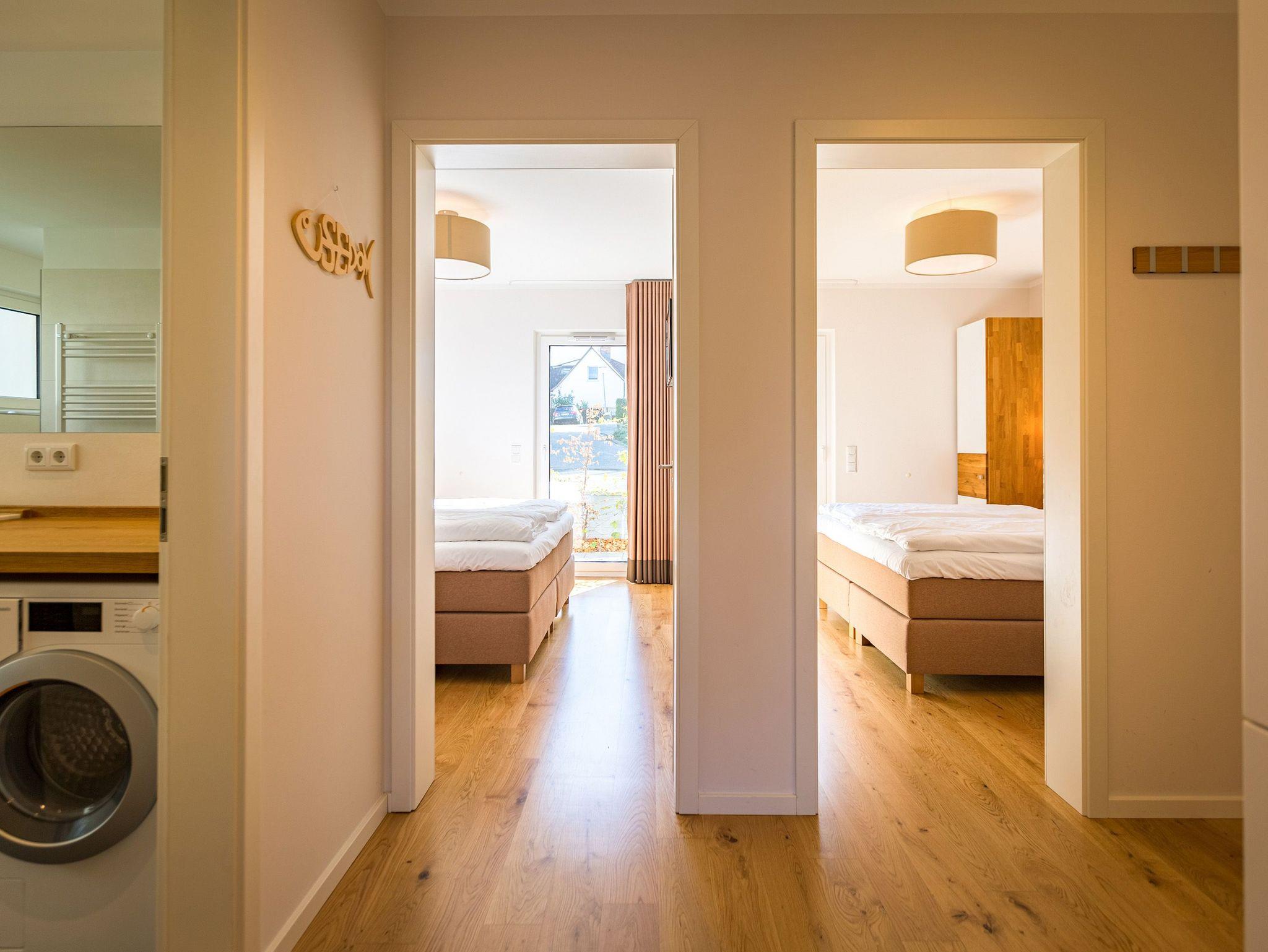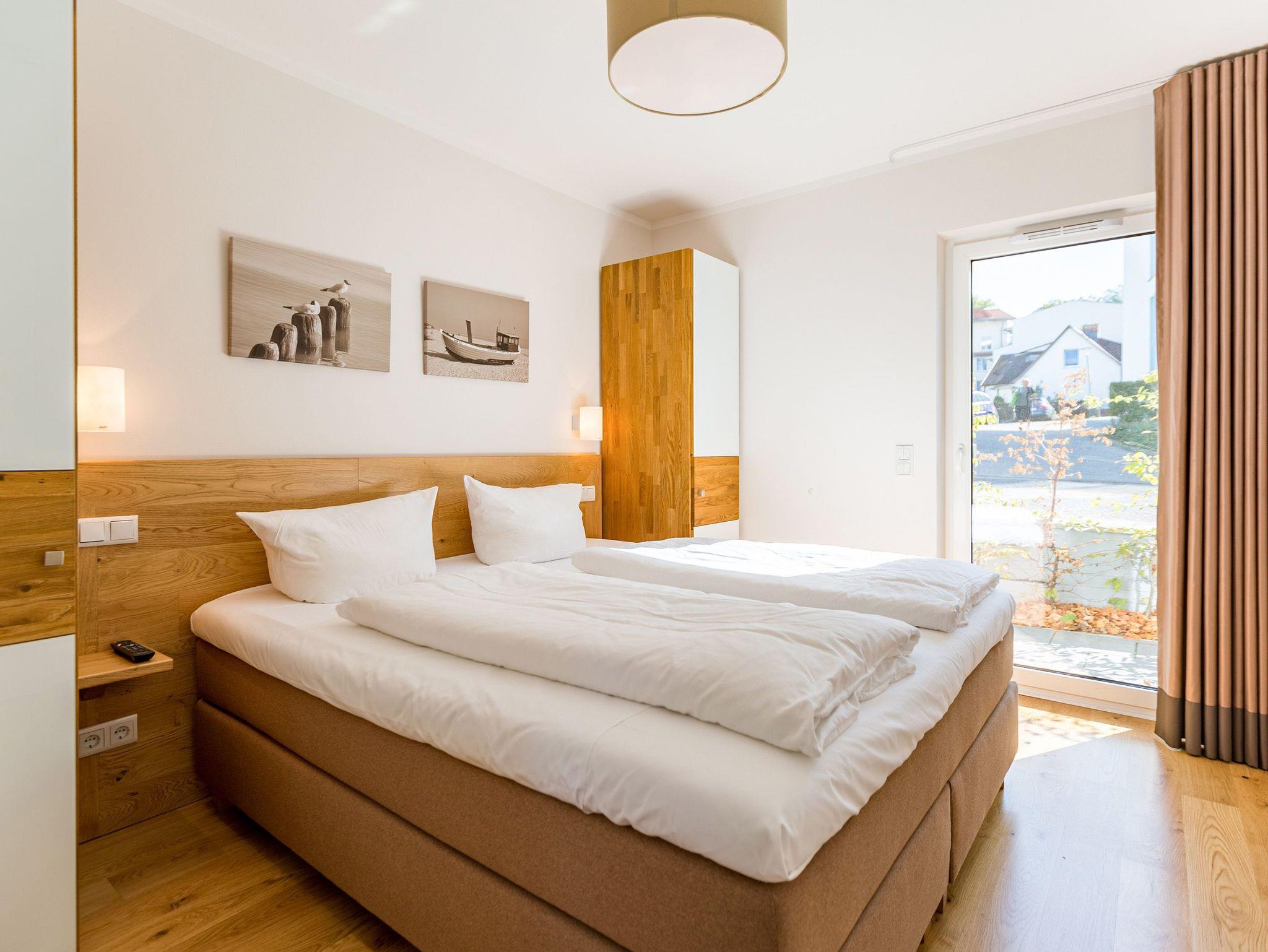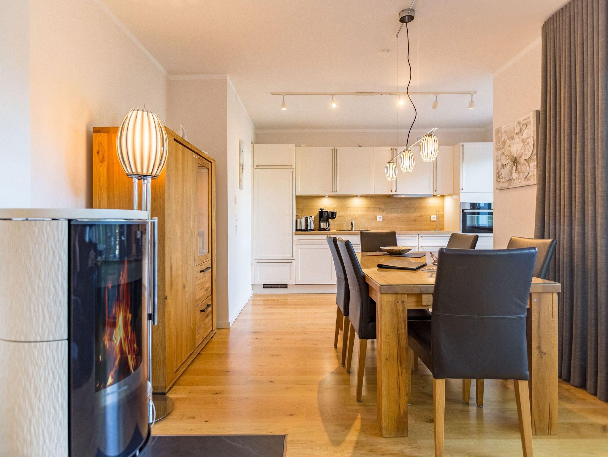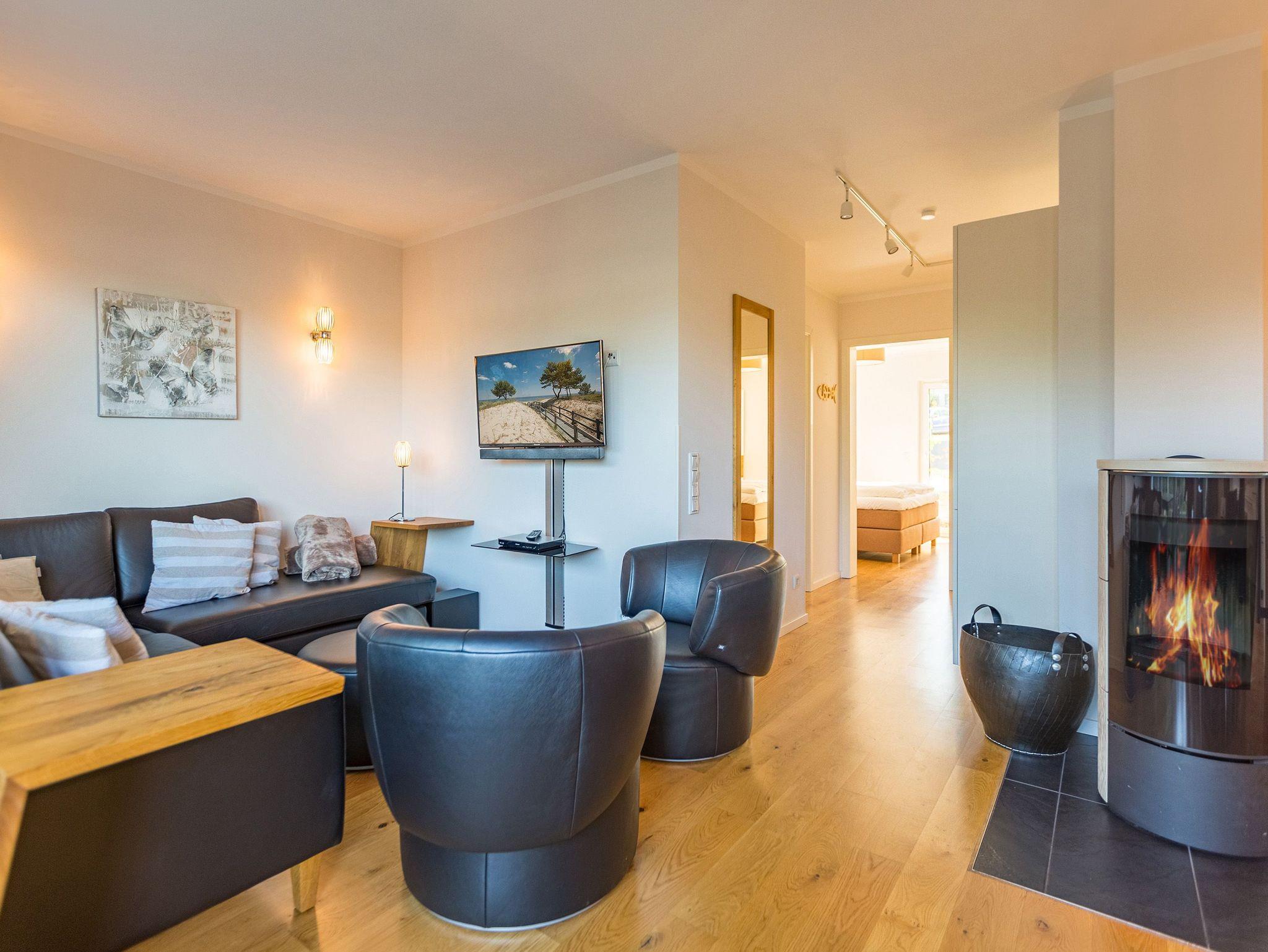 Wenn der Himmel sich im Sommer beim Untergang der Sonne in schönsten Rot- und Orange-Tönen färbt, dann können Sie auf der Terrasse Ihres Ferienparadieses sitzend diesem grandiosen Schauspiel bei einem feinen, gekühlten Getränk zuschauen. Die Wohnung 2 im Erdgeschoss des Quartiers am Fischerstrand entführt Sie auf ihren 75 großzügigen Quadratmetern in eine Welt aus warmen Farben und wunderschönen und modernen Echtholzmöbeln. Das 3-Zimmer-Appartement für vier Personen strahlt in allen seinen Räumen Eleganz aus. Zum offenen Wohnbereich gehört eine Küchenzeile mit hochwertigen Geräten wie Mikrowelle, Cerankochfeld, Backofen, Kühlschrank, Gefrierschrank, Spülmaschine und diversen Kleingeräten. Schönes Geschirr sorgt dafür, dass das Auge am schönen, großen Echtholztisch mitisst. Genießen Sie die wohlige Wärme des Kamins und entspannen Sie auf der riesigen und bequemen Sofalandschaft vor dem Flat-TV oder beim Blick ins Grüne durch die bodentiefen Panoramafenster. Zwei komfortable Boxspringdoppelbetten (beide 1,80 m x 2,00m) schenken Ihnen einen erholsamen Schlaf. In den Schränken gibt es viel Ablagefläche und in einem Schlafzimmer auch einen Safe. Die Wohnung 2 wartet gleich mit zwei Bädern auf. Beide verfügen über Dusche, WC und Waschtisch. Im Master-Bad steht eine hochwertige Miele-Waschmaschine. Zudem hat dieses noch ein kleines Highlight für Sie: Eine finnische Sauna. Für einen sorgenfreien Urlaub liegen Handtücher bereit und die Betten sind bezogen. Das WLAN ist kostenfrei nutzbar. Außerdem gehört ein Außenstellplatz zu der Wohnung. Für Ihre Fahrräder steht neben der Wohnung hinter dem dazugehörigen Parkplatz ein Fahrradständer ( für 4 Räder) zur Verfügung. **Bitte beachten Sie, dass der Kamin aufgrund eines Defektes aktuell auf unbestimmte Zeit nicht nutzbar ist. Stand: 15.12.2025**