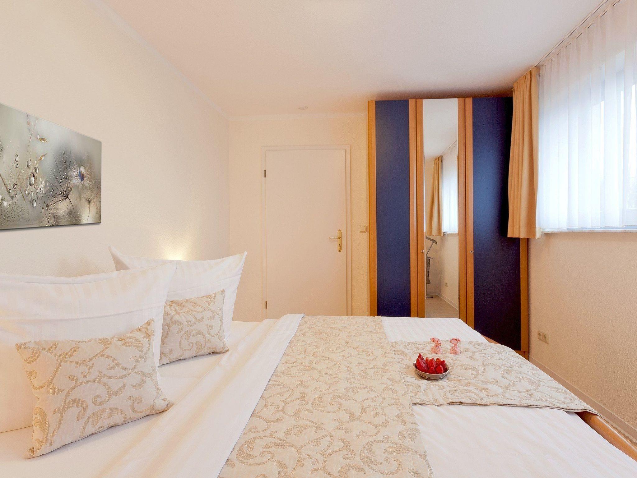 Zur Nachtruhe lassen Sie sich in das bequeme Doppelbett (180 x 200cm / zwei getrennte Matratzen) fallen und starten gut erholt in den nächsten Urlaubstag. Damit Sie Ihre wohlverdiente Urlaubszeit bereits am Anreisetag in vollen Zügen genießen können, haben wir das Bett für Sie und das für Ihre lieben Mitreisenden bereits bezogen und ein Duschtuch sowie ein kleines Handtuch bereitgelegt.
