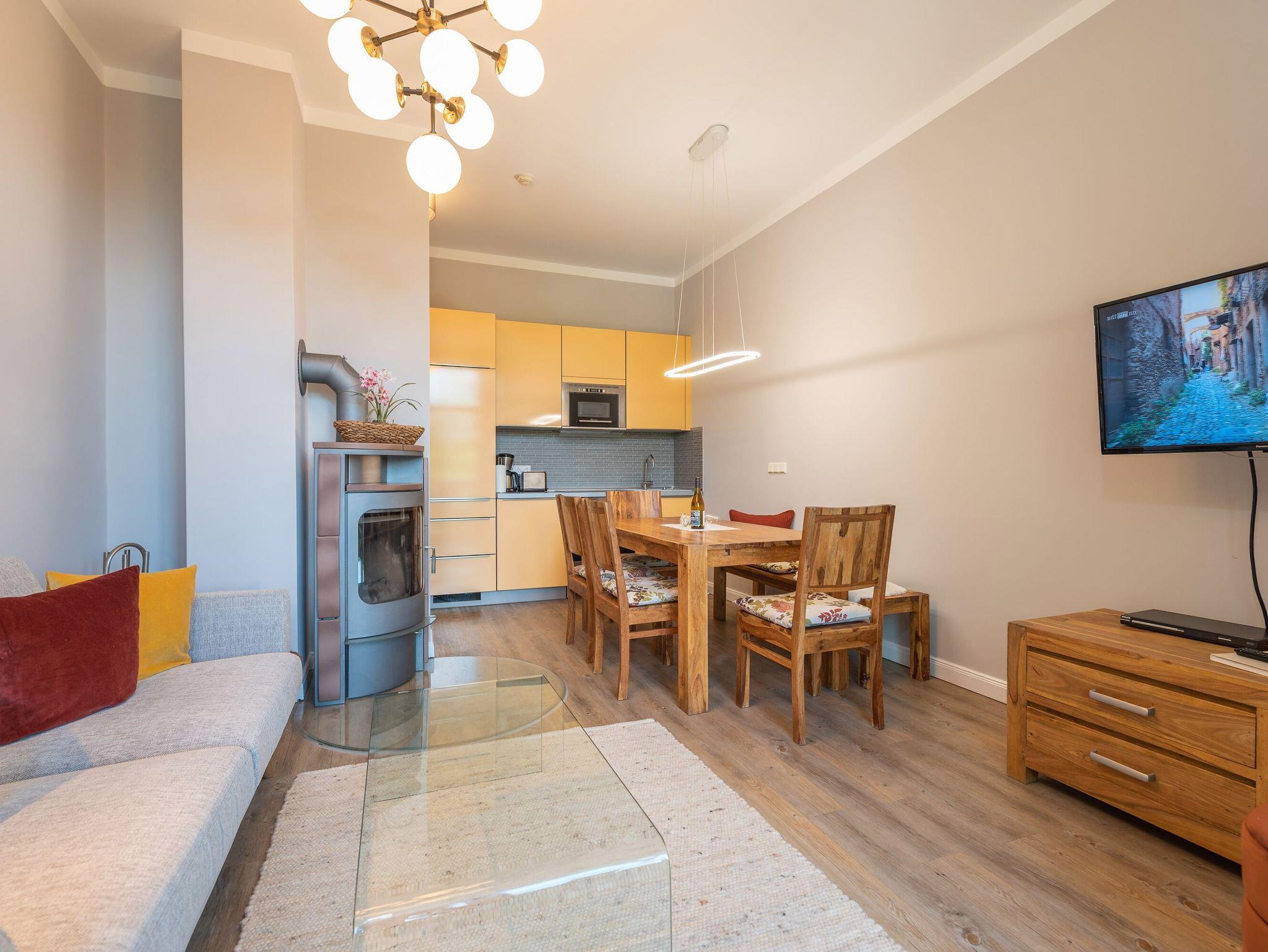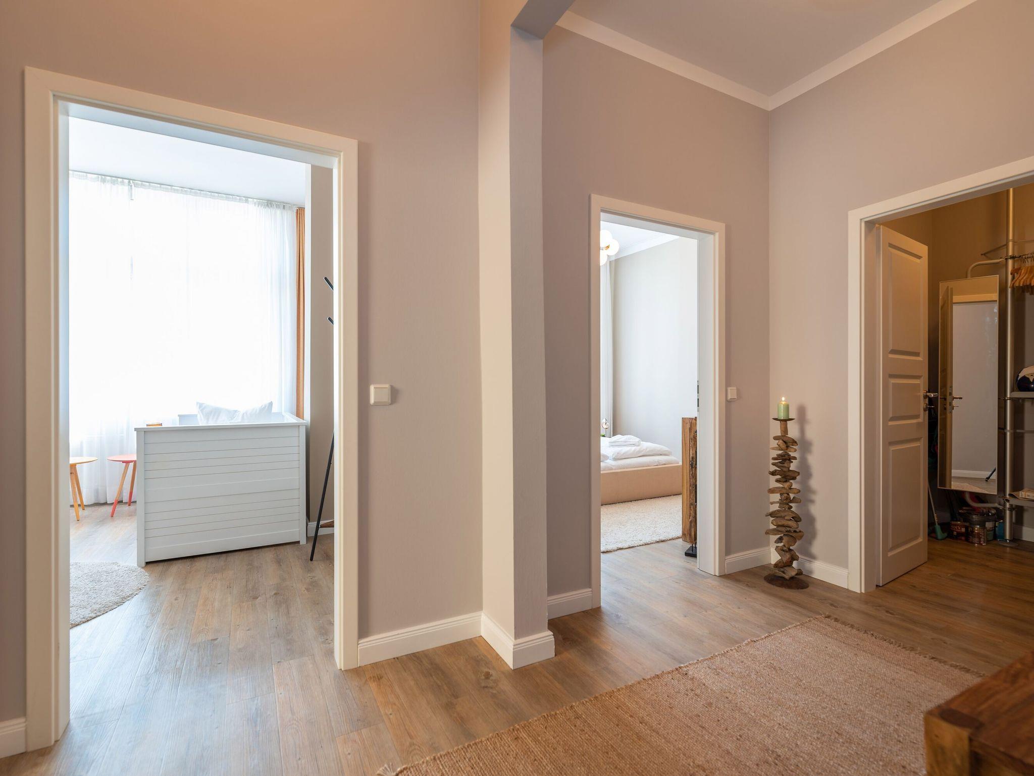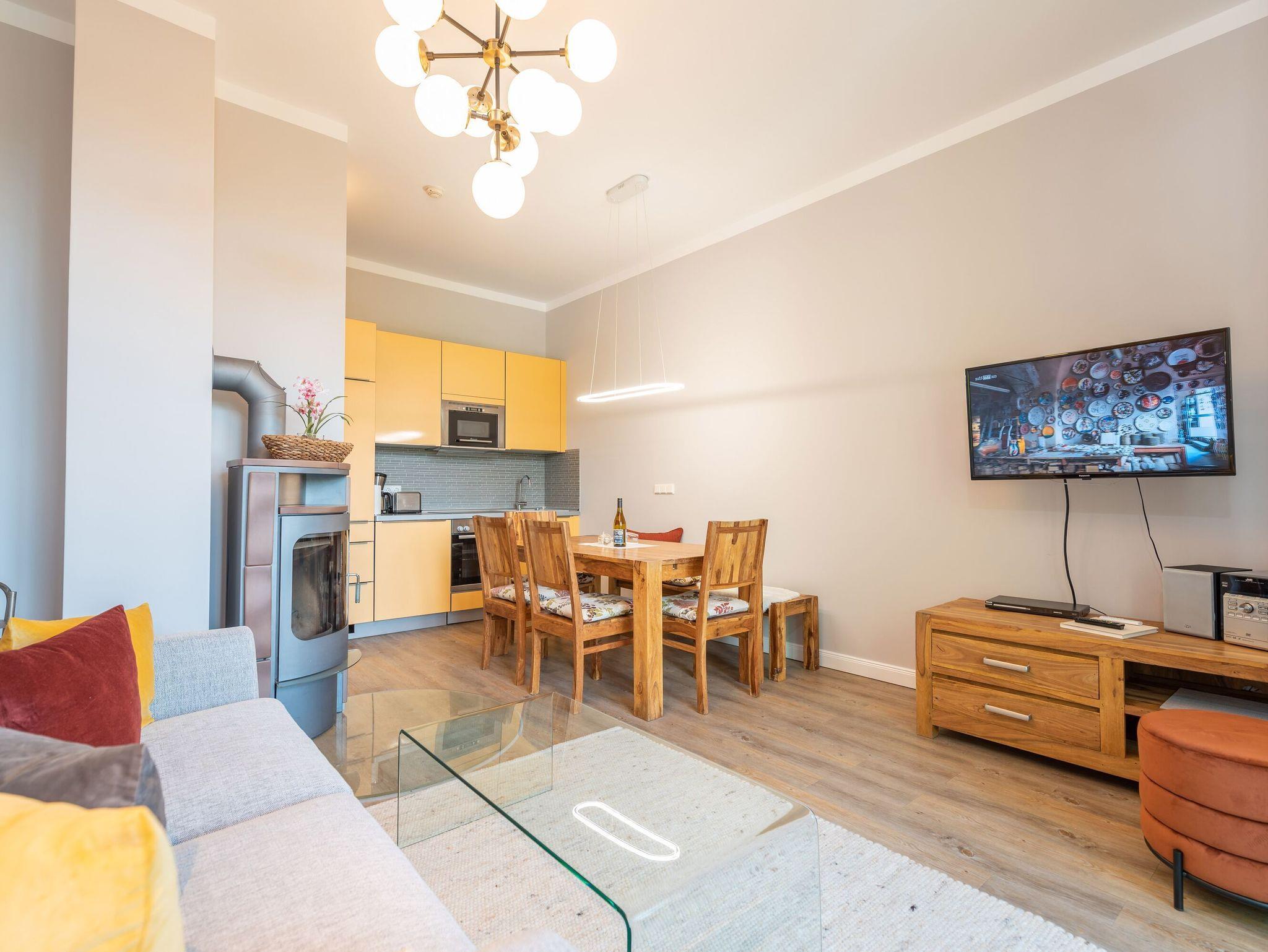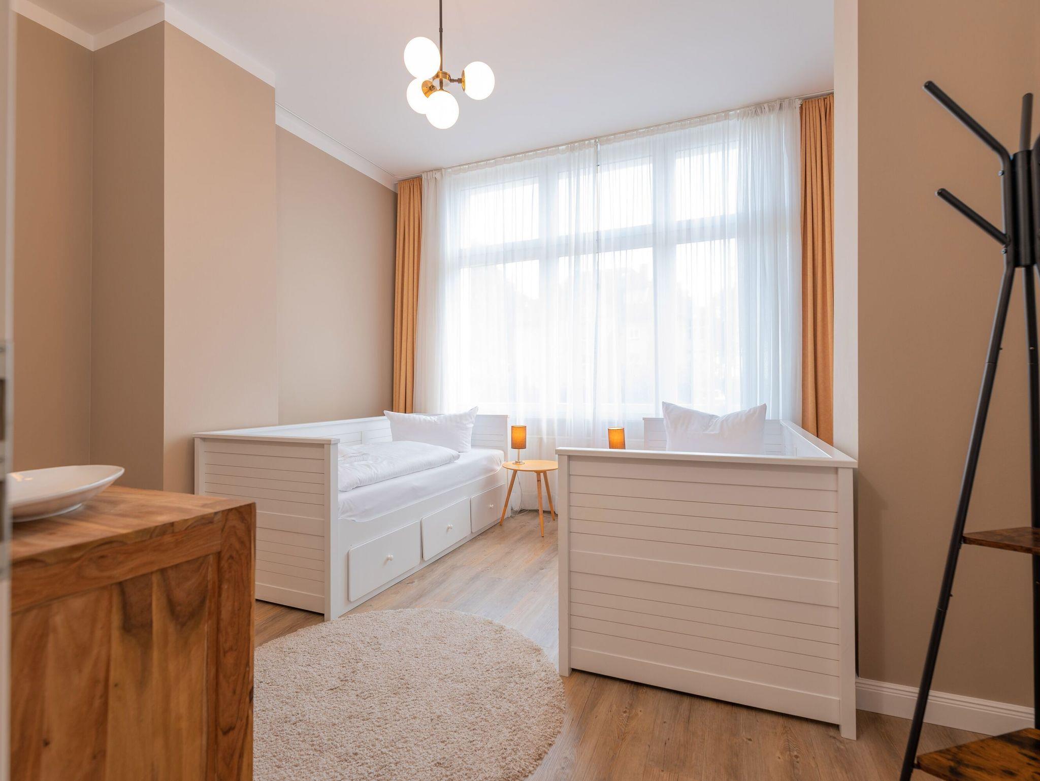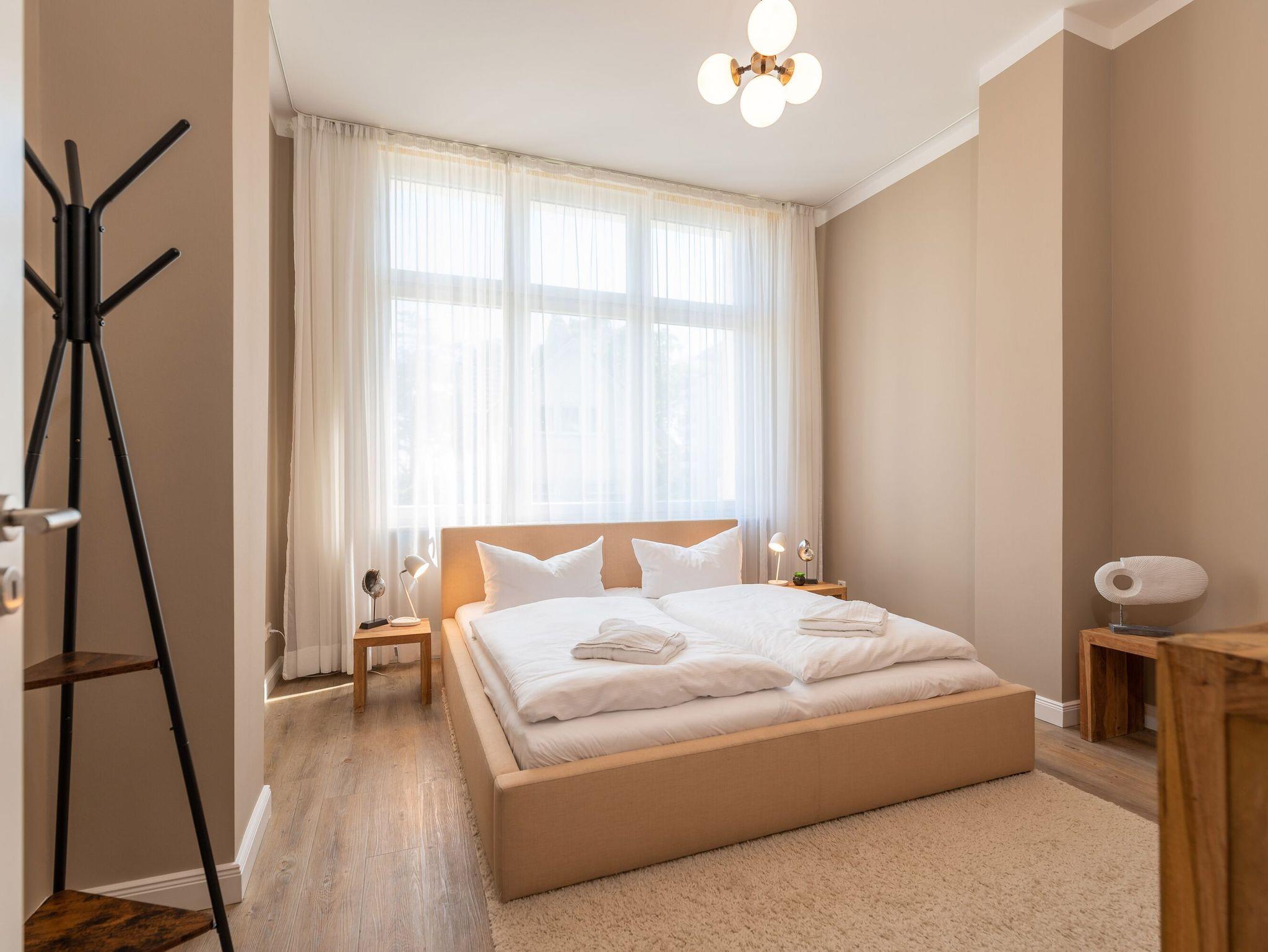Raum für Individualität! Moderne, helle Räumlichkeiten mit einer Brise Extravaganz erwarten Sie hier im Hochparterre der Villa Seestern. Geschmackvolle Möbel und ausgesuchte Stoffe dominieren dieses wunderschöne Appartement mit Wohnzimmer, integrierter und komplett ausgestatteter Küchenzeile, großzügigen Essbereich und zwei Schlafzimmern (1x Doppelbett, 1x getrennte Betten). Ein modernes Wohlfühlbad mit WC und Dusche ergänzt dies. Auf dem Südbalkon mit Blick ins Grüne genießt man nicht nur seinen Kaffee. Der Kamin verspricht besonders in der kalten Jahreszeit angenehme Stunden. Das Appartement ist buchbar für 3 Erwachsene, 1 Kind bis 15 Jahre und ein Kleinkind bis 2 Jahre. Für kleine Gäste kann ein Kinderreisebett und ein Kinderhochstuhl bereitgestellt werden. Am Haus steht ein PKW-Stellplatz zur Verfügung.