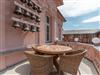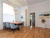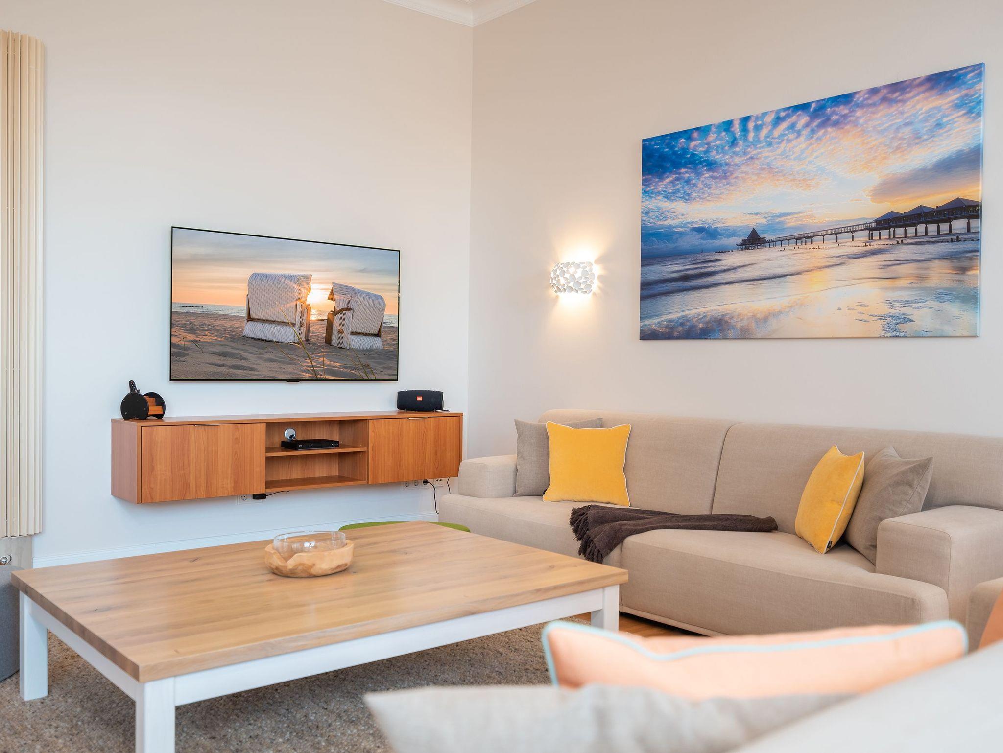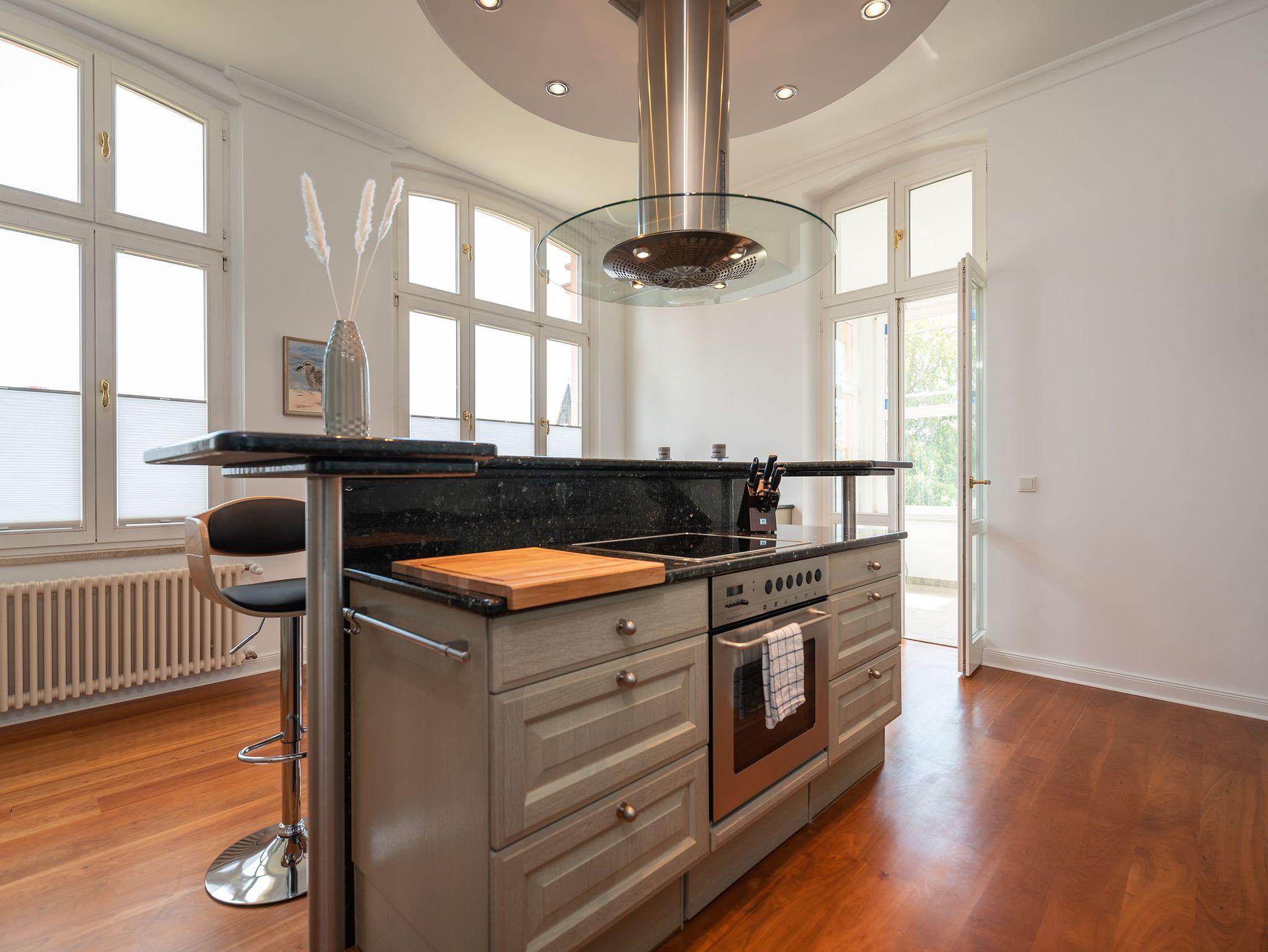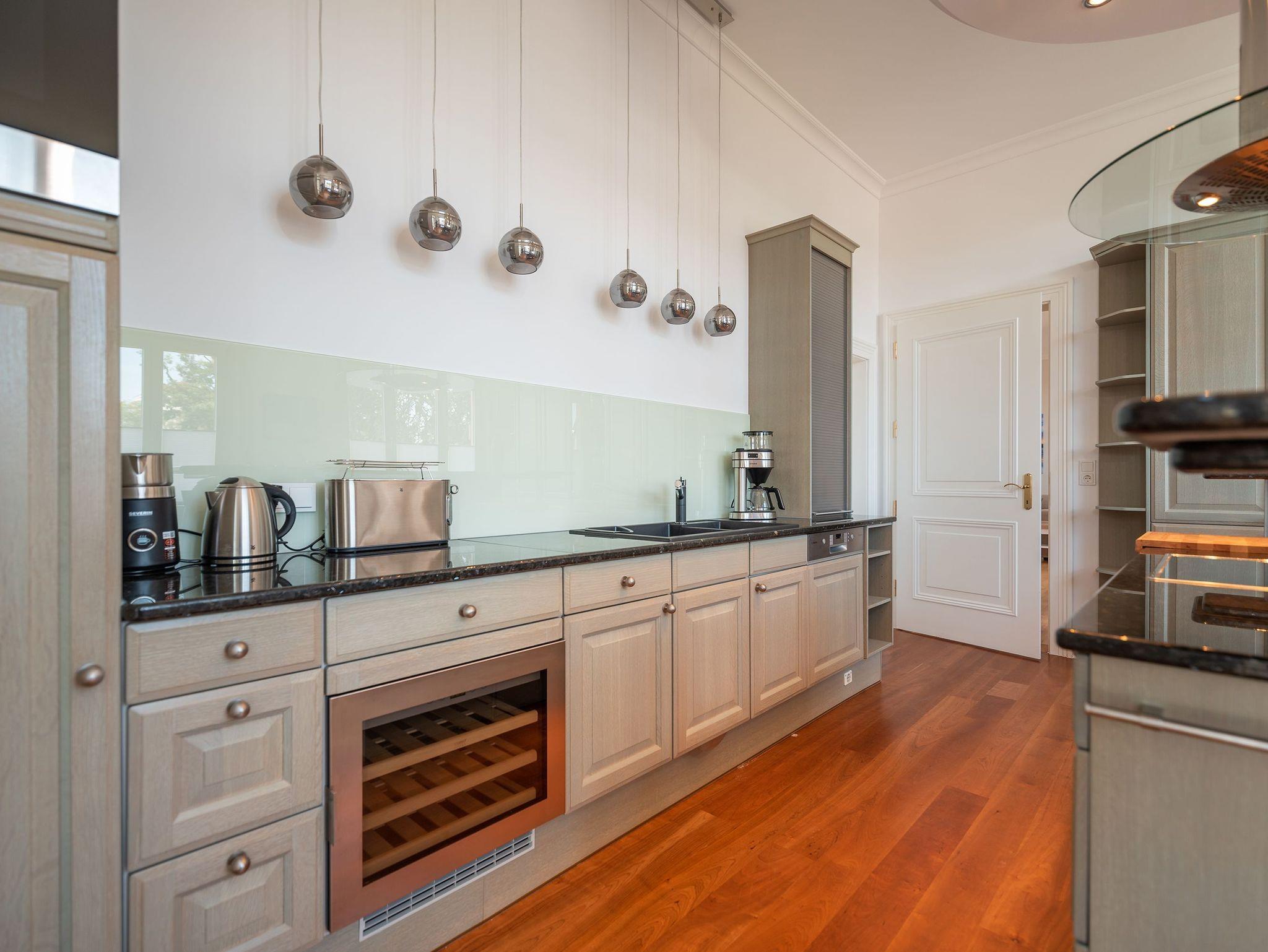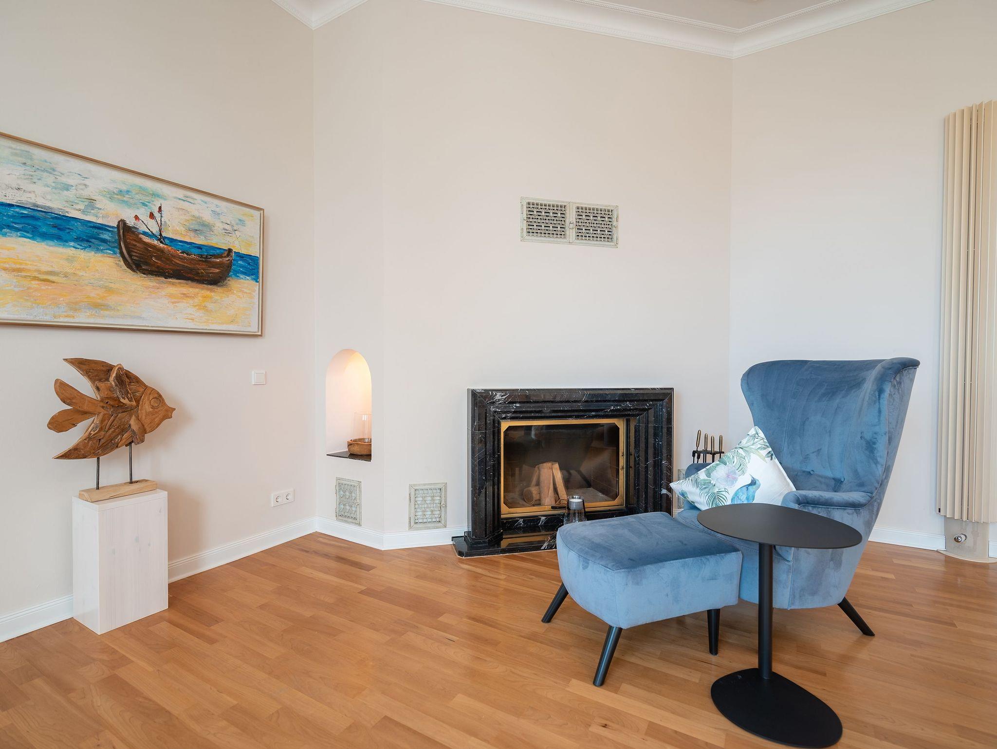 Das weitläufige Wohnzimmer empfängt seine Gäste mit einem Kamin aus schwarzem Marmor, einer gemütlichen Wohnlandschaft mit großem Flatscreen-TV und einem großen Esstisch an dem bequem 6 Personen Platz finden. Das Charisma der kaiserlichen Architektur wird durch wunderschöne Stuck-Elemente, stilechte Kassetten-Türen und hochwertige Materialien auch im Inneren des Apartments weiter geführt.