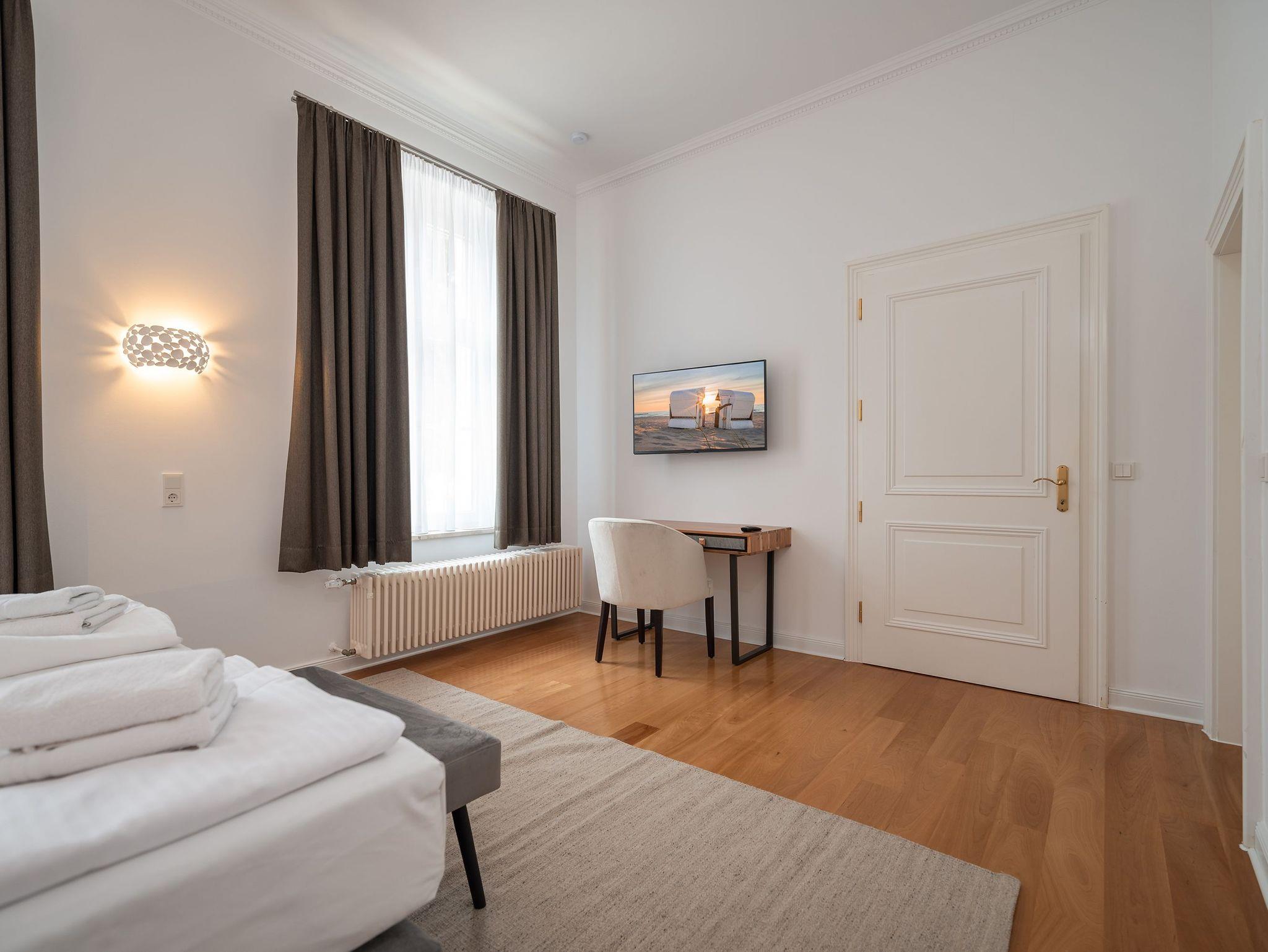 Das herrschaftliche Appartement Nr. 03 Doctores Beletage liegt in der ersten Etage der wunderschönen denkmalgeschützten Villa Doctores. Mit seinem eleganten Interior Design verbindet die Wohnung meisterlich den wilhelminischen Glanz der Kaiserbäder-Architektur mit modernen, schlichten Formen und Wohnkomfort auf höchstem Niveau.*