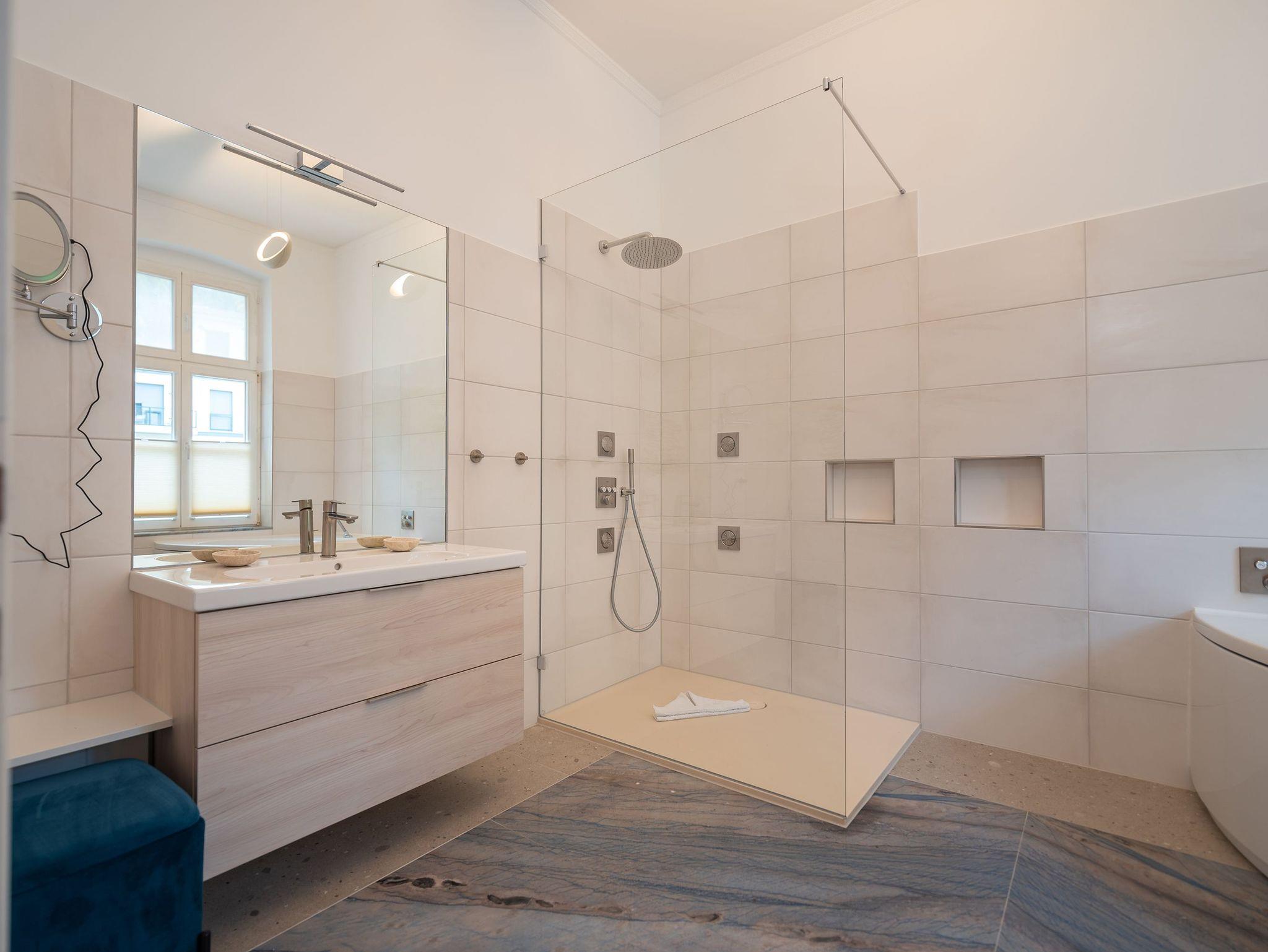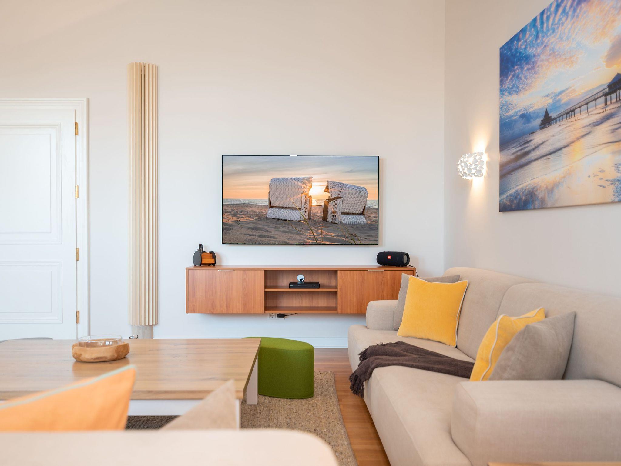 Das Appartment verfügt über zwei Schlafzimmer und ist für eine Belegung von 4 Personen geeignet. (+1 Aufbettung auf dem Schlafsofa für Kind max.14 J.). Der Master-Bedroom hat nicht nur ein komfortables Boxspringbett und einen wandmontierten Flatscreen-TV, sondern auch einen eigenen Ankleideraum mit eleganten Schrankeinbauten sowie ein Badezimmer en Suite. Das Badezimmer sorgt mit viel Platz, einem Doppelwaschtisch und einer ausladenden, begehbaren Dusche für echtes Wellness-Gefühl.