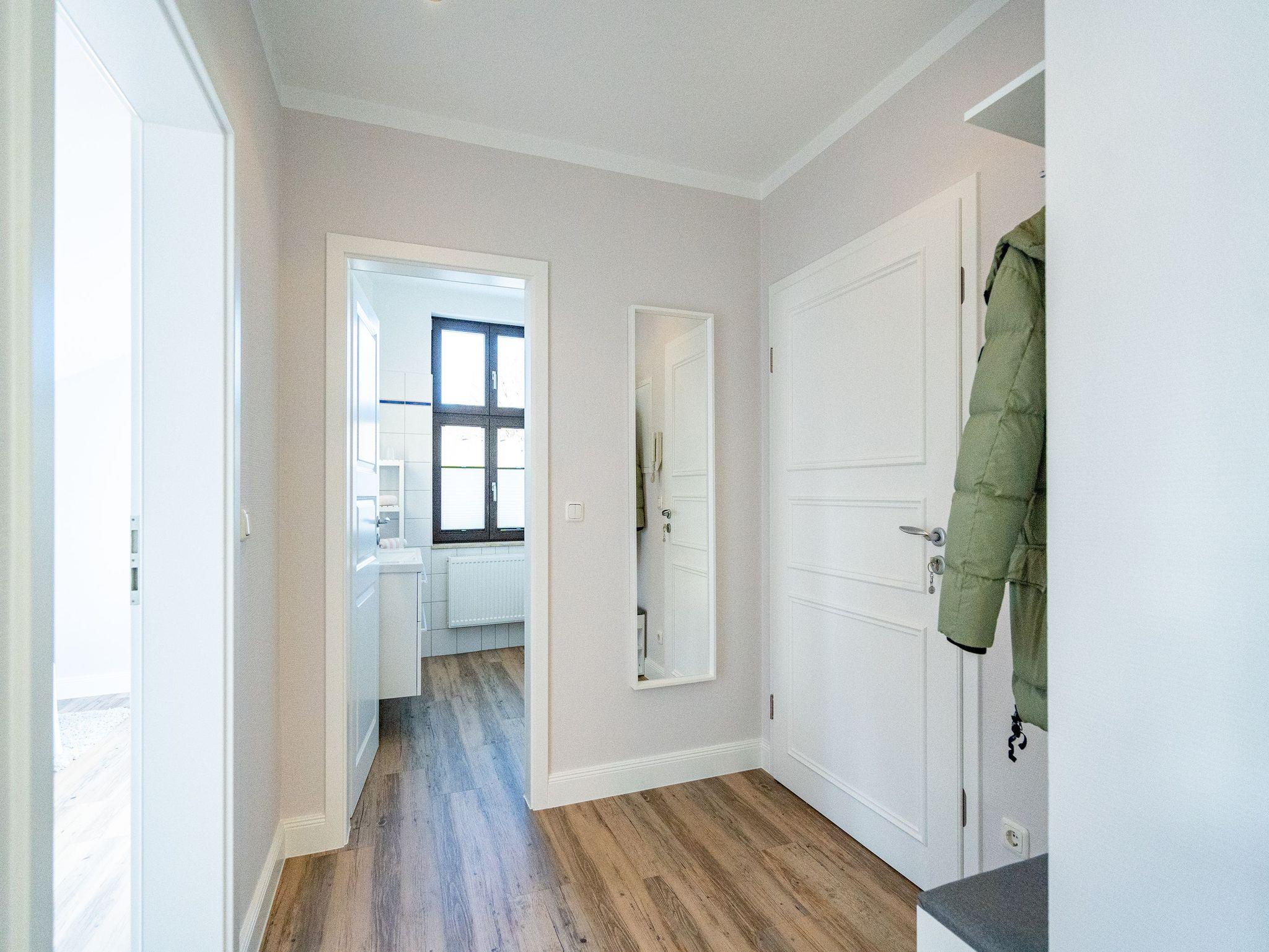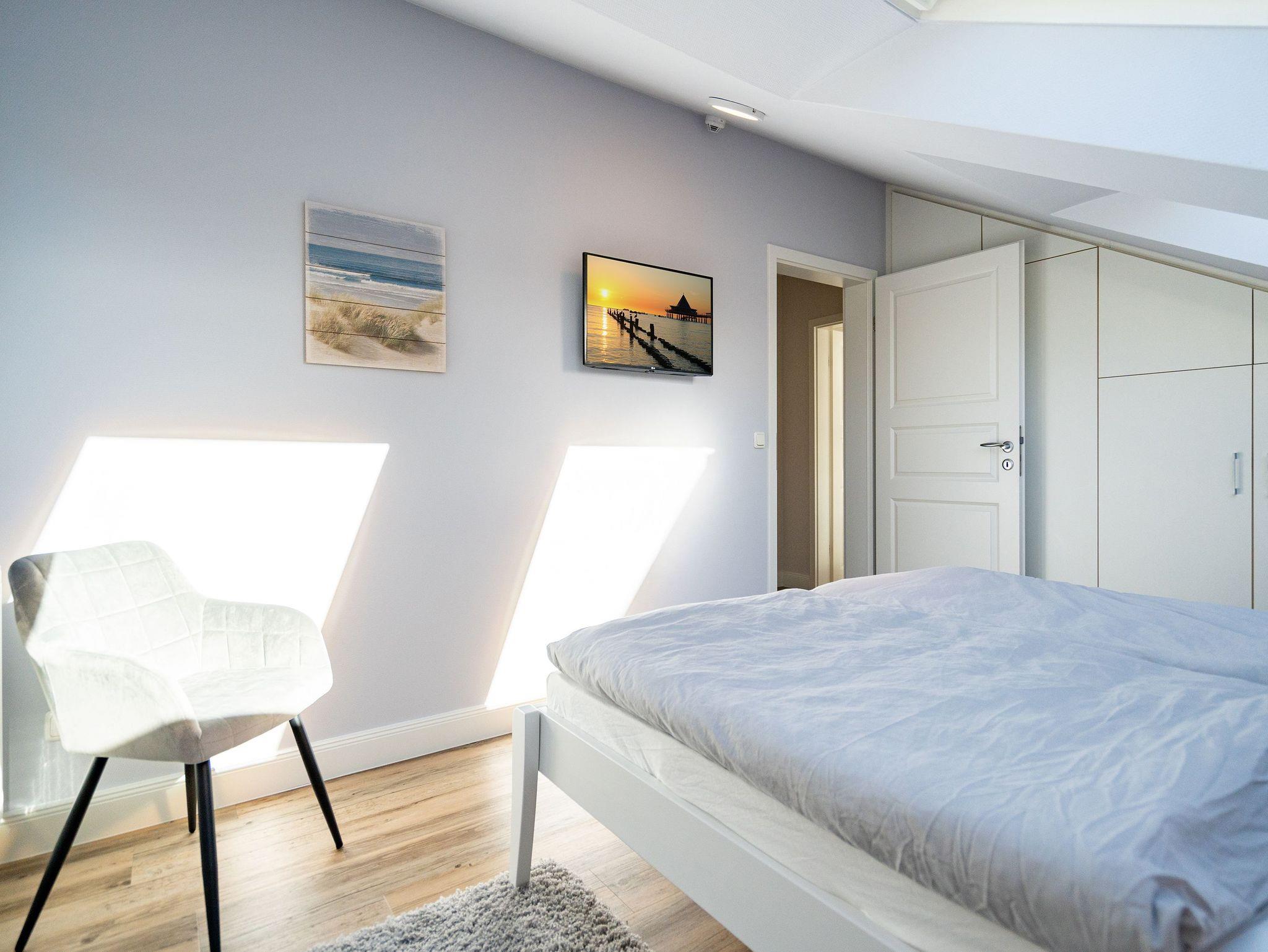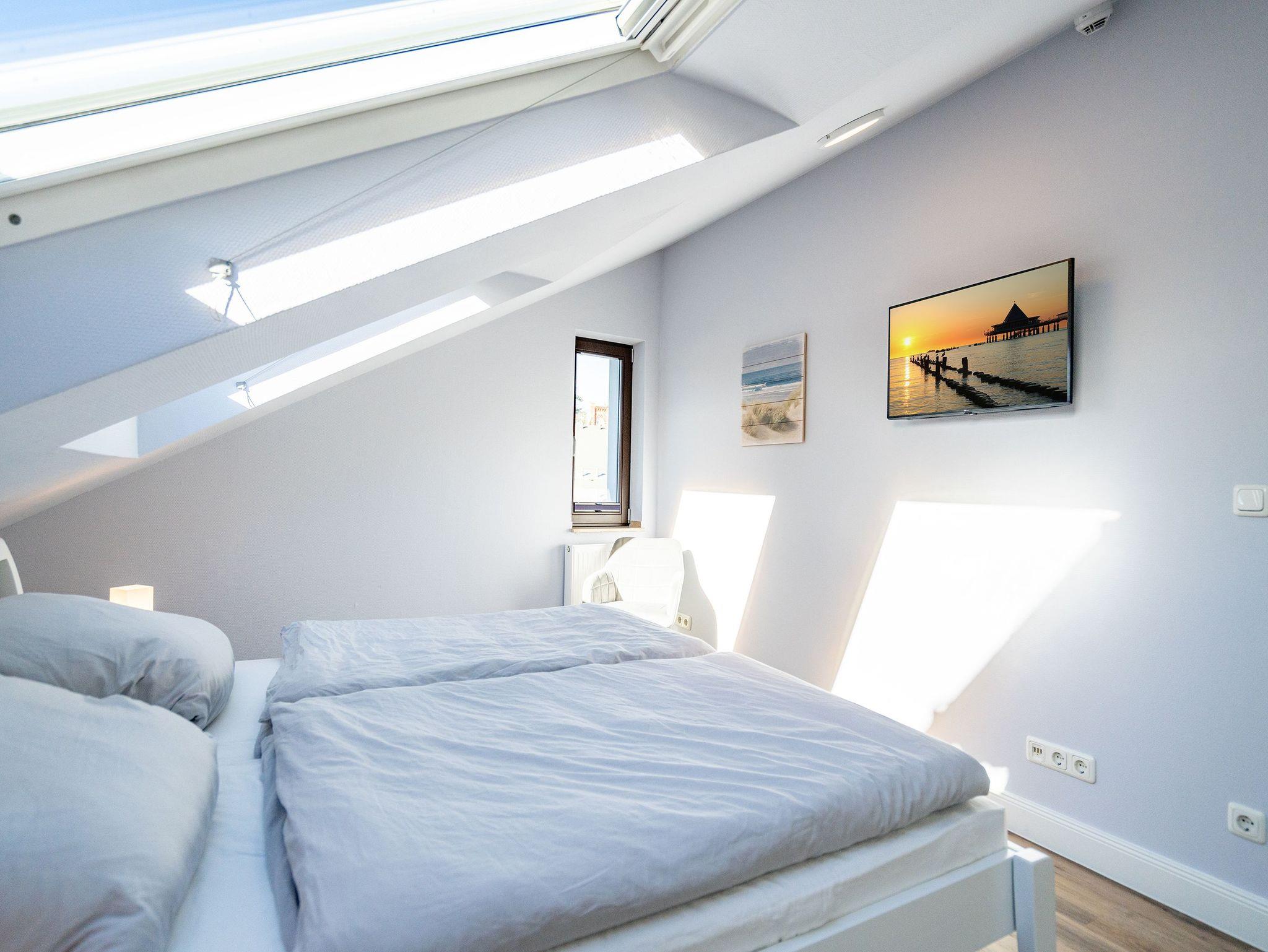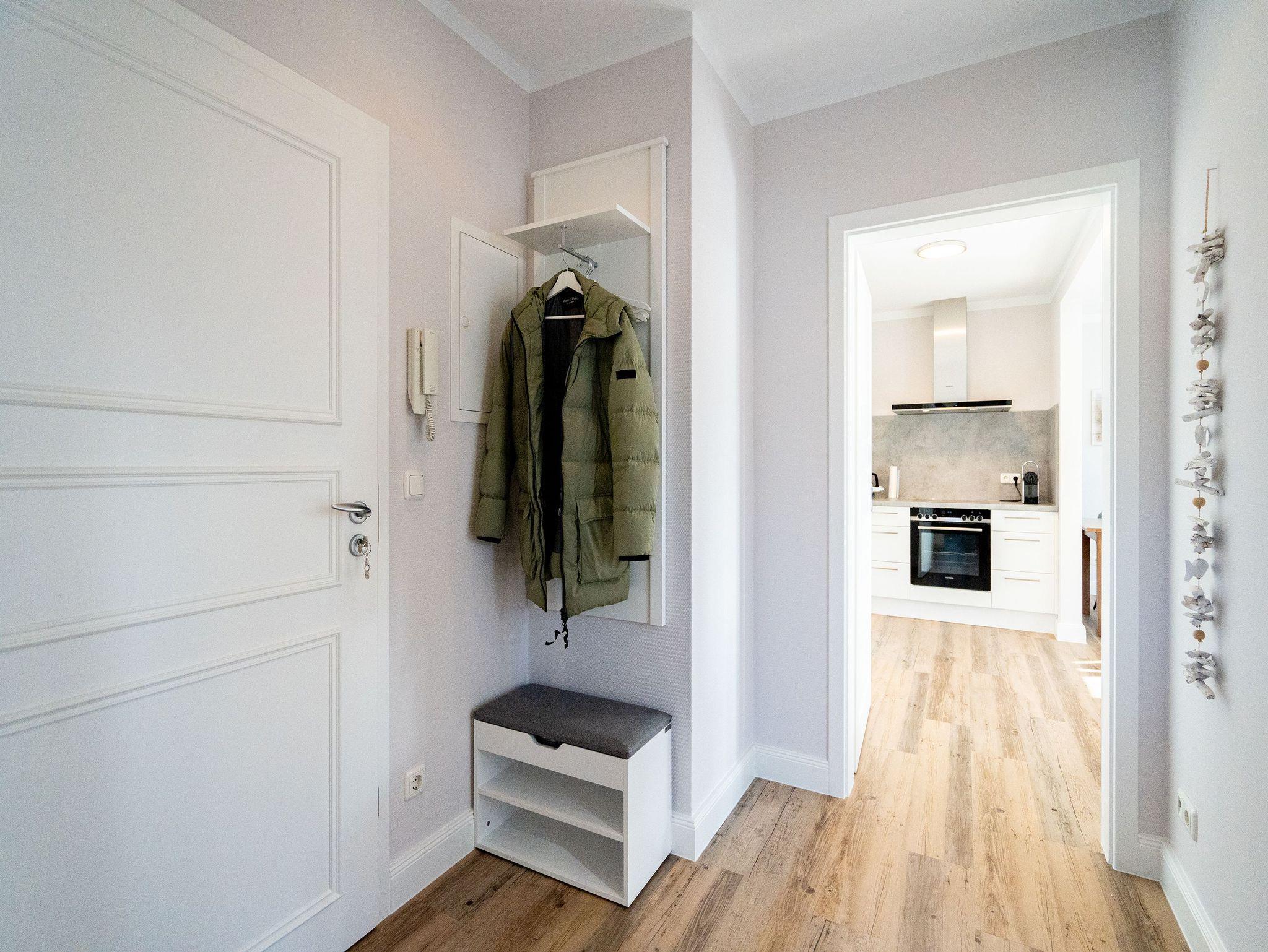 Die helle, lichtdurchflutete 2-Raum-Ferienwohnung (58 qm max. 4 Personen) empfängt Sie in der 2. Etage des Hauses. Für Ihren Komfort ist es komplett ausgestattet und verfügt über einen großzügigen Wohnbereich mit Flat-TV, Radio mit Bluetooth-Box sowie integrierter Küchenzeile und separatem Essplatz. Das Schlafzimmer bietet Platz für 2 Personen und verfügt über ein Doppelbett, für die 3. und 4. Person bietet die Couch mit Schlaffunktion im Wohnzimmer Platz. Ergänzt wird die Wohnung durch ein Bad mit Dusche und WC. Auf Wunsch stellen wir für unsere kleinen Gäste ein Kinderreisebett (ohne zusätzliche Matratze [&] Bettzeug) und einen Kinderhochstuhl ( gegen einen Aufpreis) zur Verfügung. Für Ihren Komfort sind die Betten bei der Anreise bezogen und Handtücher liegen bereit (Erstausstattung). Am Haus kann ein kleiner Gartenanteil mit Terrasse und Strandkorb genutzt werden. Für den Tag am Meer steht Ihnen als besonderes Bonbon von Mitte Mai bis Ende September (je nach Witterung) ein Strandkorb am Strand kostenlos zur Verfügung. Das WLAN-Netz ist kostenfrei nutzbar.