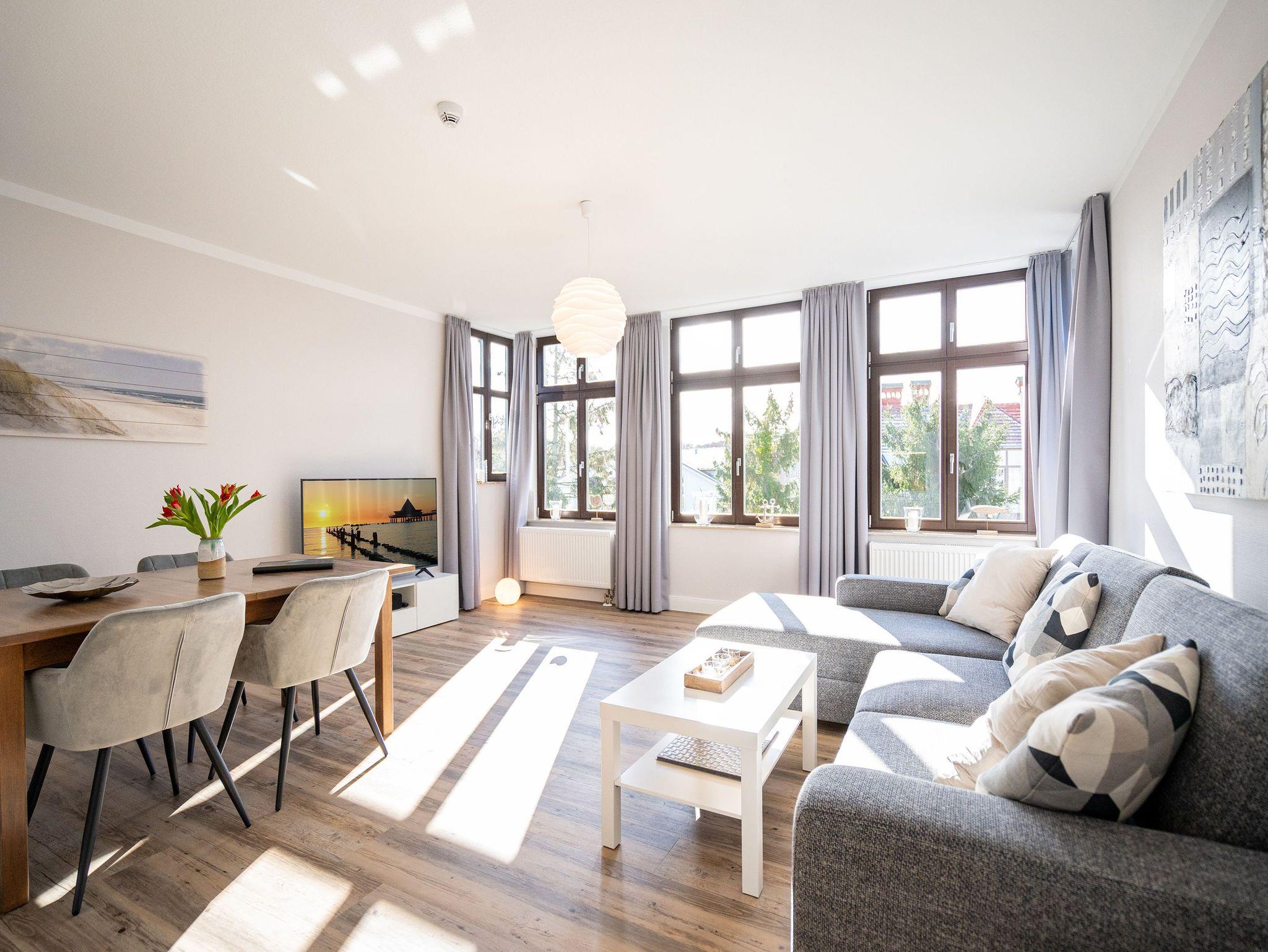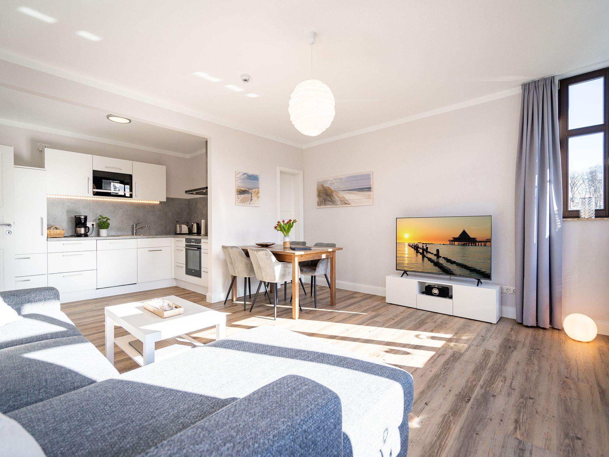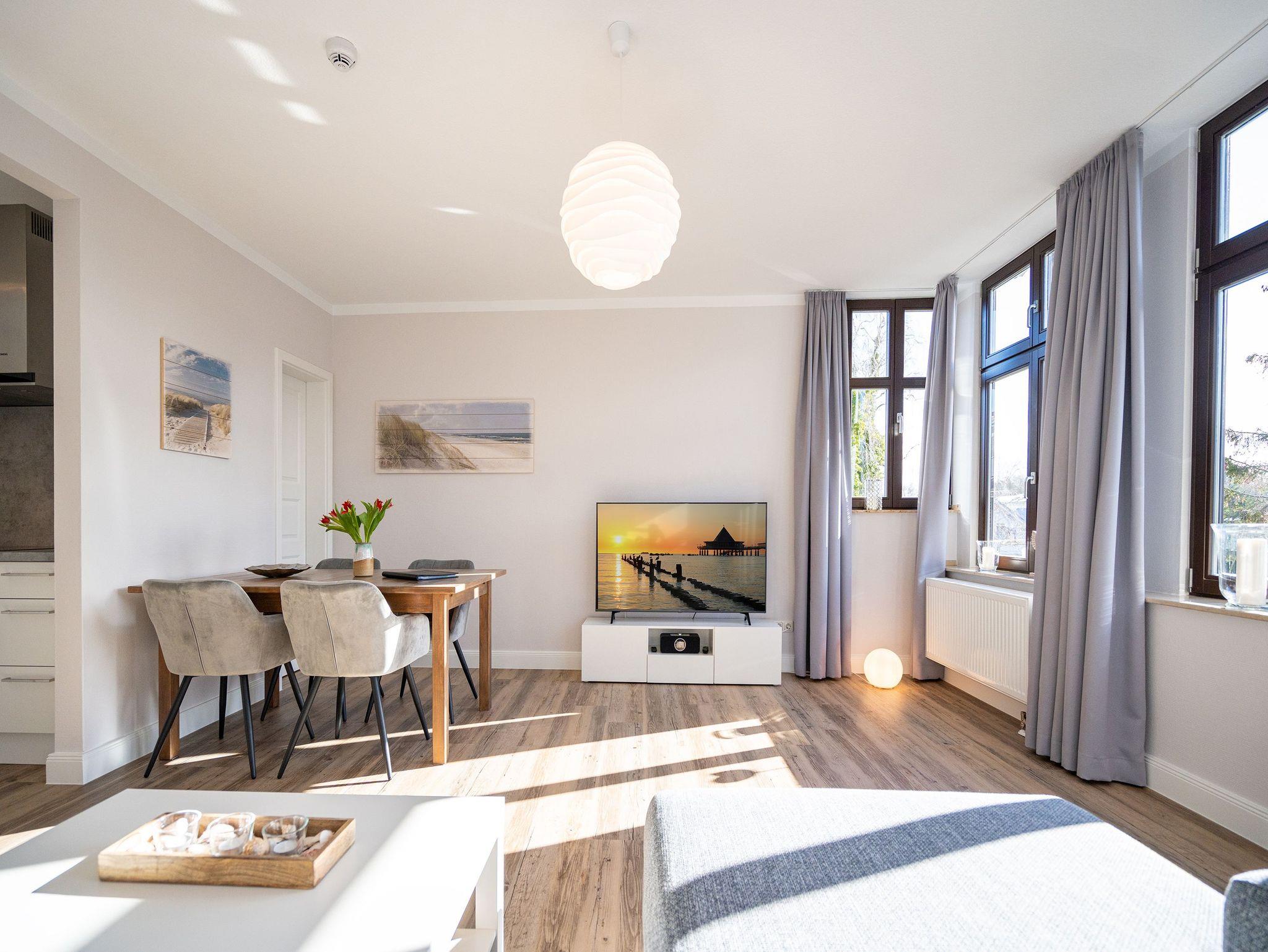 Die helle, lichtdurchflutete 2-Raum-Ferienwohnung (58 qm max. 4 Personen) empfängt Sie in der 2. Etage des Hauses. Für Ihren Komfort ist es komplett ausgestattet und verfügt über einen großzügigen Wohnbereich mit Flat-TV, Radio mit Bluetooth-Box sowie integrierter Küchenzeile und separatem Essplatz. Das Schlafzimmer bietet Platz für 2 Personen und verfügt über ein Doppelbett, für die 3. und 4. Person bietet die Couch mit Schlaffunktion im Wohnzimmer Platz. Ergänzt wird die Wohnung durch ein Bad mit Dusche und WC. Auf Wunsch stellen wir für unsere kleinen Gäste ein Kinderreisebett (ohne zusätzliche Matratze [&] Bettzeug) und einen Kinderhochstuhl ( gegen einen Aufpreis) zur Verfügung. Für Ihren Komfort sind die Betten bei der Anreise bezogen und Handtücher liegen bereit (Erstausstattung). Am Haus kann ein kleiner Gartenanteil mit Terrasse und Strandkorb genutzt werden. Für den Tag am Meer steht Ihnen als besonderes Bonbon von Mitte Mai bis Ende September (je nach Witterung) ein Strandkorb am Strand kostenlos zur Verfügung. Das WLAN-Netz ist kostenfrei nutzbar.
