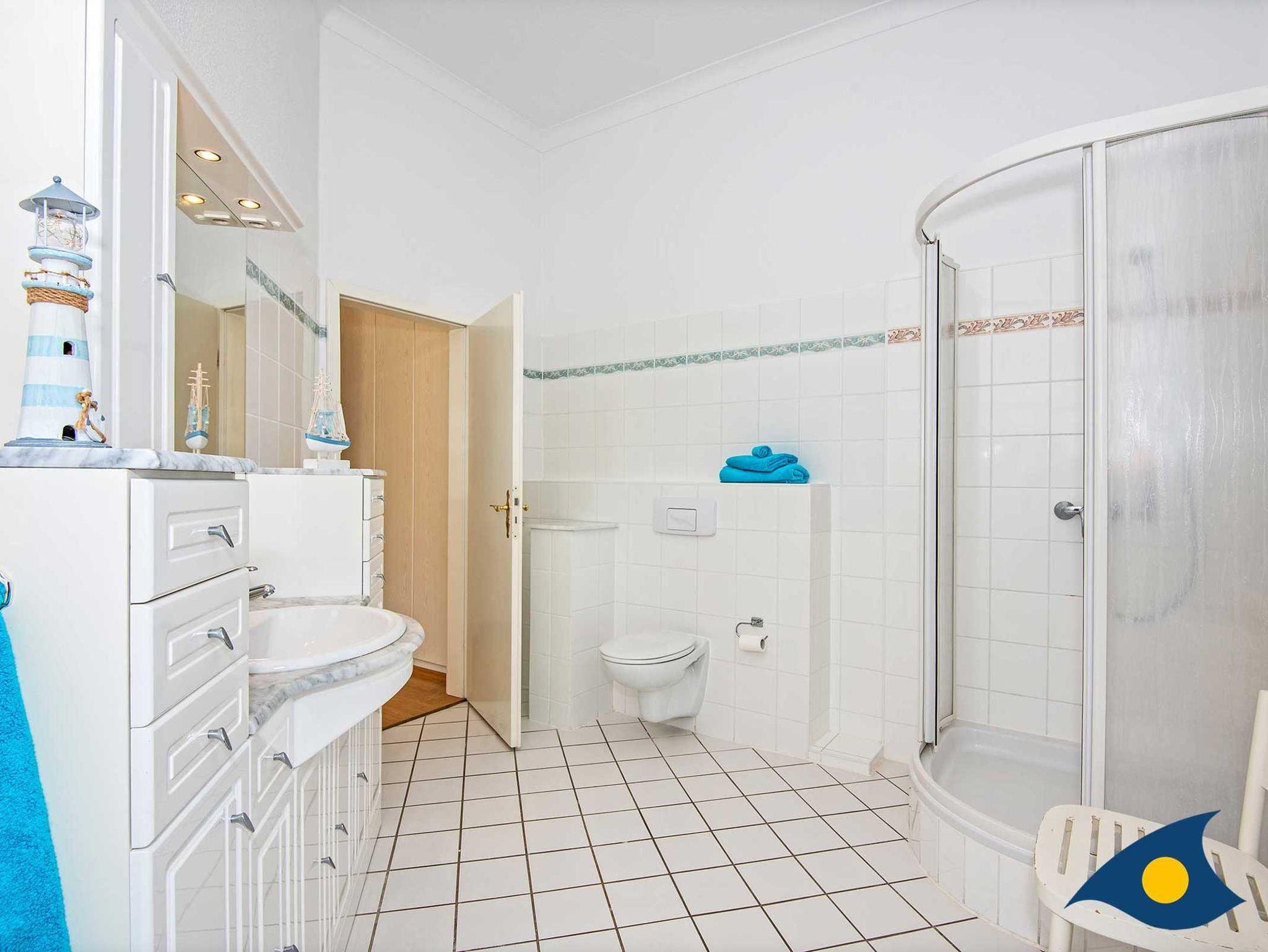 Das Tageslichtbad mit WC und Dusche ist sehr großzügig geschnitten.