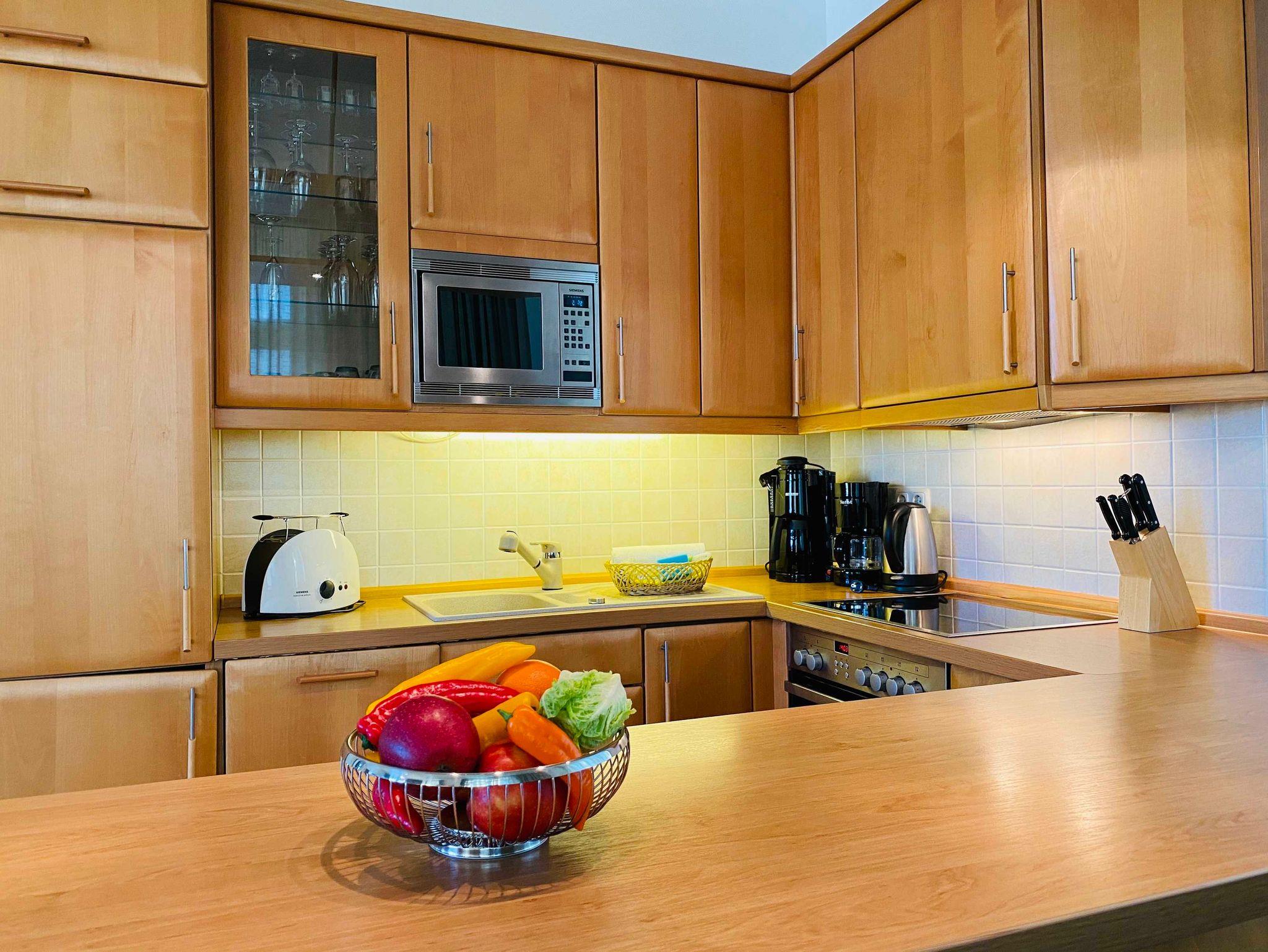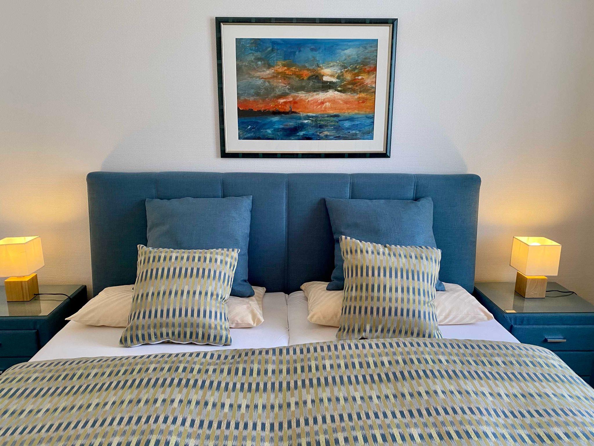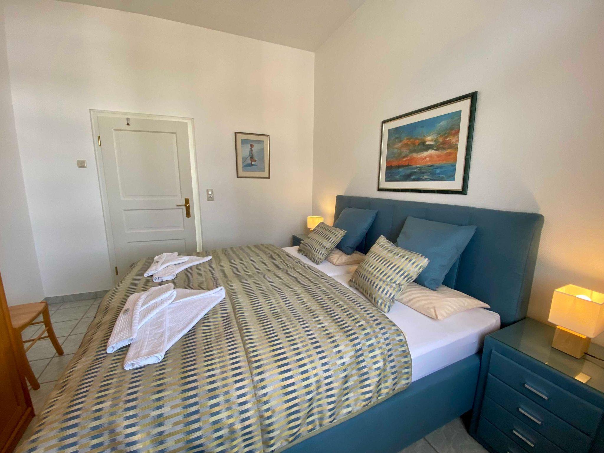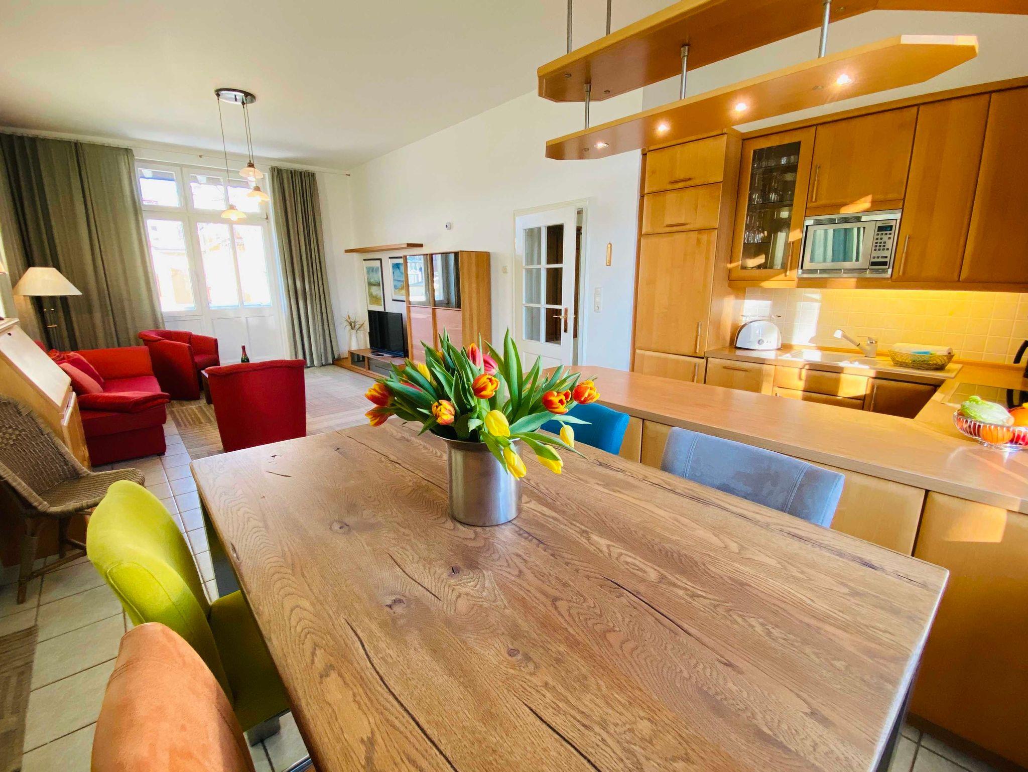 Die komfortable Zweiraumwohnung im 2.OG hat einen schönen Wohn- Essbereich mit Couchecke, TV, Esstisch und Komplettküche. Das Schlafzimmer ist mit einem gemütliches Boxspringbett und Kleiderschrank ausgstattet. Die Ferienwohnung hat ein Badezimmer mit Dusche. Die Wohnung hat 2 wunderschönen Balkonen: einer Richtung Süden mit Strandkorb, der zweite kleinere in Richtung Westen/Promenade/See.