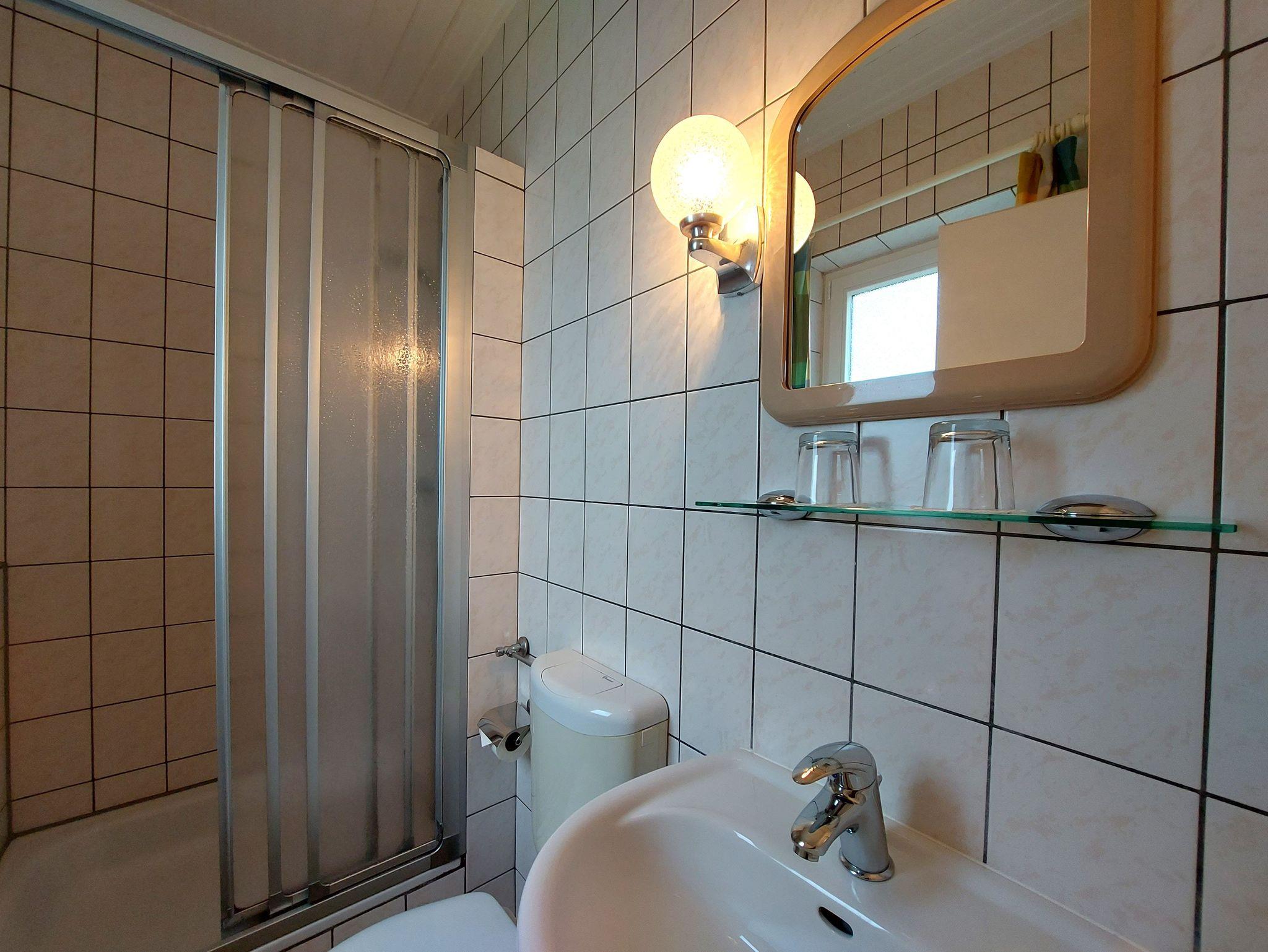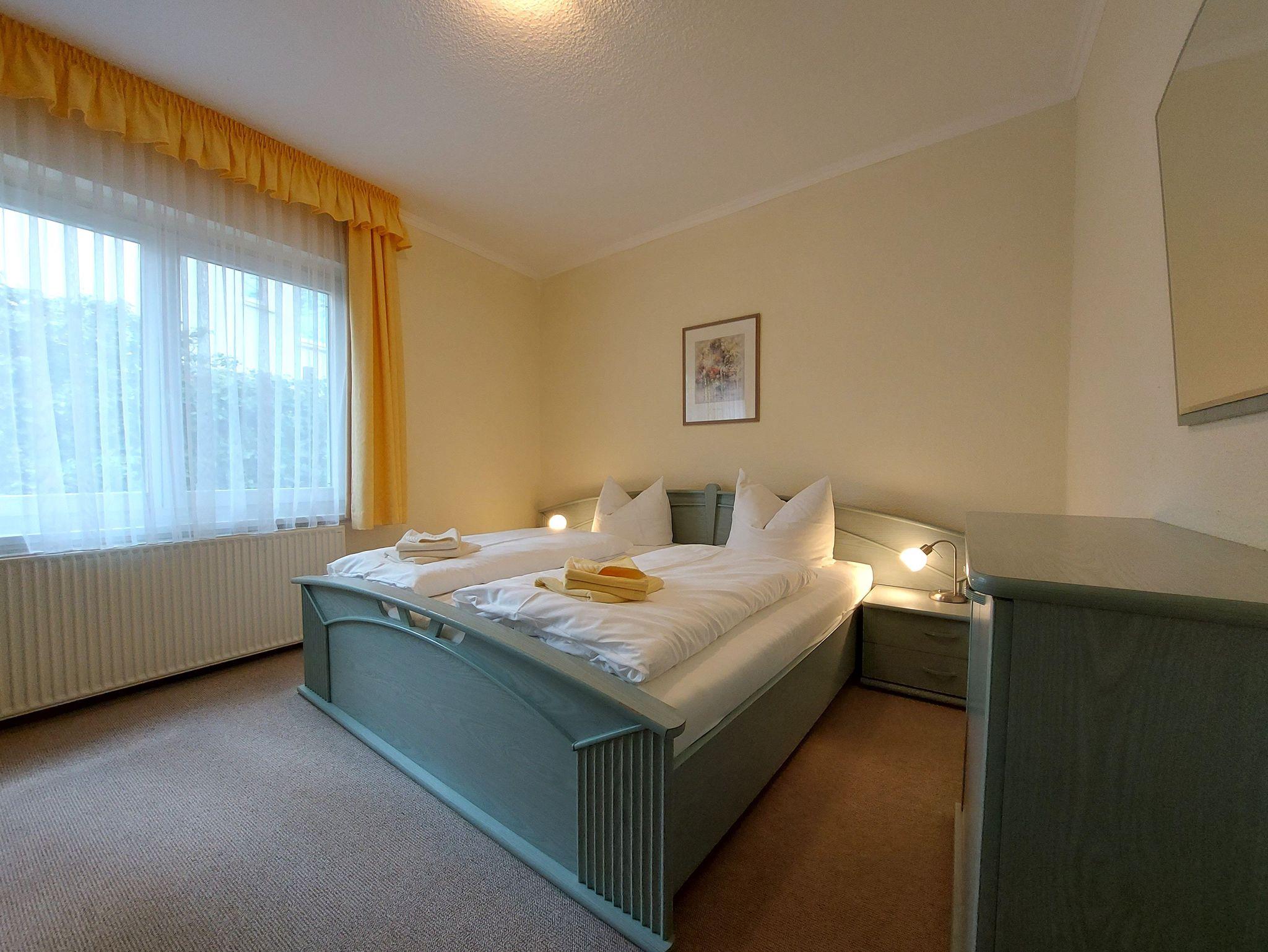 Das separate Schlafzimmer ist mit einem gemütlichen Doppelbett, Kleiderschrank und Kommode ausgestattet. Das Badezimmer verfügt über eine Dusche.
