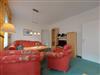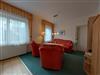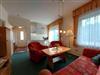Die Ferienwohnung 1 befindet sich im Erdgeschoss des Hauses im Anbau. Die Wohnung ist jedoch nicht stufenlos erreichbar. Sie teilt sich auf in ein Wohnzimmer mit offener Pantry-Küche und Sitzbereich. Im Wohnzimmer befindet sich eine gemütliche Couch, ein Sessel und ein Flachbildfernseher. Der Sitzbereich dient auch als Essbereich mit einem höhenverstellbaren Tisch. Die Pantry-Küche ist ausgestattet mit 2-Platten-Herd, Kühlschrank mit Gefriermöglichkeit, Mikrowelle, Kaffeemaschine, Wasserkocher und Toaster.