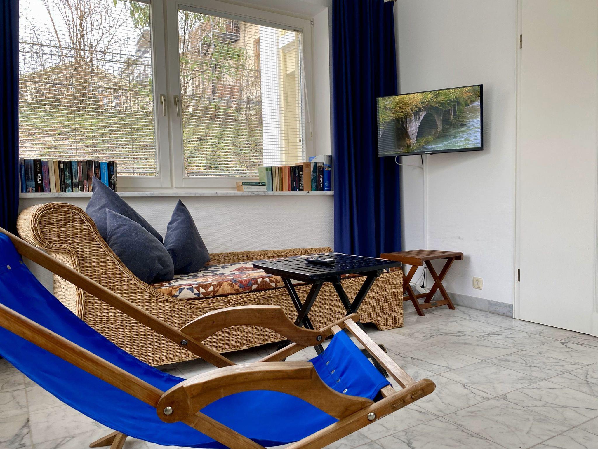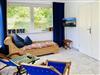 Der Wohnbereich hat eine Sitzecke mit TV. Vom Wohnzimmer aus gelangen Sie zur offener Komplettküche mit großem Esstisch.