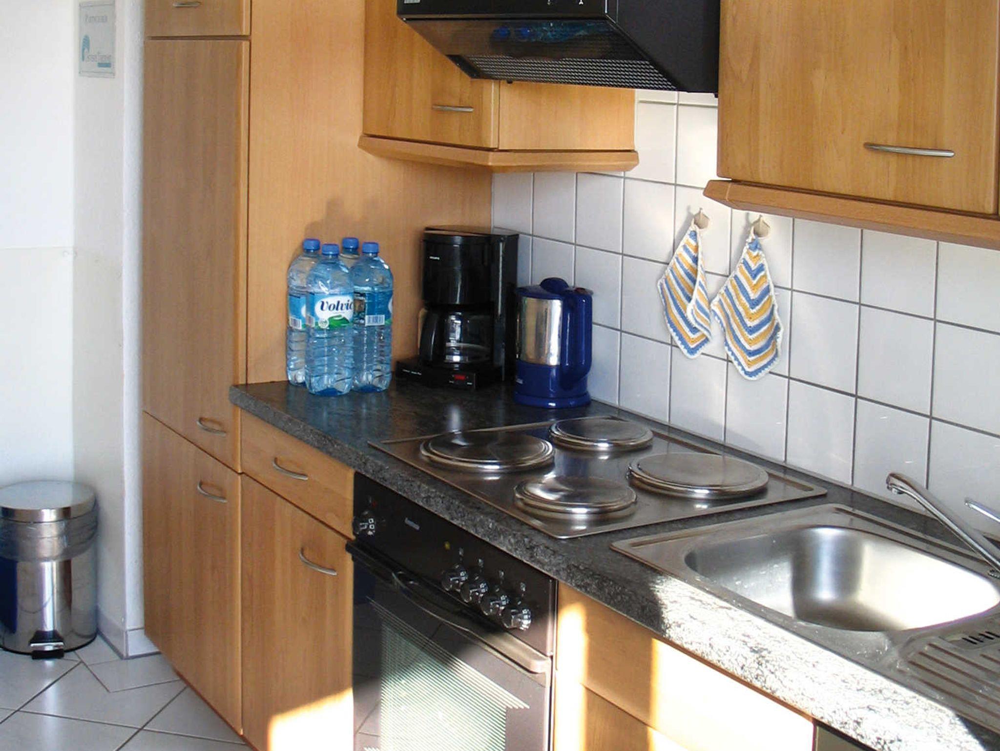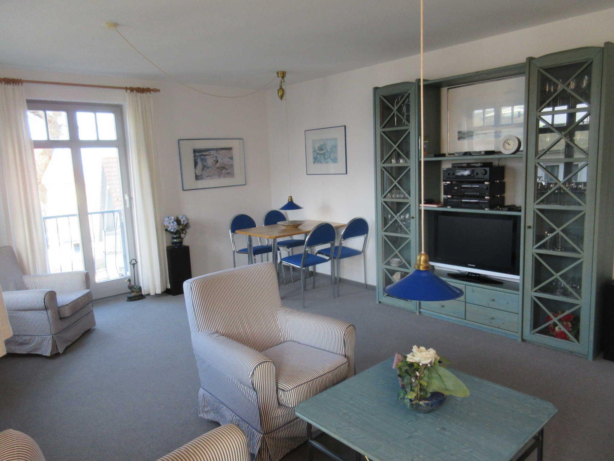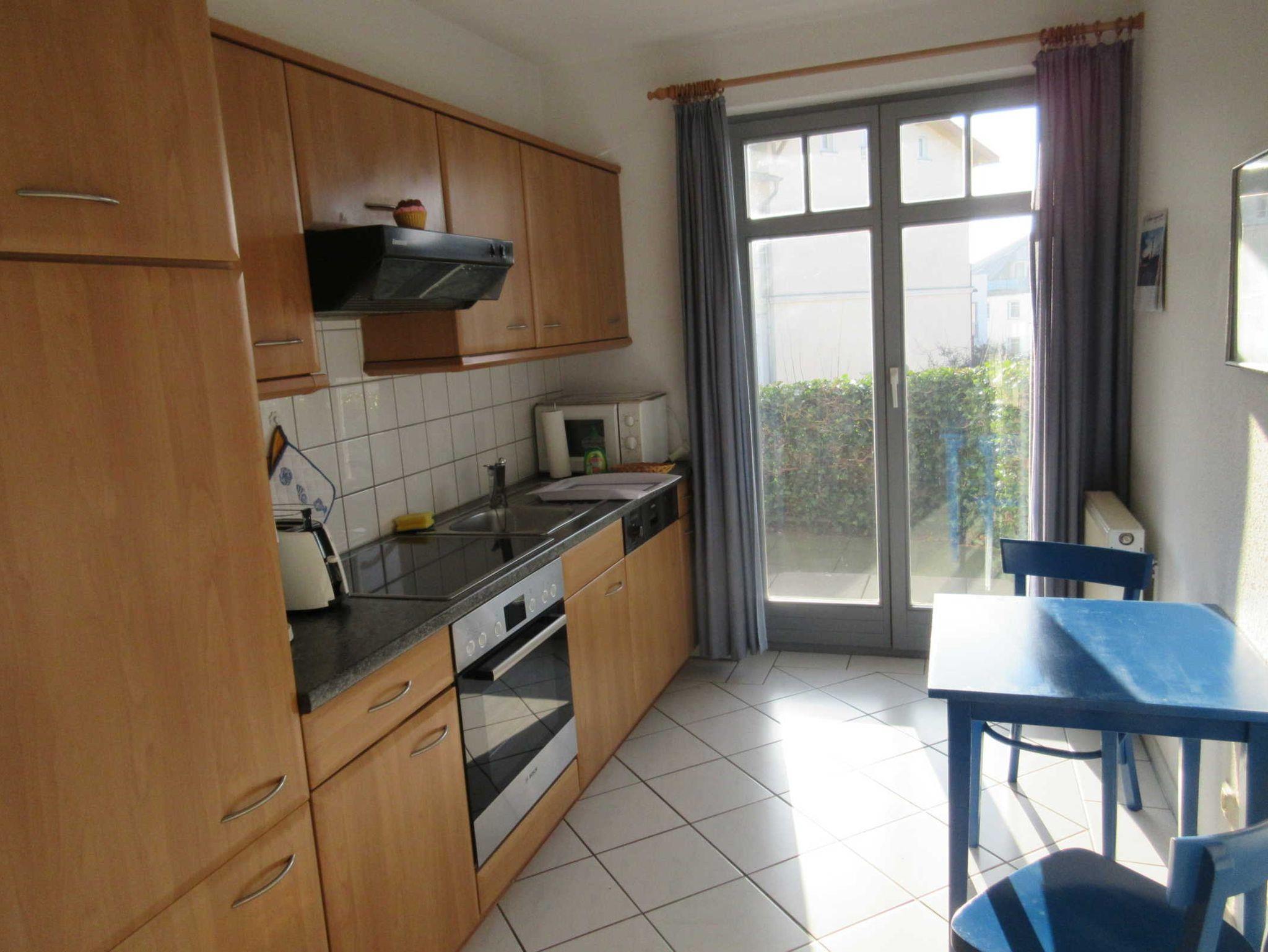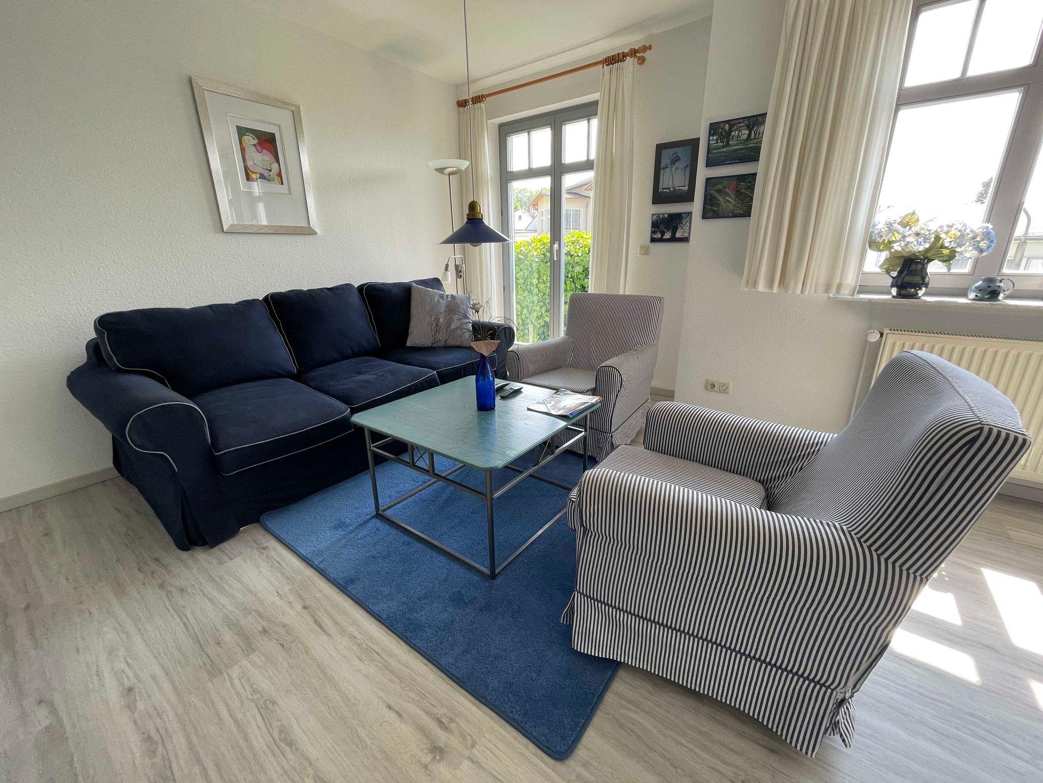Das großzügig, modern und komfortabel eingerichtete 3-Raum-Appartement im Erdgeschoß mit kompletter, separater Küche (Ceran-Kochfeld , Backofen, Geschirrspüler, hochwertiges Geschirr, Mikrowelle, etc.) ist für 4 Personen (Doppelbett im 1. Schlafraum & großes Etagenbett im 2. Schlafraum) sowie für zwei weitere Personen (Doppelschlafcouch) vorgesehen. Im Bad befinden sich Dusche und Badewanne/WC. Zur Ausstattung gehören eine große Terrasse zur Südseite mit Sitz-/Liegemöbeln sowie Grill (von dort ist teilweise seitlicher Meerblick möglich), Smart-TV, Telefon, W-LAN.