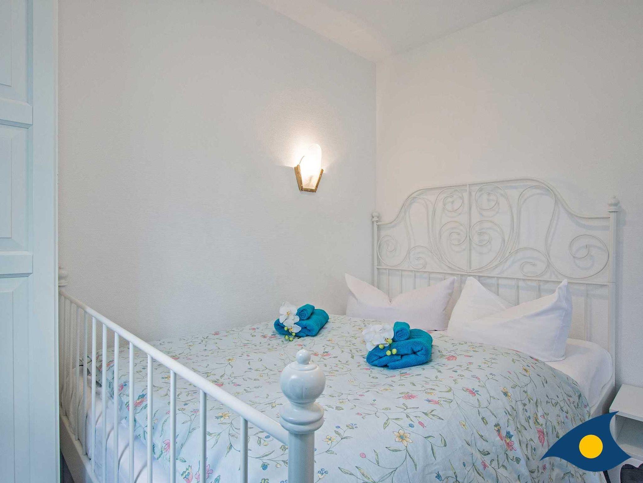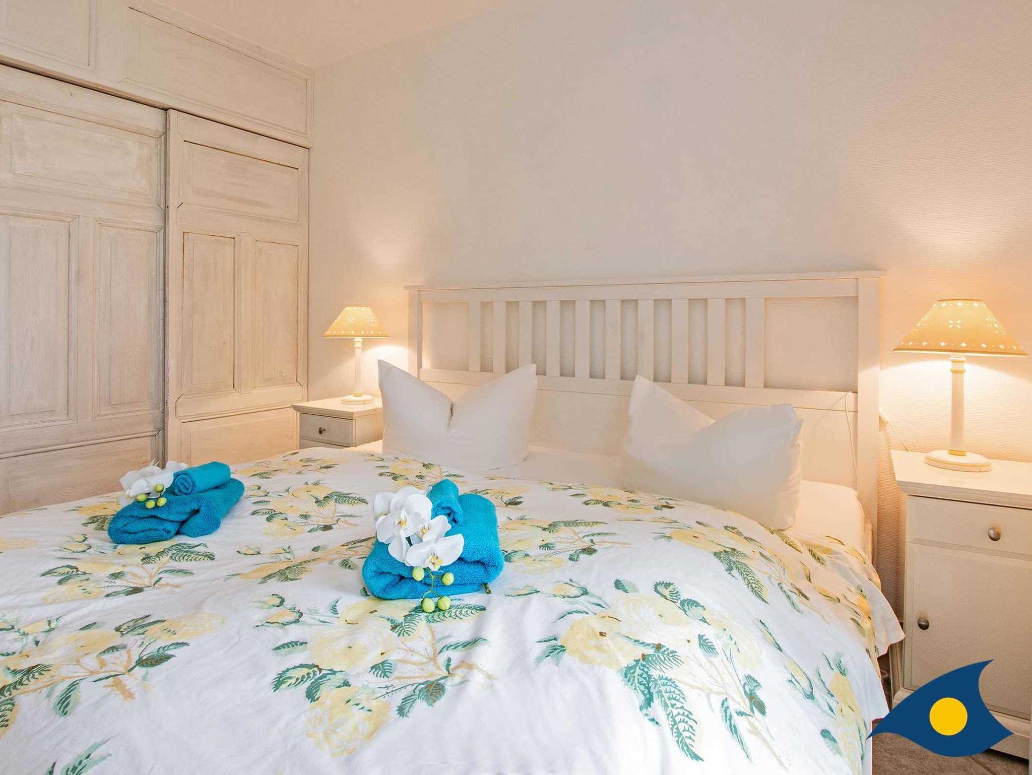 Das große und helle Schlafzimmer mit einem komfortablen Doppelbett (1,80 m x 2,0 m) und einem großzügigen Einbauschrank erreichen Sie vom kleinen Flur. Hier geht es ebenfalls zum kleinen aber feinen Badezimmer mit einer Eckdusche und ausreichendem Platz für Ihre Utensilien.