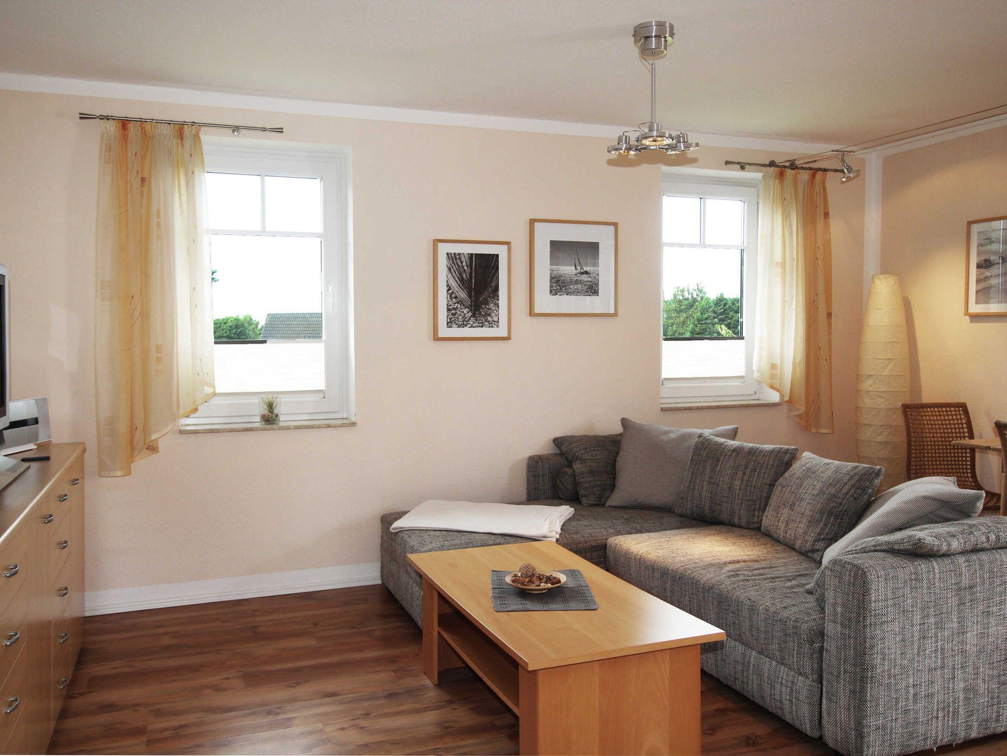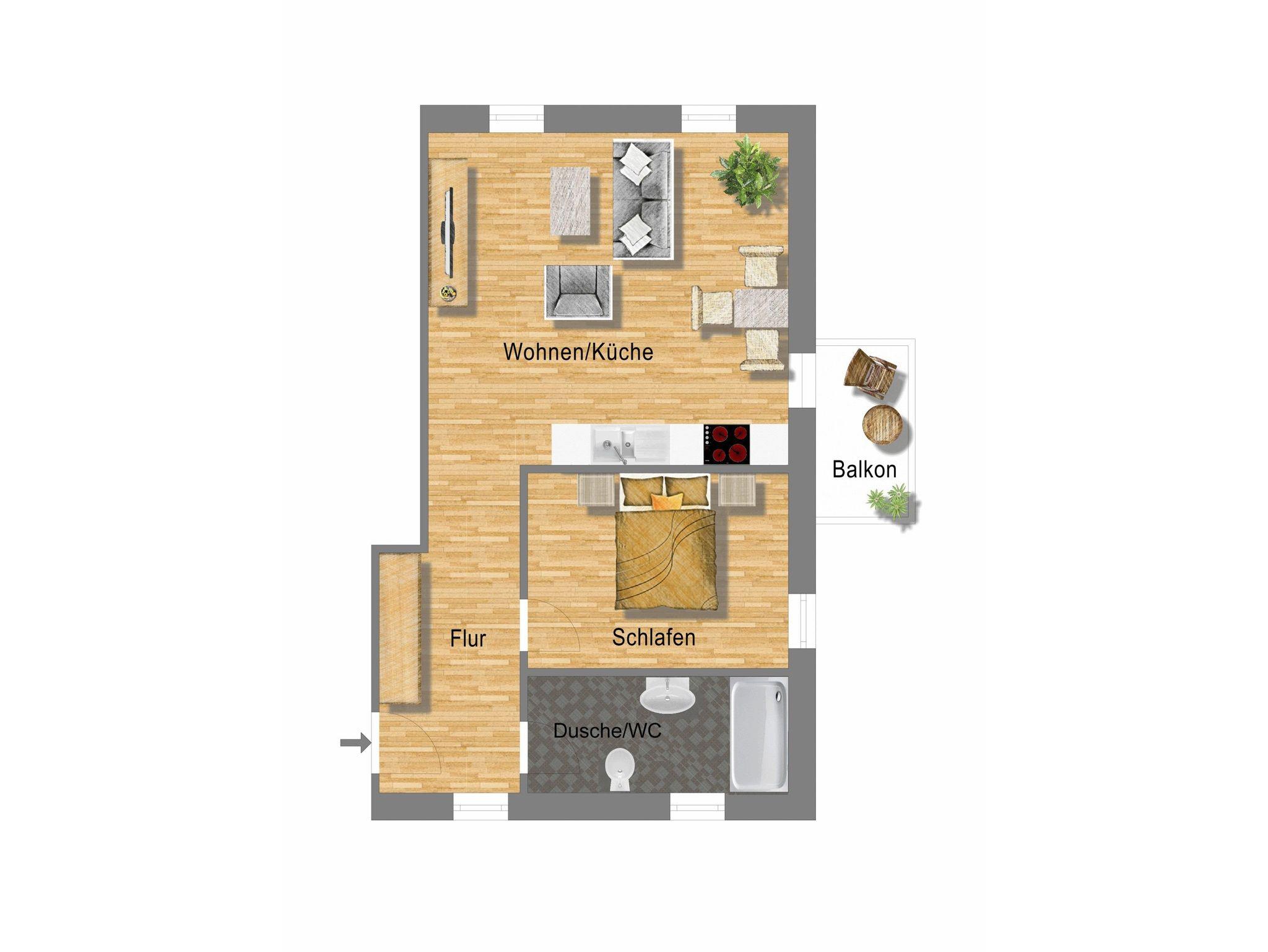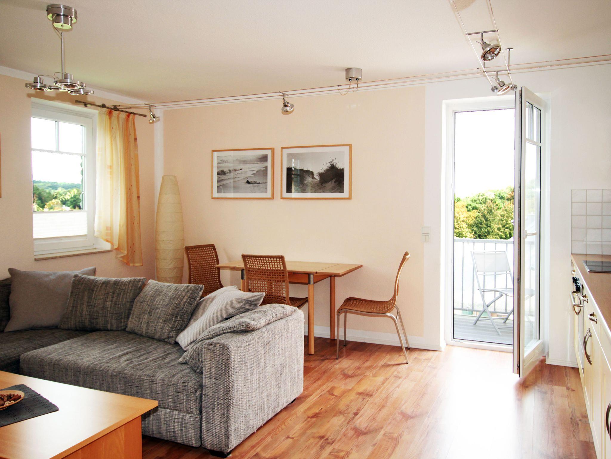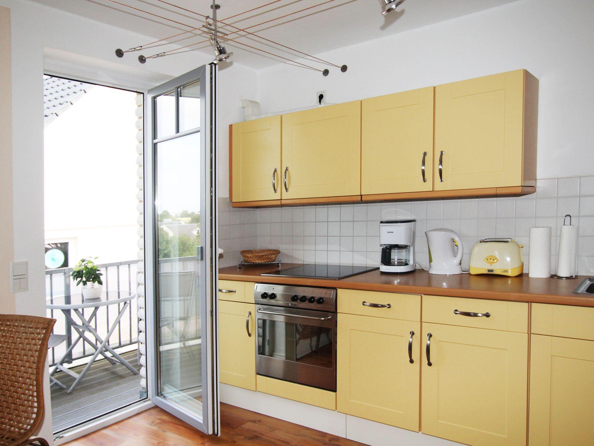 Die Ferienwohnung teilt sich auf in ein Wohnzimmer mit offener Küche, einem separaten Schlafzimmer mit Doppelbett und einem Badezimmer mit Dusche. Die Wohnung ist mit Laminat- und Fliesenfußböden mit Fußbodenheizung ausgestattet. Zur Wohnung gehört auch ein möblierter Balkon, der vom Wohnzimmer aus zu erreichen ist.