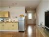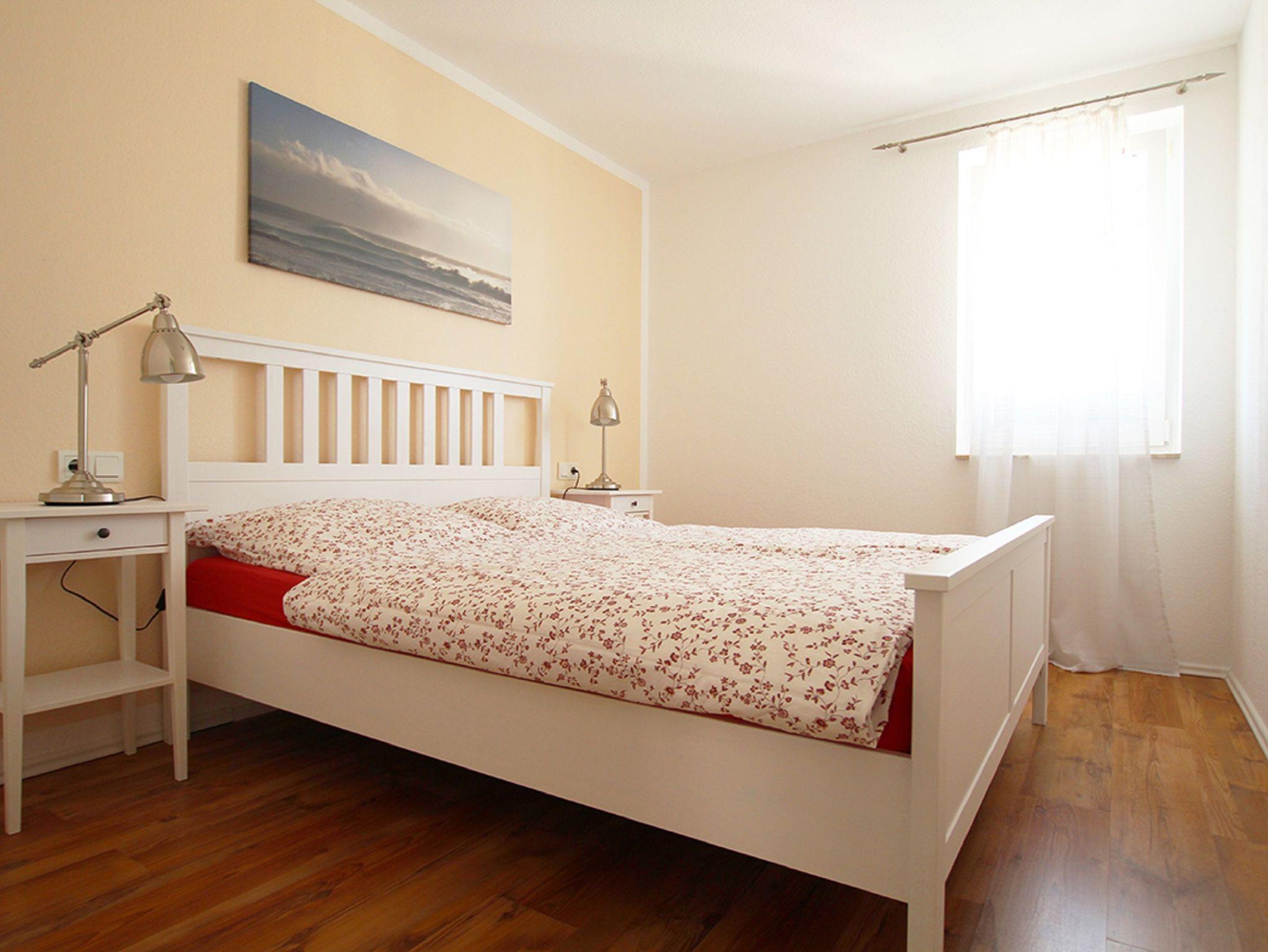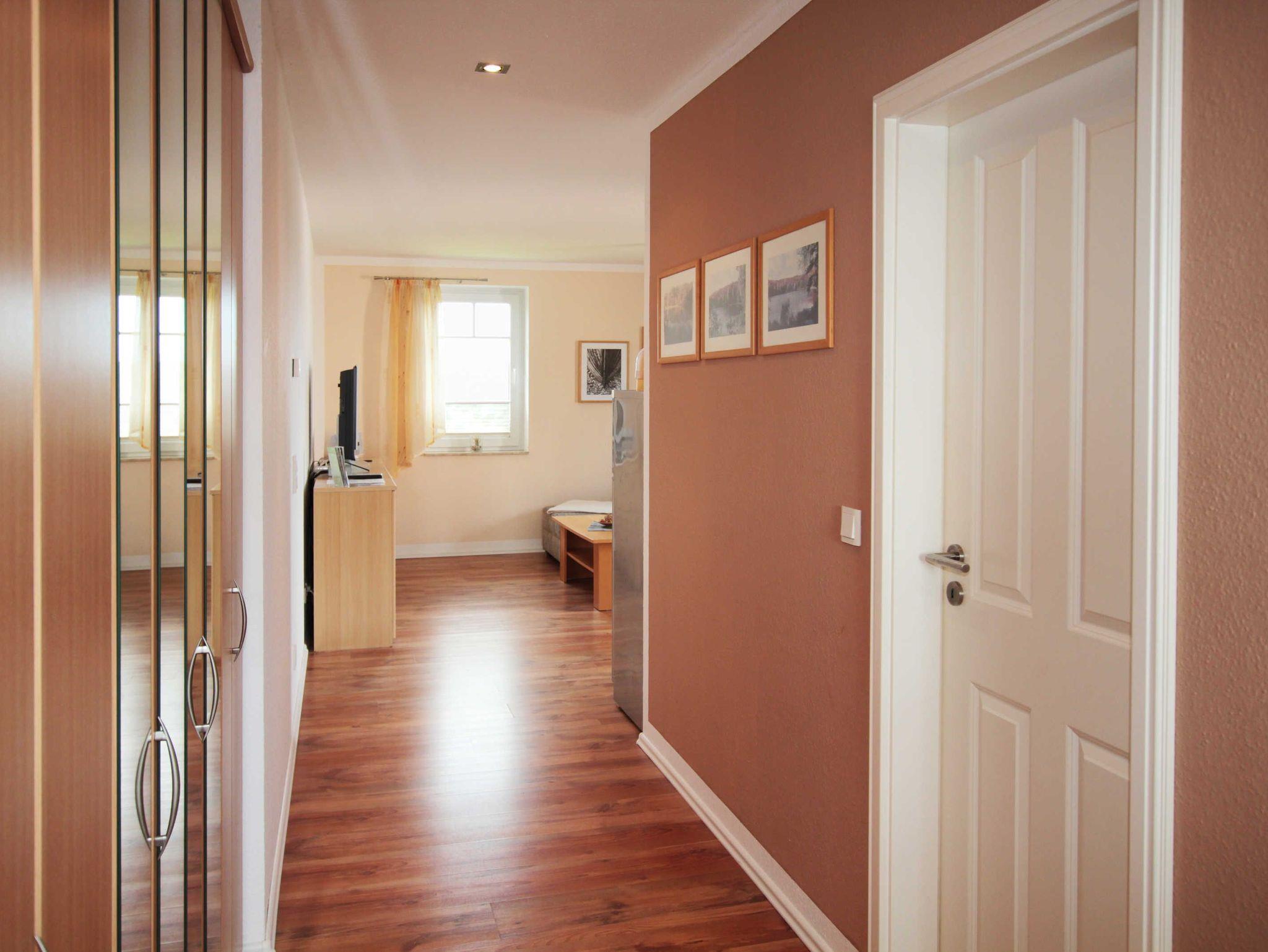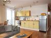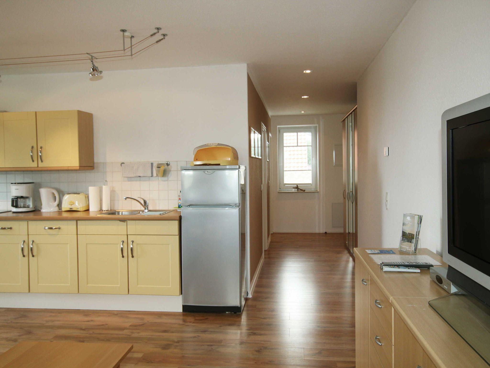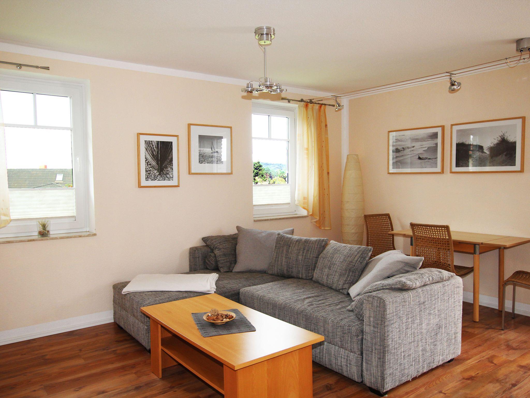 Die Ferienwohnung teilt sich auf in ein Wohnzimmer mit offener Küche, einem separaten Schlafzimmer mit Doppelbett und einem Badezimmer mit Dusche. Die Wohnung ist mit Laminat- und Fliesenfußböden mit Fußbodenheizung ausgestattet. Zur Wohnung gehört auch ein möblierter Balkon, der vom Wohnzimmer aus zu erreichen ist.