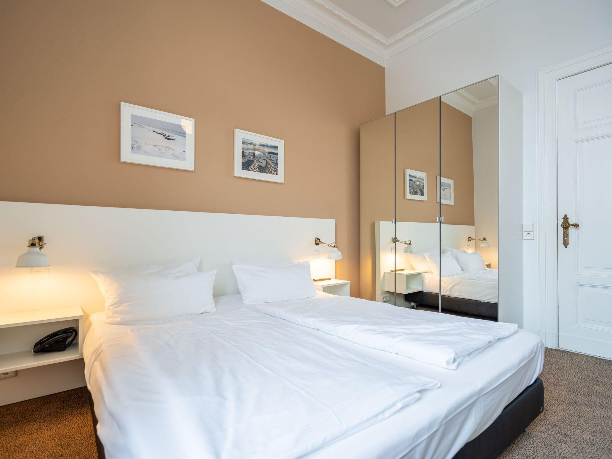 Die von Architektenhand neu gestaltete 3-Raum-Ferienwohnung 7 im Hochparterre, überzeugt nicht nur durch seine Südlage in der Villa Hintze. Hier ist modernes, großzügiges Wohnen ( 80 qm) in historischem Ambiente Programm. Für bis zu 4 Personen und ein Kleinkind (im Kinderreisebett) bietet das Domizil Platz. Es wurde mit viel Liebe und Gespür fürs Detail designt, die edle Farbgebung in dunklen Tönen harmoniert perfekt den wertigen Möbeln. Ihr Wohnbereich ist kuschelig und lifestylig zugleich. Eine technische Ausstattung mit WLAN und Flat-TV versteht sich von selbst. Die komplett ausgestattete Küchenzeile fügt sich stimmig in den großzügigen Wohn- und Essbereich ein und große Fenster sorgen für eine lichtdurchflutete Wohlfühlatmosphäre. Zwei gemütliche Schlafzimmer mit bequemen Boxspringbetten (1,80 m x 2,00 m) sorgen für einen guten Schlafkomfort, ein Badezimmer mit Badewanne und ein separates Gäste-WC[nbsp] ergänzen das Appartement. Der großzügige Südbalkon ist mit Gartenmöbel ausgestattet. Ein Pkw- Stellplatz steht auf dem abgeschlossenen Grundstück zur Verfügung.