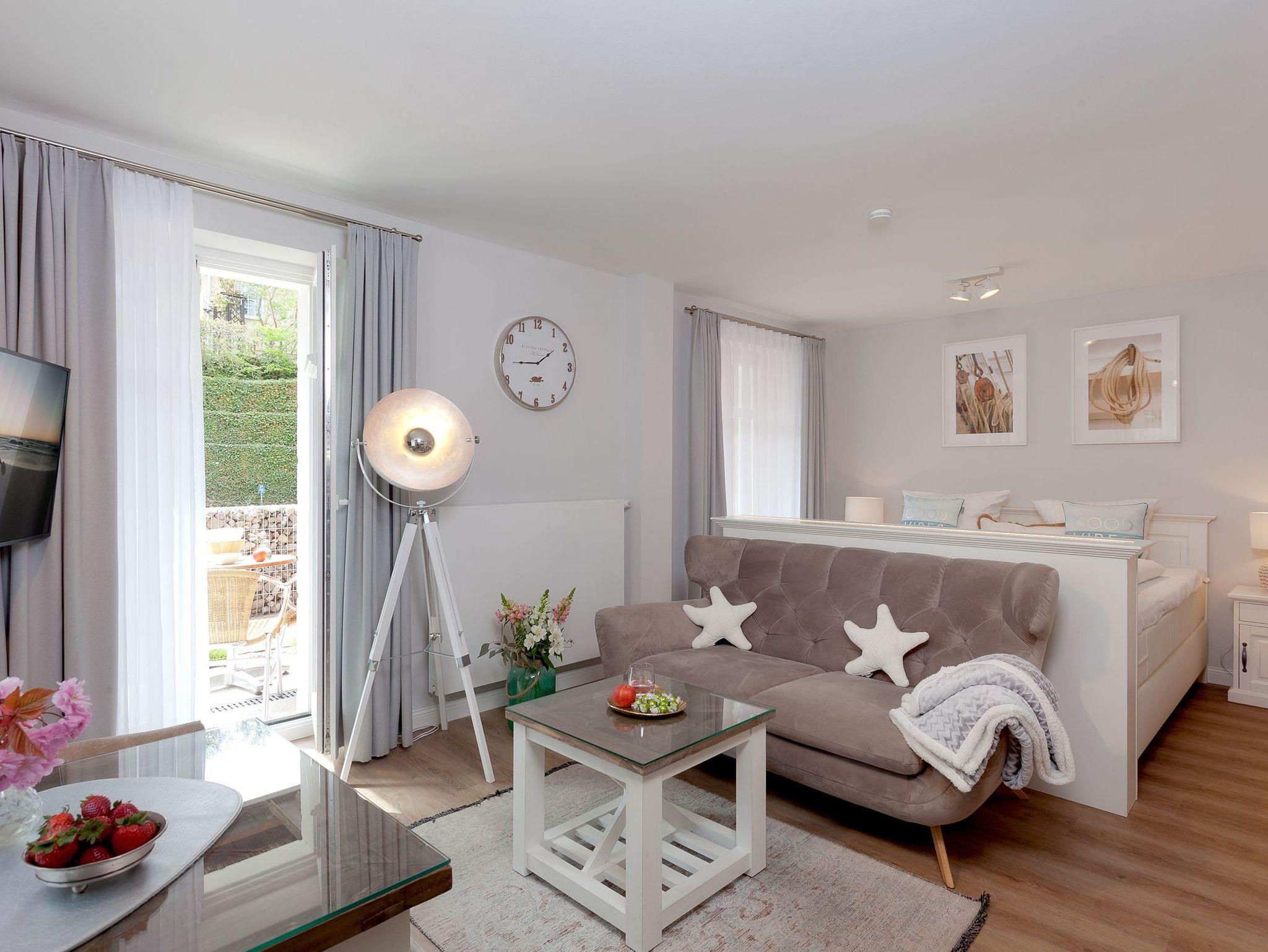 Vom Wohnzimmer aus gelangen Sie auf Ihre private Terrasse in Südausrichtung, auf der Sie sonnig den Morgen begrüßen oder Ihren Urlaubstag auch im Freien ausklingen lassen können.