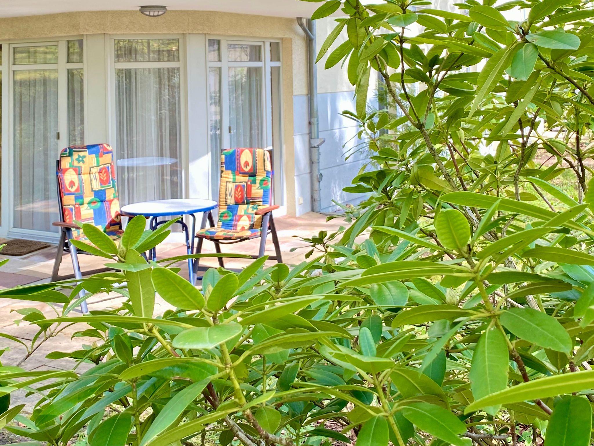 Die schöne Zweiraumwohnung 25 befindet sich im Erdgeschoss der Villa Rosengarten. Im Wohnzimmer befindet sich ein Esstisch, eine Sitzecke sowie eine Küchenzeile. Ansonsten überzeugt die Wohnung durch sehr schöne Steinfliesen und hat eine überdachten Terrasse. Im Schlazimmer steht ein Doppelbett und ein großer Kleiderschrank. Zur Ferienwohnung gehört ein Badezimmer mit Dusche.