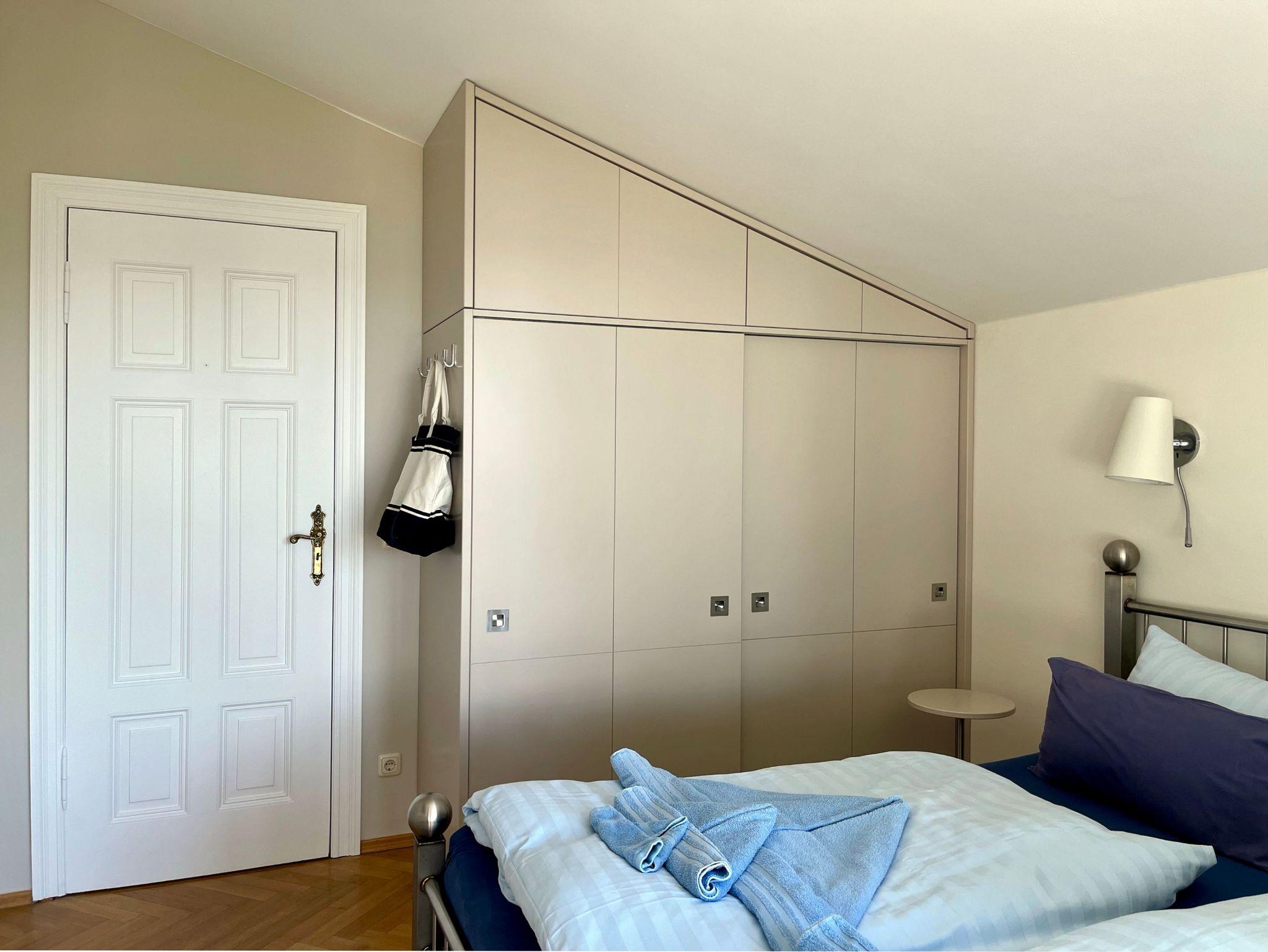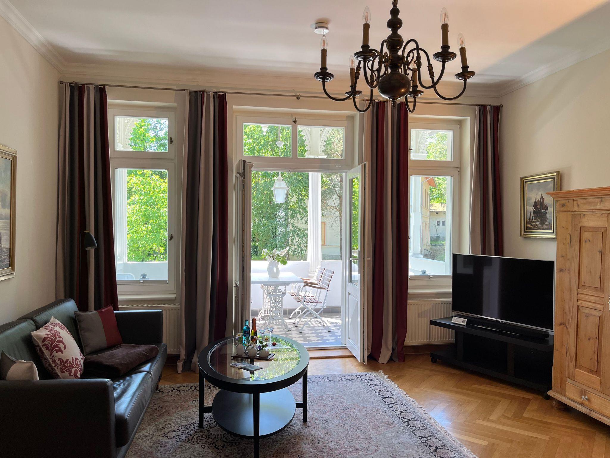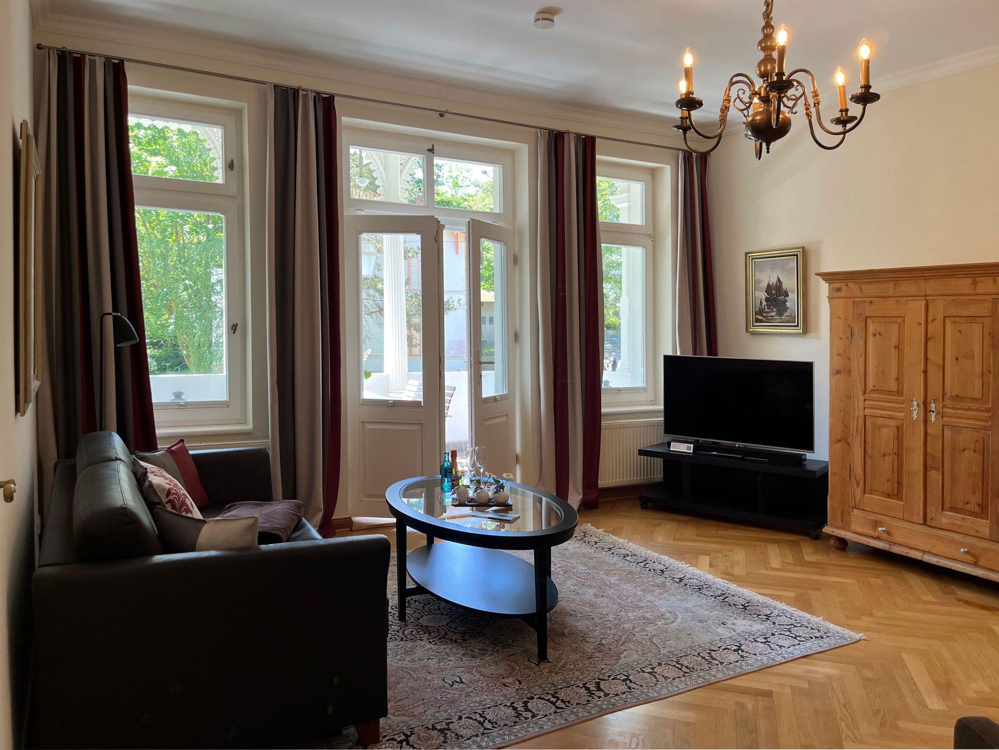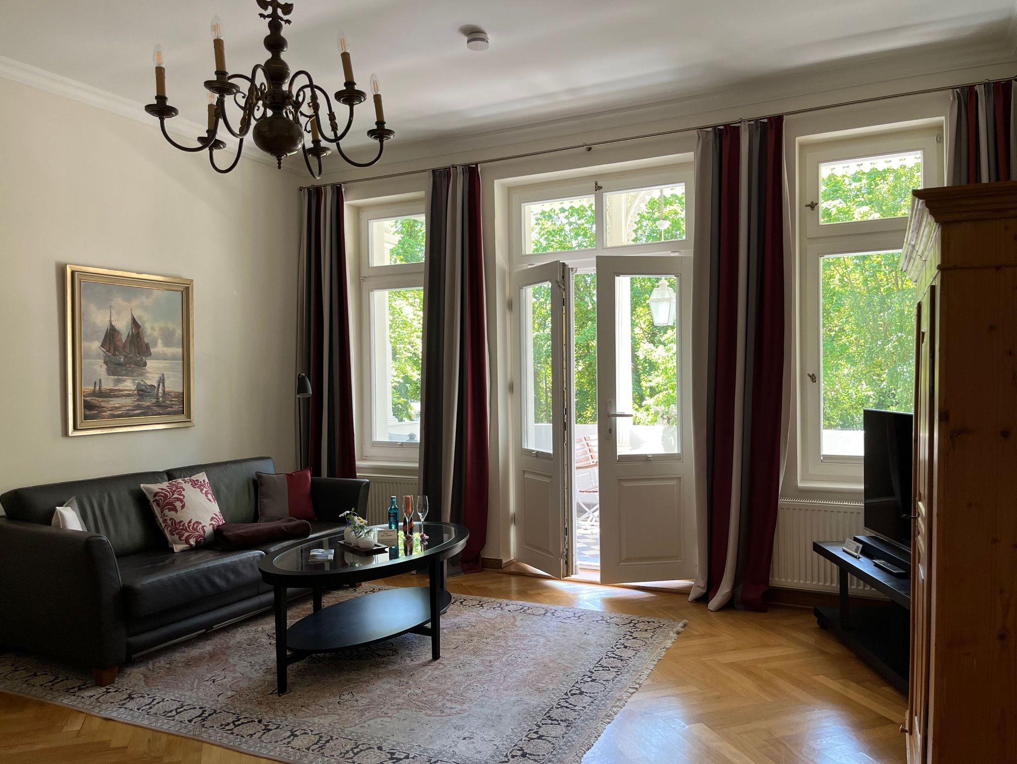 Großzügige Ferienwohnung mit herrlichem Meerblick vom Schlafzimmer und der dazugehörigen Terrasse. Zur Wohnung gehört der historische Verandenvorbau auf der sonnigen Süd-/Westseite mit Blick in den gepflegten Vorgarten und in die Kronen der stattlichen Bäume. All unsere Wohnungen sind geschmackvoll und individuell eingerichtet. Ausgesuchte Möbelstücke und Bilder, Echtholz-Parkett - teils mit hochwertigen Teppichen belegt ? prägen den Stil des Hauses. Das Meerblick-Schlafzimmer ist mit einem manufakturgefertigten Edelstahlbett, Einbauschrank incl. Safe, Flachbild-TV und Verdunklung ausgestattet, die Terrassentür ist mit Insektenschutz versehen. Als zusätzliche Schlafgelegenheit befindet sich im Wohnbereich eine komfortable ausklappbare Ledercouch. Zur Ausstattung gehört ein Smart-TV mit Soundbar - zur einfachen Verbindung mit Ihrem Smartphone, iPad oder anderen bluetoothfähigen Geräten - sowie ein DVD-Player. Die komplett ausgestattete Küche (Kühlschrank mit Gefrierfach, Backofen, Cerankochfeld, Dunstabzug, Mikrowelle, Toaster, Wasserkocher, Filter-Kaffeemaschine u. Nespresso-Kapselmaschine, Rührgerät etc.) ist in sich abgeschlossen. Es gibt ein Tageslicht-Badezimmer mit Wanne und eine Dusche.