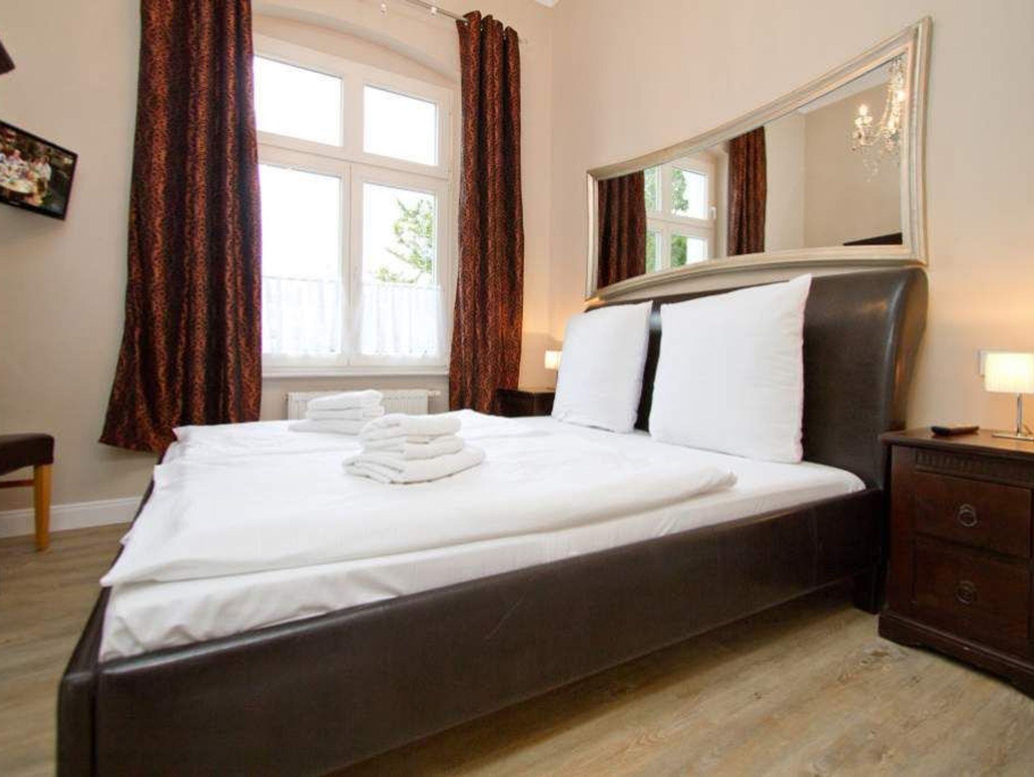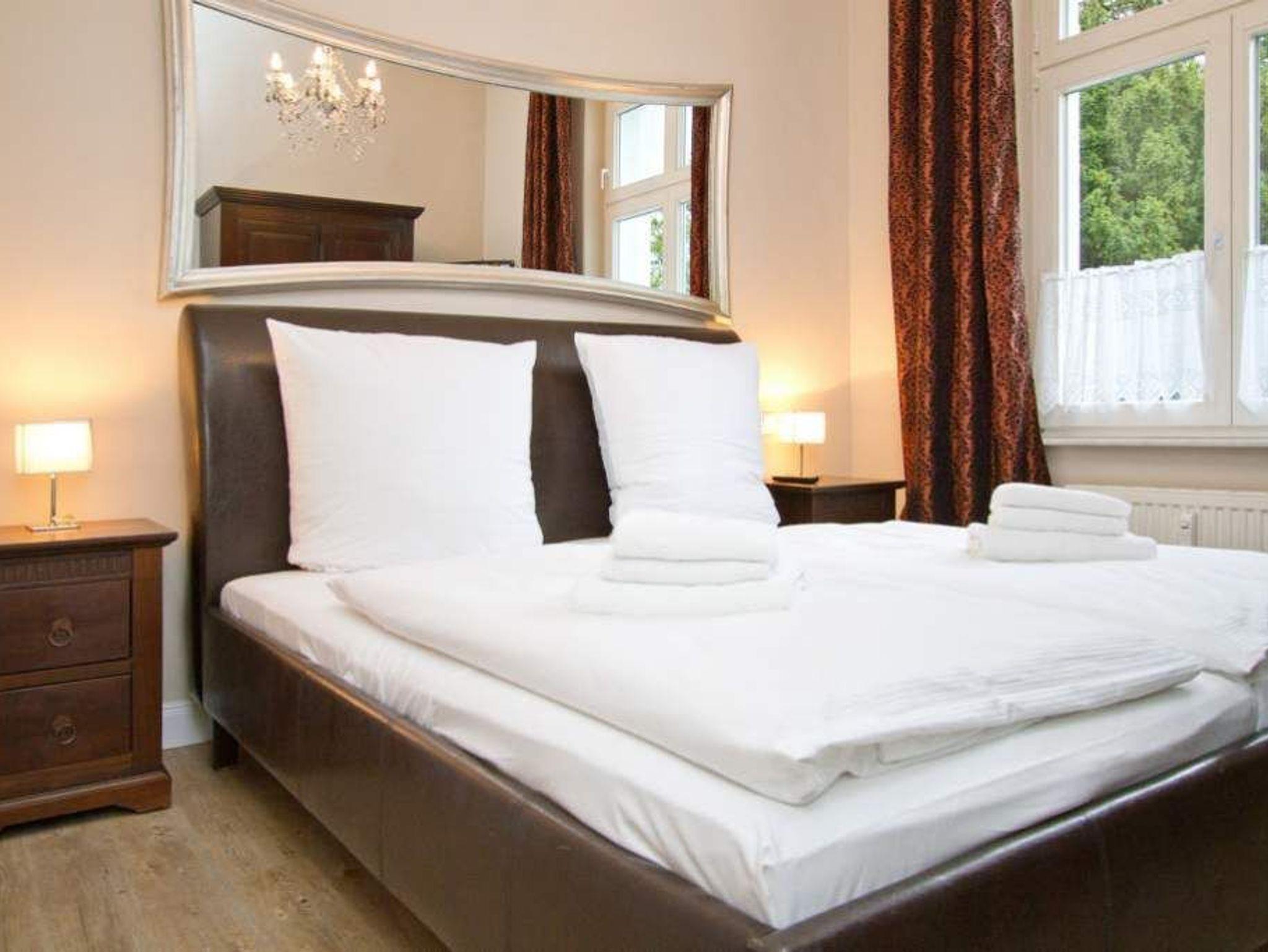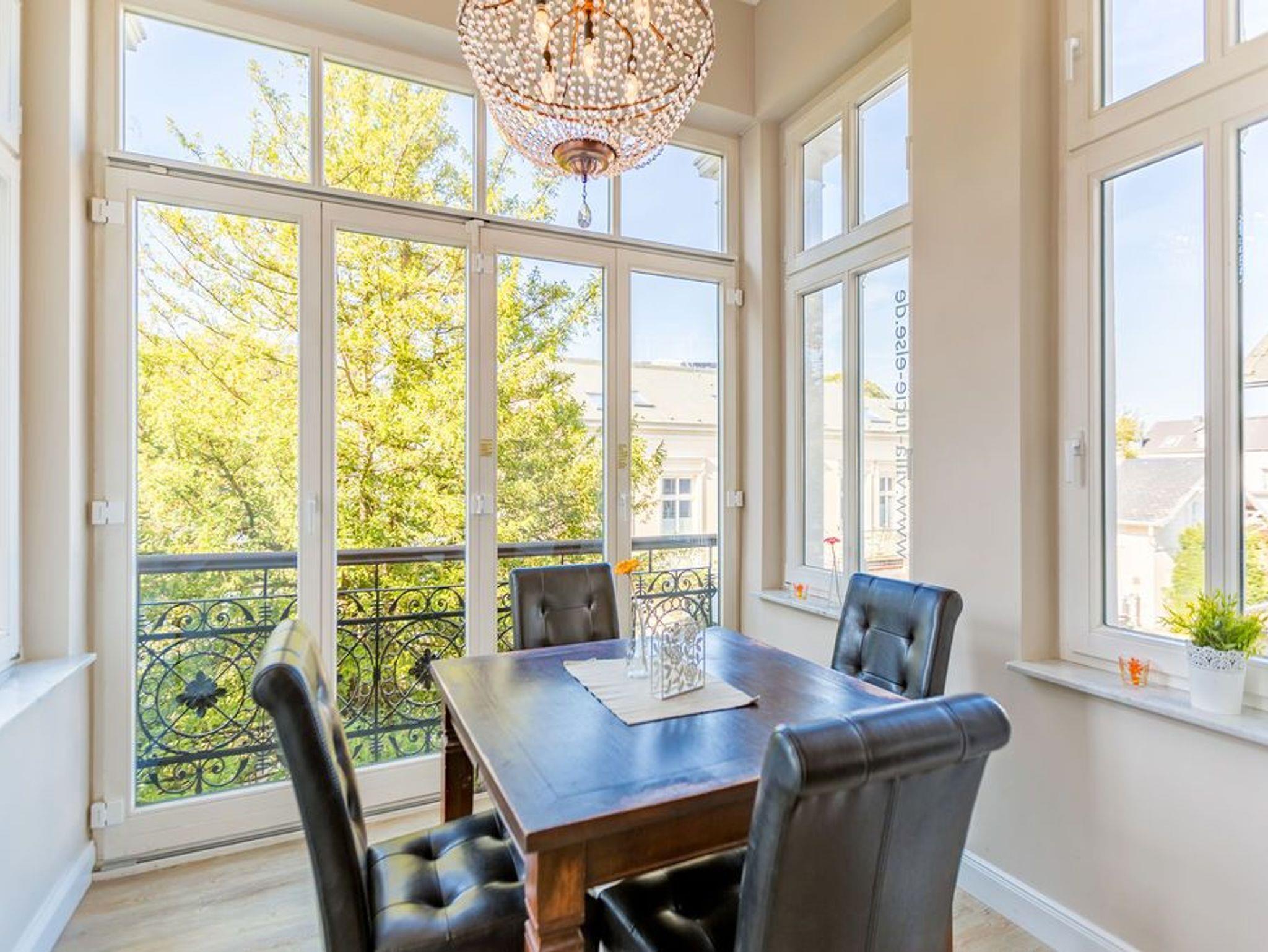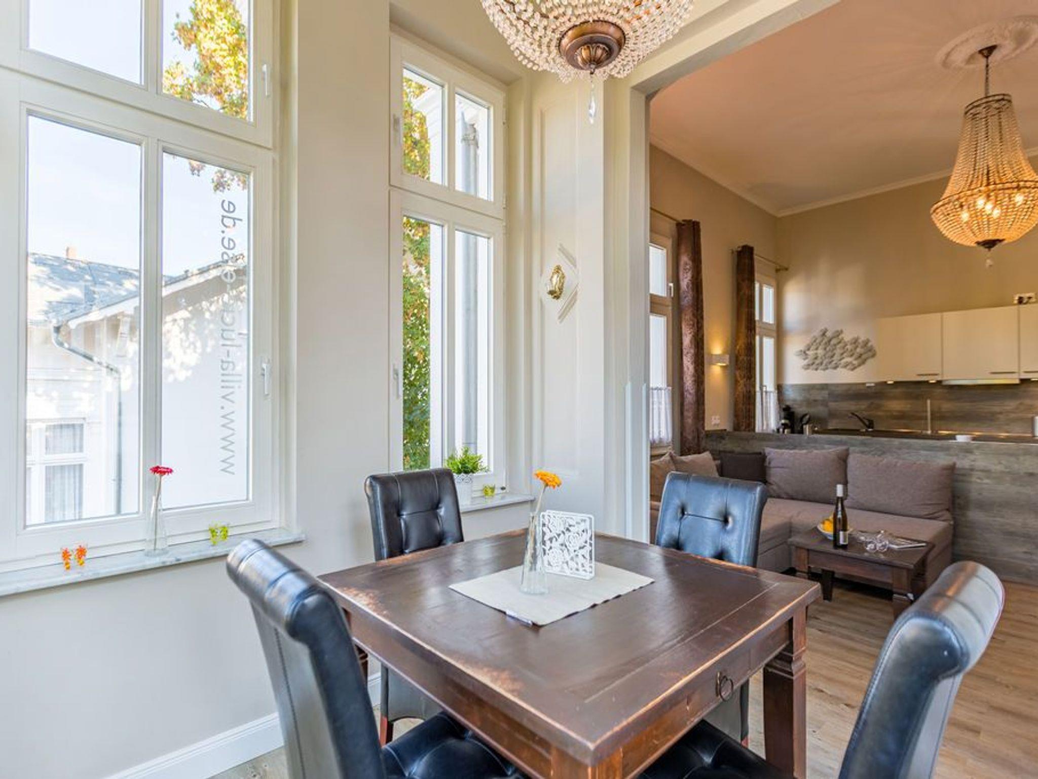In der ersten Etage der historischen Gründerzeitvilla von 1880 befindet sich die liebevoll, gemütlich und klassisch eingerichtete 3-Raum-Ferienwohnung (68 m²) für 4 Personen und ein Kleinkind (bis 3 Jahre im Kinderreisebett). Der offene Wohnbereich ist ausgestattet mit einer gemütlichen Sitzgruppe, Kaminofen, Flat-TV und Blue-Ray- / CD-Player. Die vorgelagerte verglaste Loggia bietet sich an, um hier am Esstisch entspannt zu verweilen. Die bodentiefe Fensterfront lässt sich komplett zur Seite aufschieben, so dass man in der Loggia ein Balkonfeeling bekommt. Die voll ausgestattete Küche mit Herd/Backofen, Mikrowelle, Geschirrspüler und reichlich Geschirr, ist im Wohnbereich integriert und lädt zu geselligen Kochabenden ein. Es gibt zwei Schlafzimmer mit großen Doppelbetten, Kleiderschrank und Flat-TV, ein Bad mit Dusche/WC und zudem ein separates WC. Ein Pkw-Stellplatz befindet sich direkt am Haus. In dieser Wohnung können Sie kostenlos das W-LAN nutzen. Für kleine Gäste können Sie ein Kinderreisebett und einen Hochstuhl gegen Aufpreis dazu buchen.
