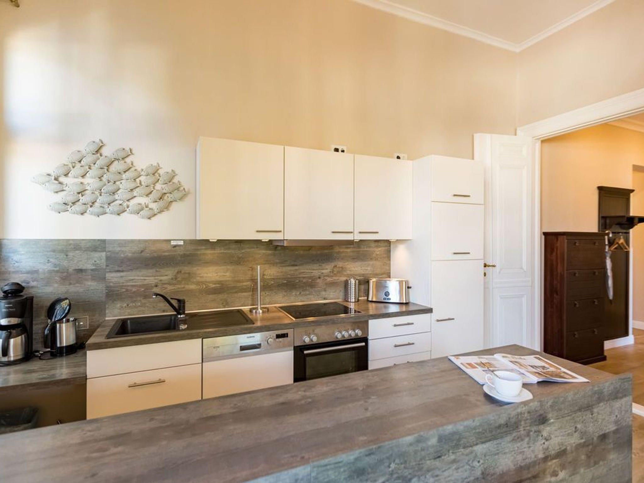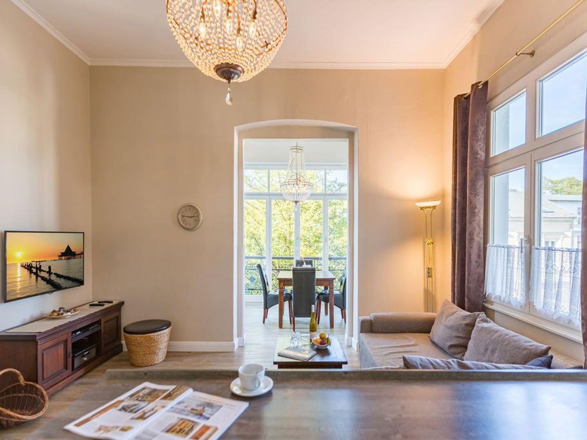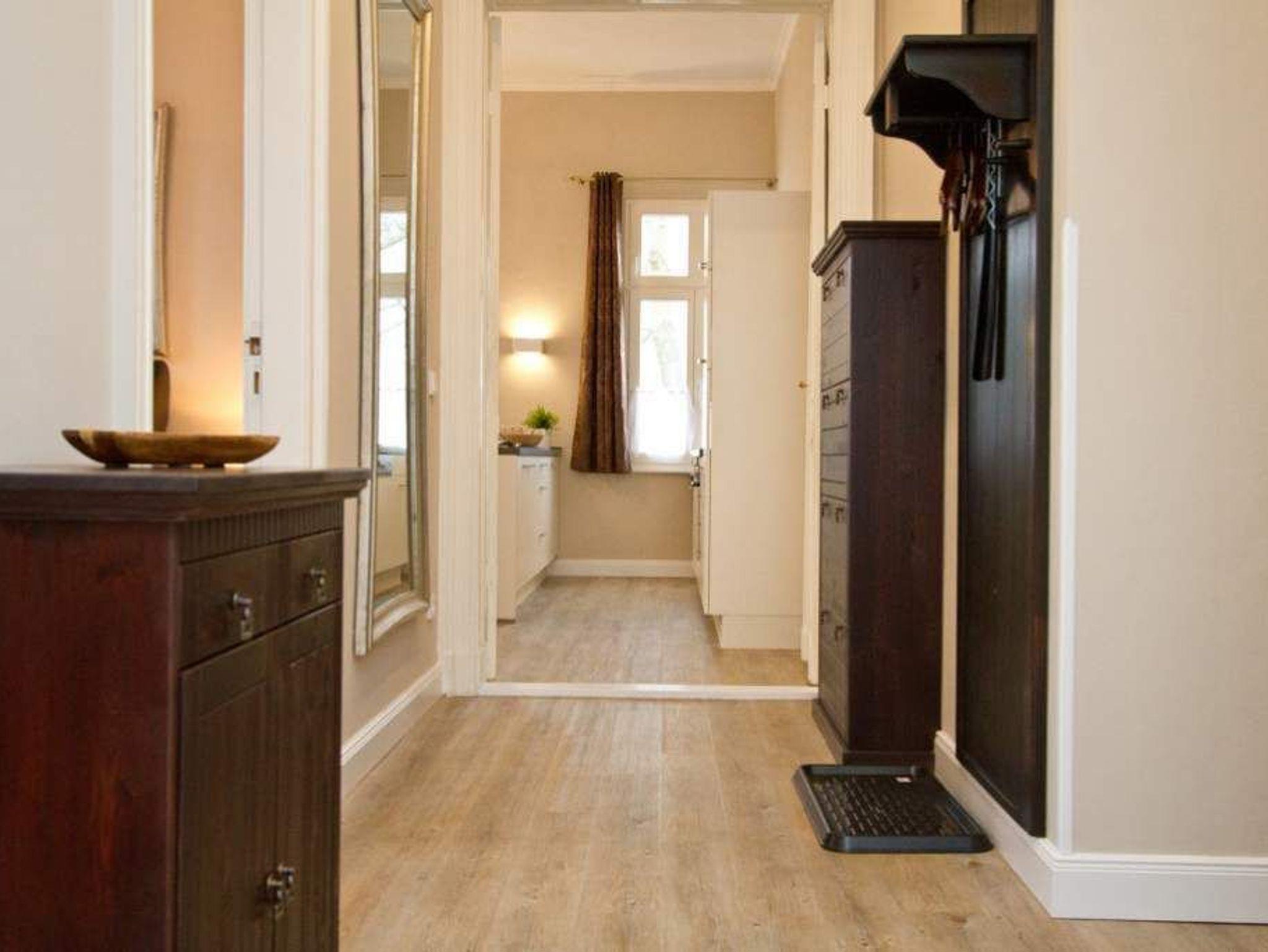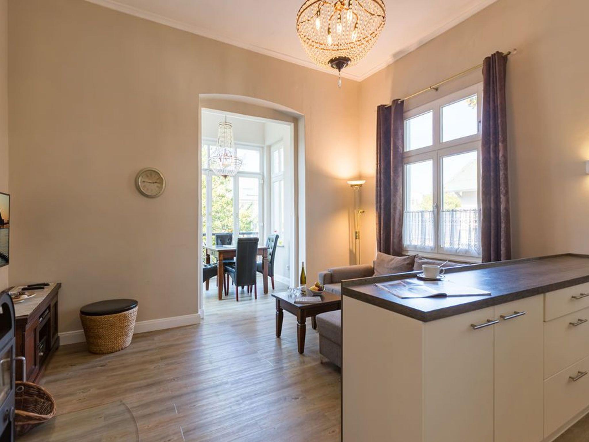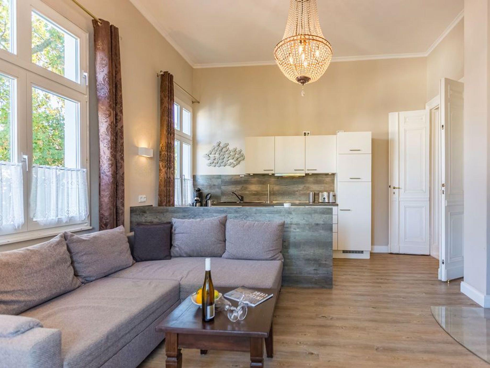 In der ersten Etage der historischen Gründerzeitvilla von 1880 befindet sich die liebevoll, gemütlich und klassisch eingerichtete 3-Raum-Ferienwohnung (68 m²) für 4 Personen und ein Kleinkind (bis 3 Jahre im Kinderreisebett). Der offene Wohnbereich ist ausgestattet mit einer gemütlichen Sitzgruppe, Kaminofen, Flat-TV und Blue-Ray- / CD-Player. Die vorgelagerte verglaste Loggia bietet sich an, um hier am Esstisch entspannt zu verweilen. Die bodentiefe Fensterfront lässt sich komplett zur Seite aufschieben, so dass man in der Loggia ein Balkonfeeling bekommt. Die voll ausgestattete Küche mit Herd/Backofen, Mikrowelle, Geschirrspüler und reichlich Geschirr, ist im Wohnbereich integriert und lädt zu geselligen Kochabenden ein. Es gibt zwei Schlafzimmer mit großen Doppelbetten, Kleiderschrank und Flat-TV, ein Bad mit Dusche/WC und zudem ein separates WC. Ein Pkw-Stellplatz befindet sich direkt am Haus. In dieser Wohnung können Sie kostenlos das W-LAN nutzen. Für kleine Gäste können Sie ein Kinderreisebett und einen Hochstuhl gegen Aufpreis dazu buchen.