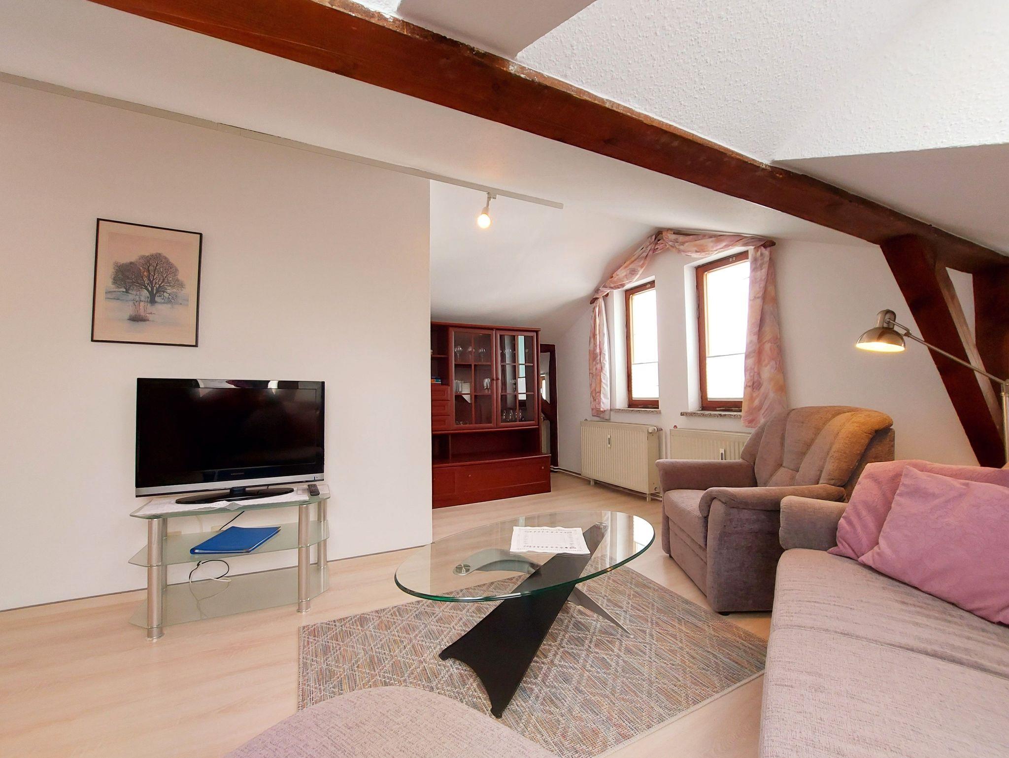 Die Ferienwohnung 5 befindet sich im Dachgeschoss des Hauses. Sie teilt sich auf in ein Wohnzimmer mit offener Küche und Essbereich. Im Wohnzimmer befindet sich eine gemütliche Couch, ein Sessel und ein Flachbildfernseher. Die Küche ist ausgestattet mit Backofen, Herd, Kühlschrank mit Gefriermöglichkeit, Mikrowelle, Spülmaschine, Kaffeemaschine, Wasserkocher und Toaster.