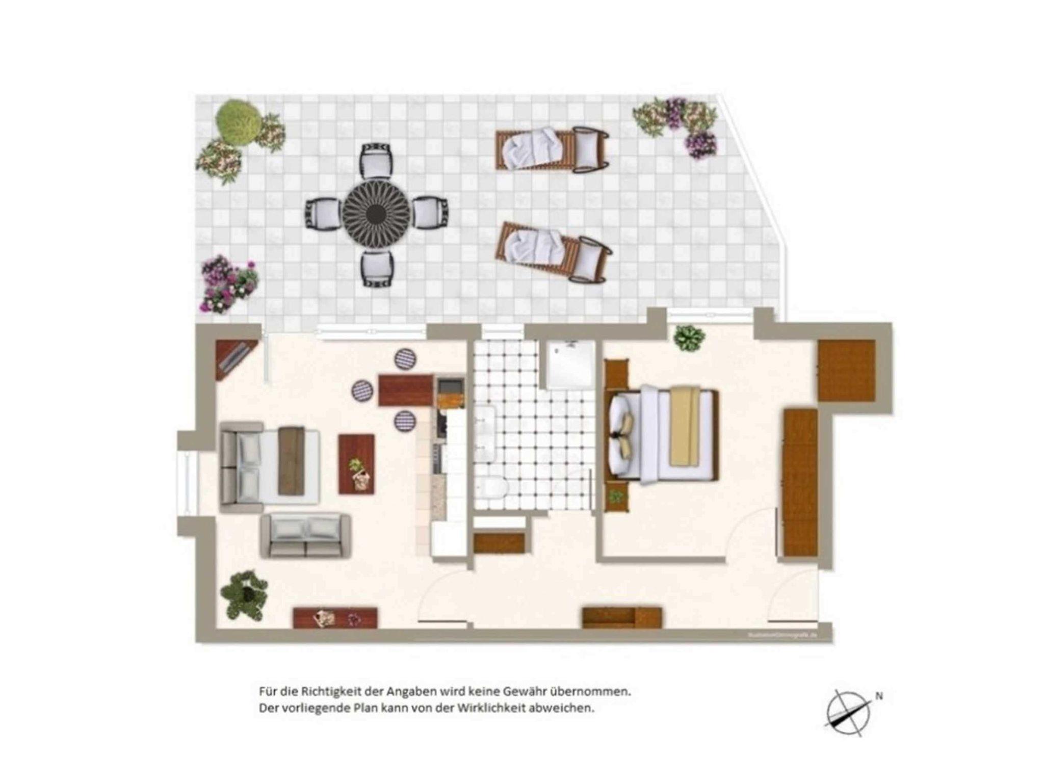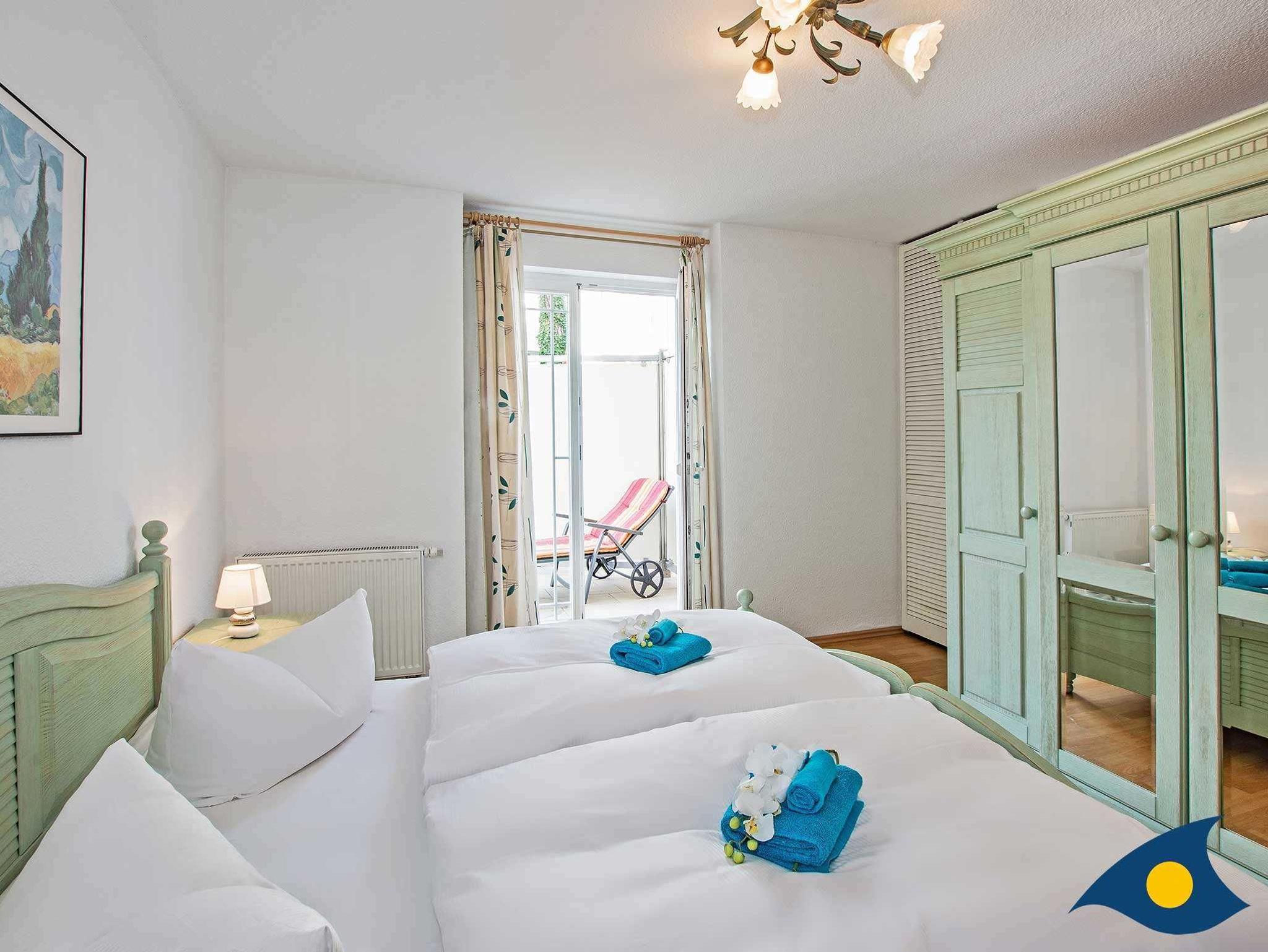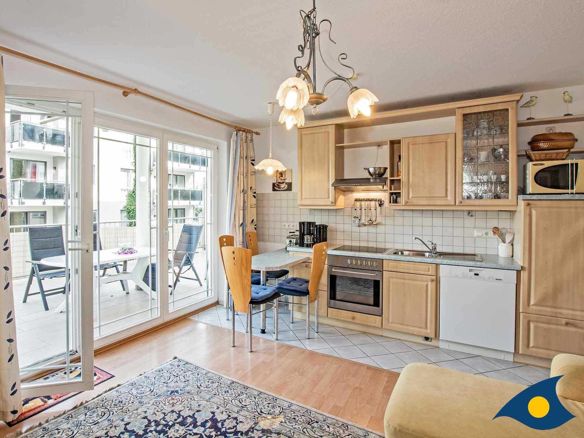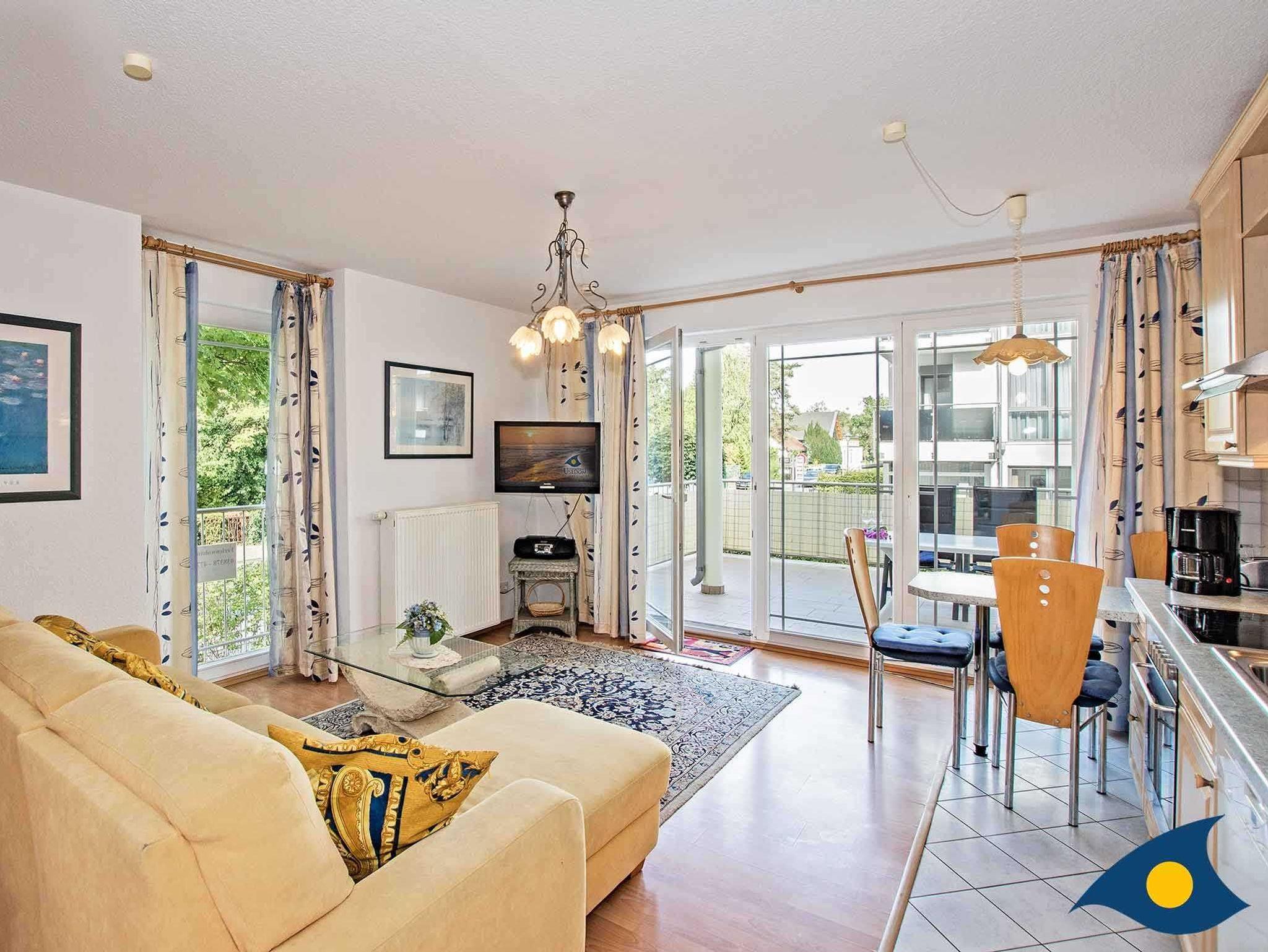 Das Appartement liegt Hochparterre und verfügt über eine 35 qm große Terrasse. 2 Gesundheitsliegen und eine Sitzecke laden zum Entspannen und Erholen ein.