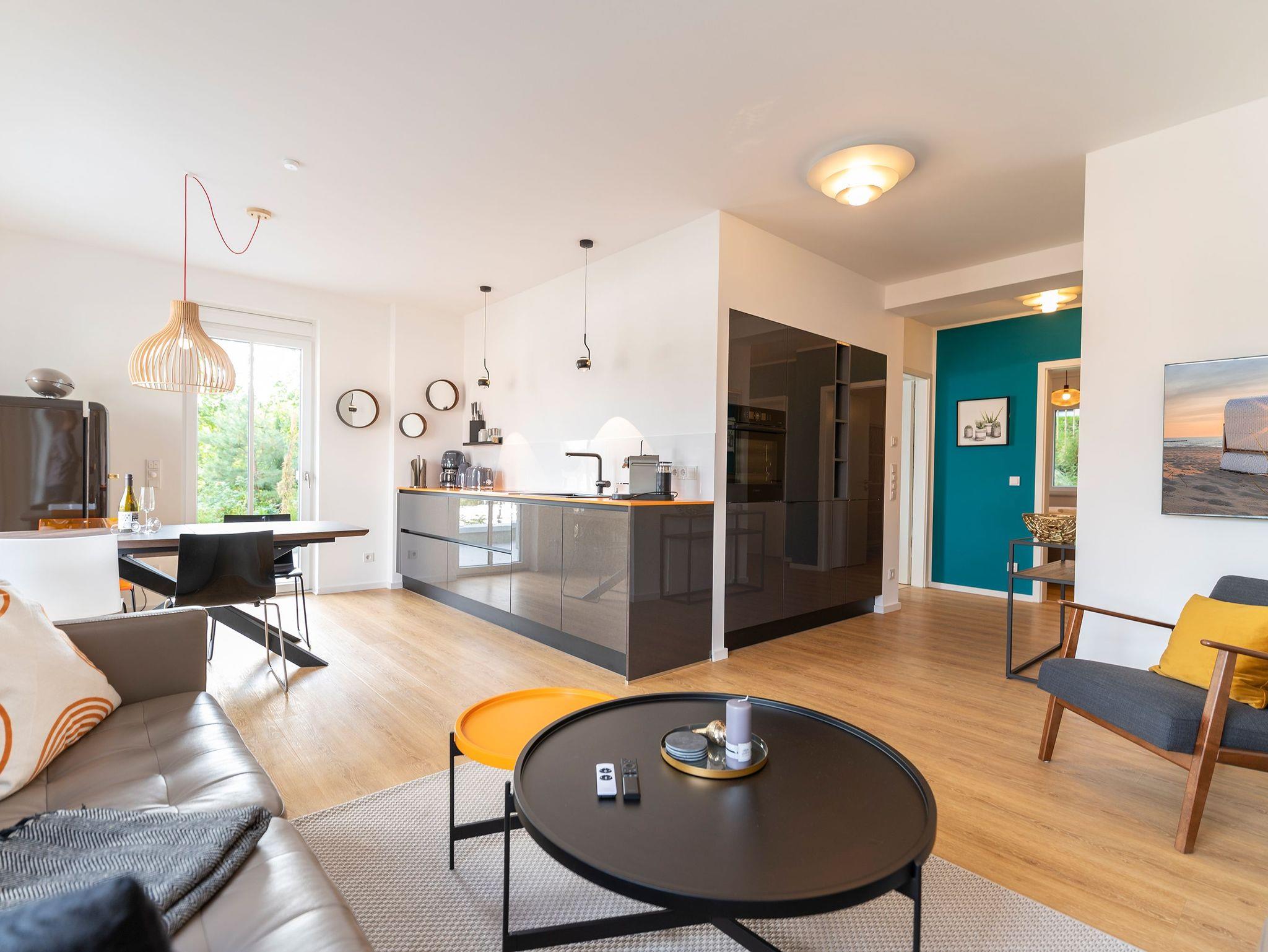 Die 73 Quadratmeter große Wohnung bietet Platz für bis zu vier Personen und ein Kleinkind, und auch Ihr vierbeiniger Freund ist hier herzlich willkommen. Genießen Sie modernen Wohnkomfort in drei stilvoll eingerichteten Zimmern. Der offene und großzügige Wohn- und Essbereich mit seiner voll ausgestatteten Küchenzeile, inklusive Nespressomaschine und Borakochfeld, lädt zum gemeinsamen Kochen und Verweilen ein. Eine Waschmaschine ist für Ihren Komfort ebenfalls vorhanden.