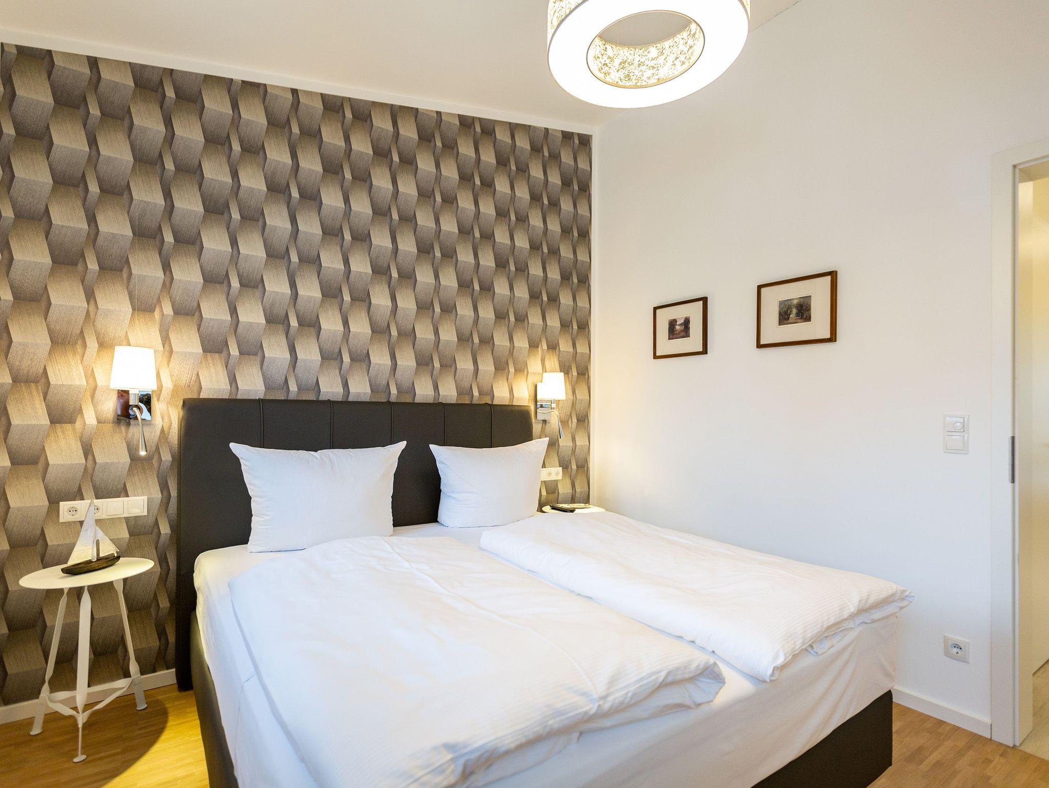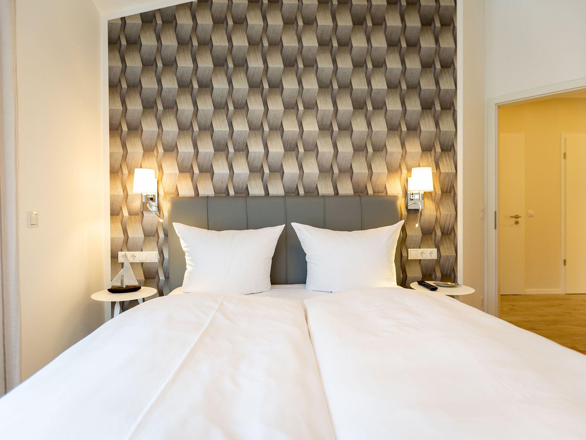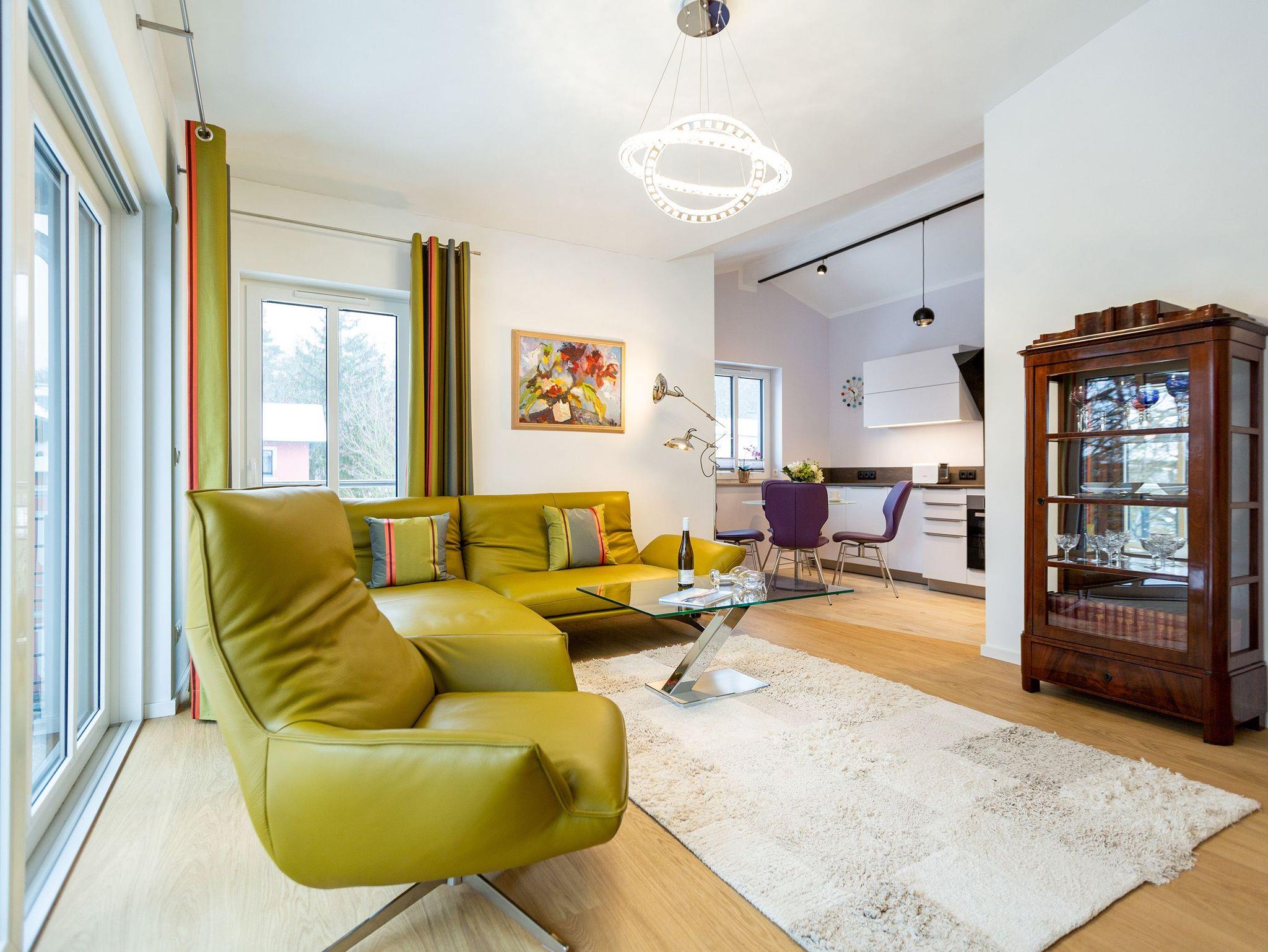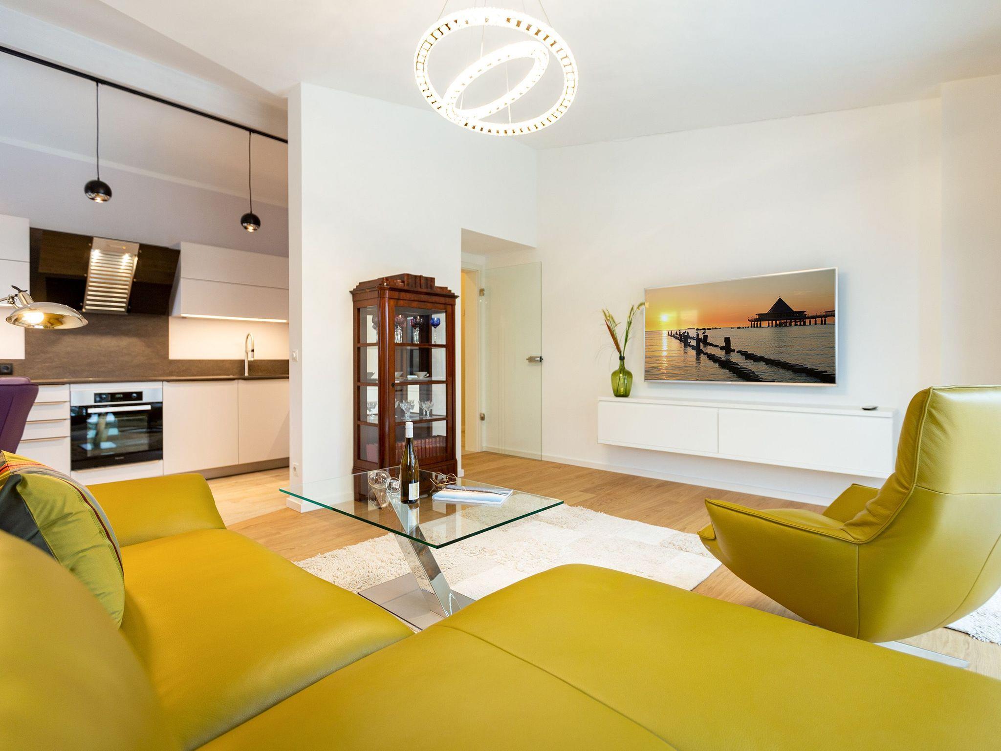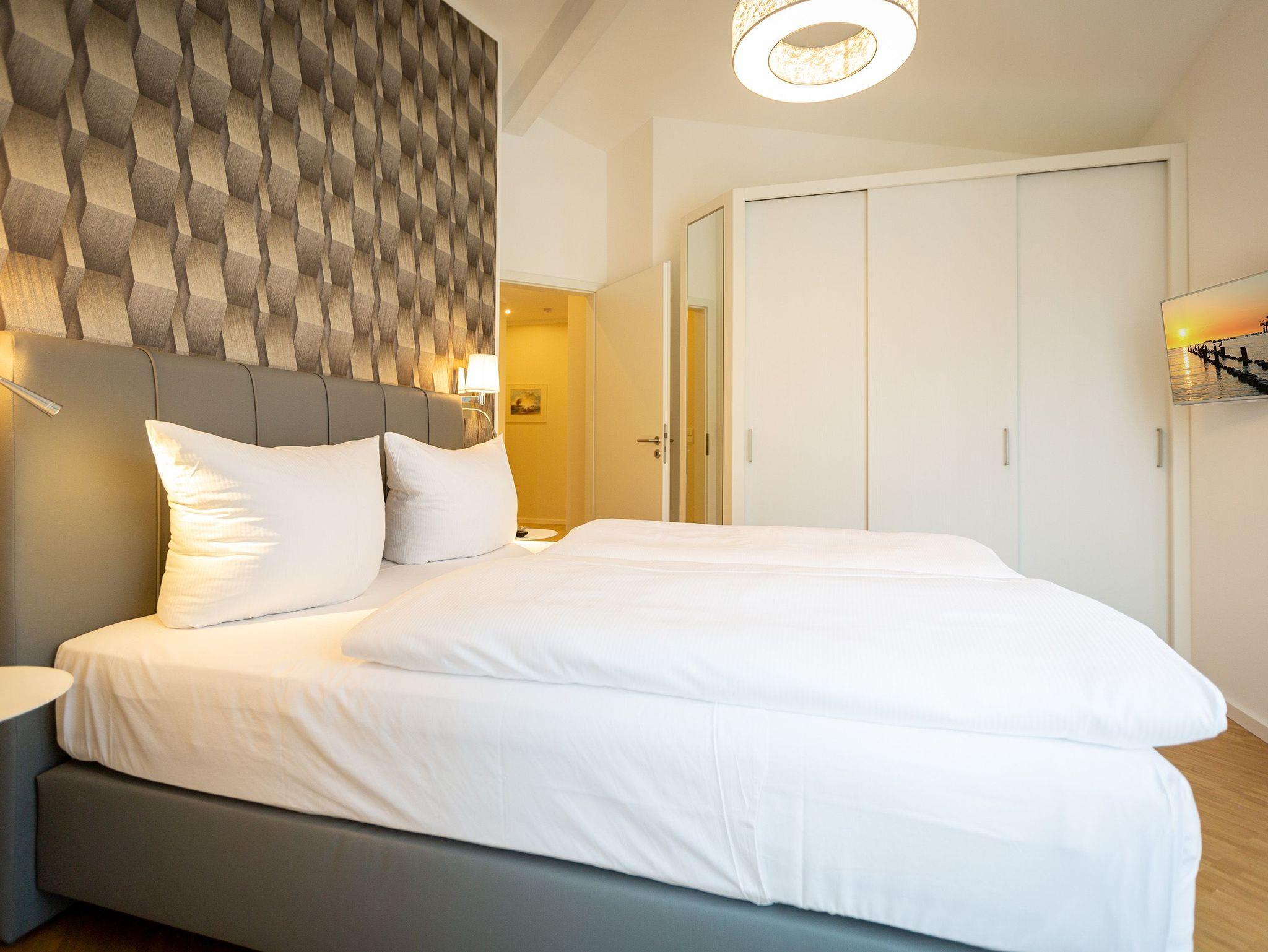 Das Appartement Nummer 8 in der 3. Etage setzt auf seinen 79 Quadratmetern gleich mehrere Akzente: Farbakzente, Lichtakzente und Designakzente. Alles zusammen sorgt dafür, dass sich die bis zu vier Personen in dem Drei-Zimmer-Urlaubsdomizil rundum wohlfühlen. Hier ist nichts 0815. Schon gar nicht die Farben. Dezent, aber dennoch präsent verleihen sie der Wohnung eine behagliche Atmosphäre: Von der lindgrünen Leder-Landschaft zum Faulenzen und Entspannen bis zum Indigo der Stühle rund um den Esstisch. Große, helle Räume sorgen für Leichtigkeit und Komfort. Treten Sie vom Wohnzimmer aus auf den sonnigen Süd-Ost-Balkon (6 Quadratmeter) und atmen Sie die gesunde Ostseeluft tief in sich ein. Ebenfalls an das geräumige Wohnzimmer angeschlossen, ist die offene Küche mit einer voll ausgestattete Küchenzeile und einem schönen Essplatz. Alle Geräte sind Markengeräte. Ein komplettes Geschirr-Service finden Sie in den Schränken. Auch die beiden Schlafzimmer empfangen den Gast mit modernem Design. Jedes verfügt über ein Boxspringdoppelbett (eines 1,80 m x 2,00 m, das zweite 1,60 m x 2,00 m) sowie einen extra angefertigten Kleiderschrank. Alle drei Zimmer des Appartements sind mit einem Flat-TV ausgestattet. In den beiden Badezimmern sind je eine Dusche und eine Toilette vorhanden. Darüber hinaus besitzt das Masterbad eine Badewanne und ein Bidet. Handtücher liegen selbstverständlich bereit und auch die Betten sind bereits bezogen. Zu dem Appartement gehört der Außenstellplatz Nummer 8 im Hof. In einem separaten und abschließbaren Kellerraum befindet sich eine Ladestation für E-Bikes. Der WLAN-Zugang ist kostenfrei. Sie brauchen also nur ankommen, mit dem Fahrstuhl in die 3. Etage fahren und schon sind Sie mitten im Urlaub.