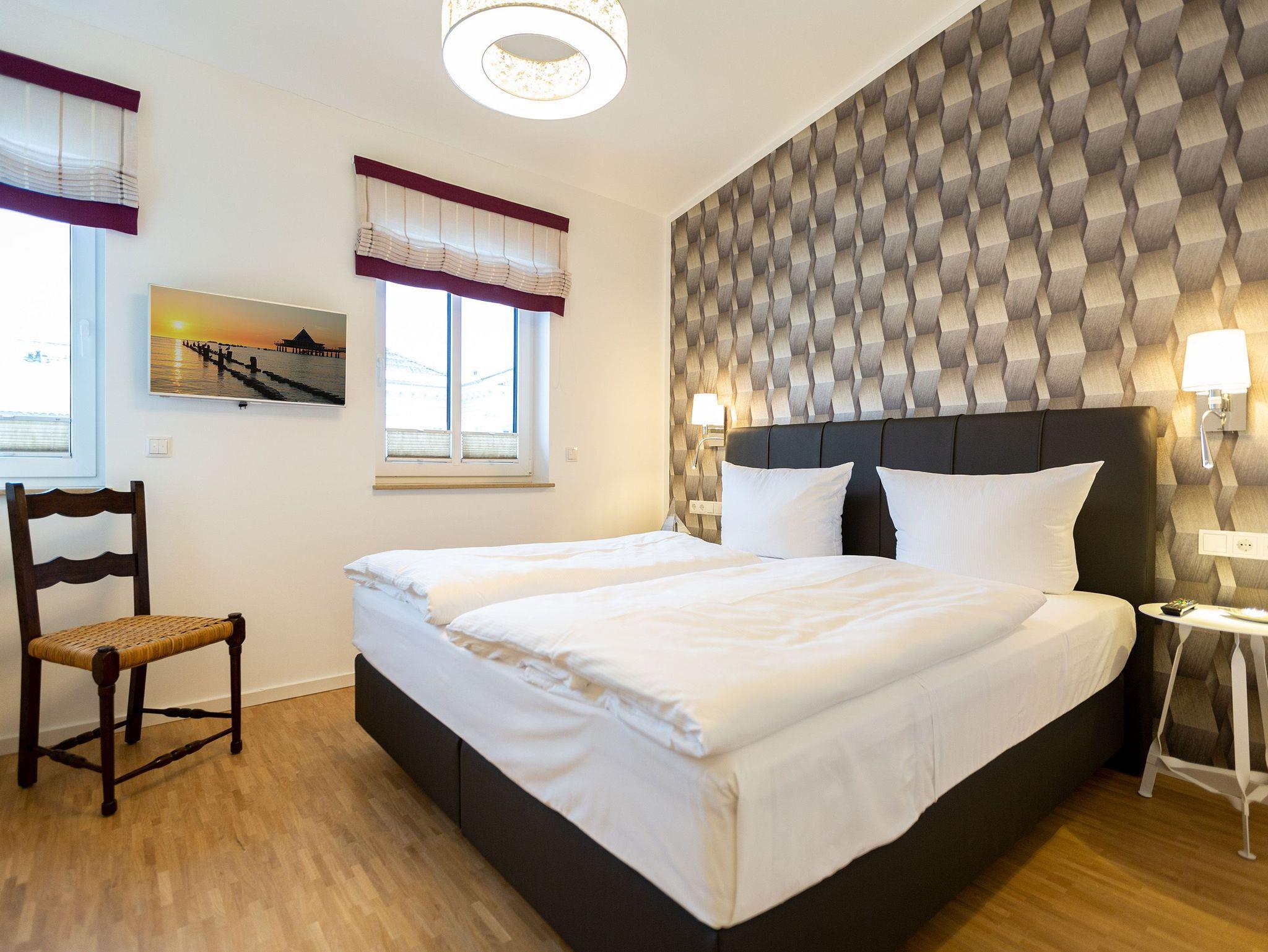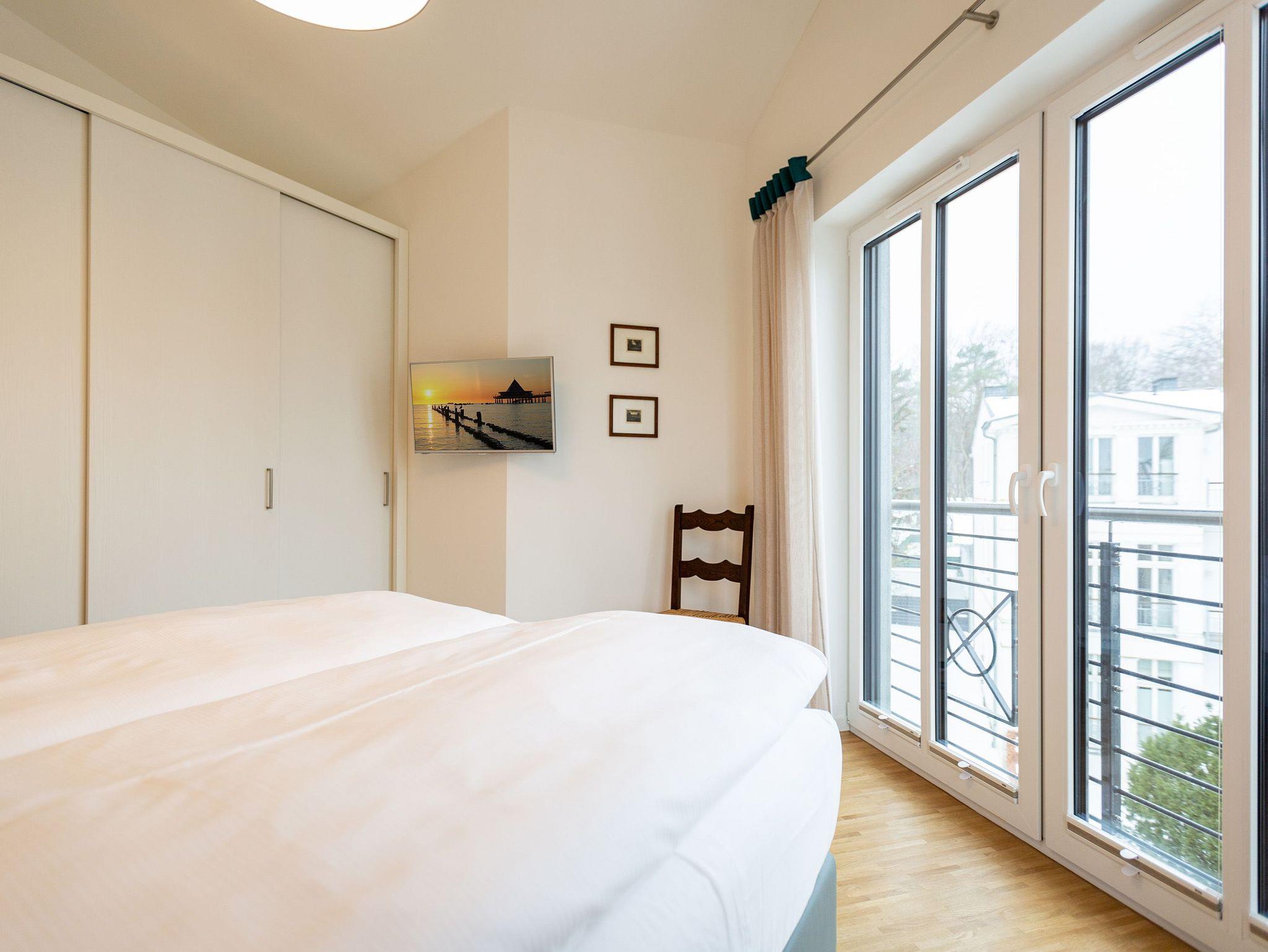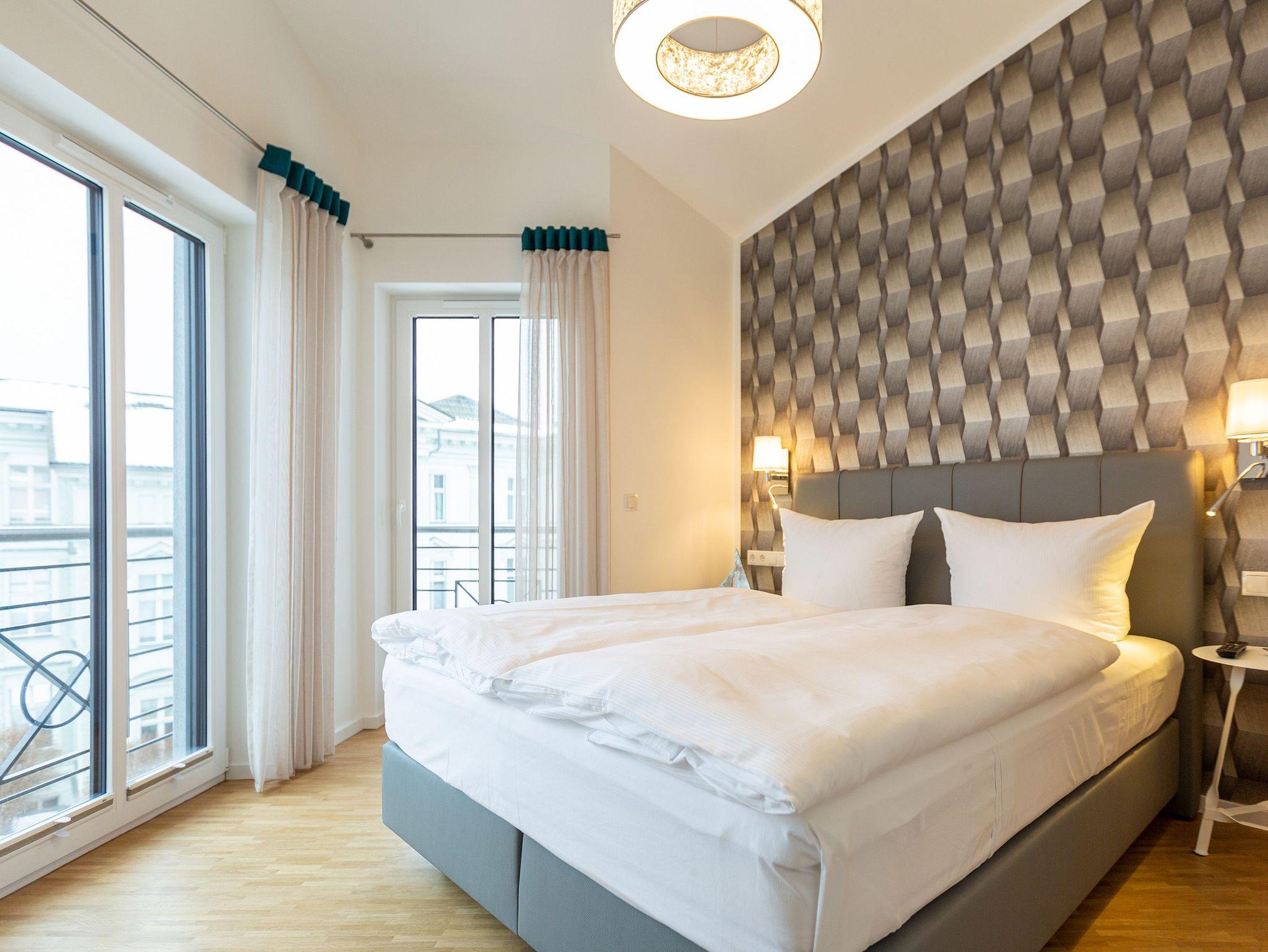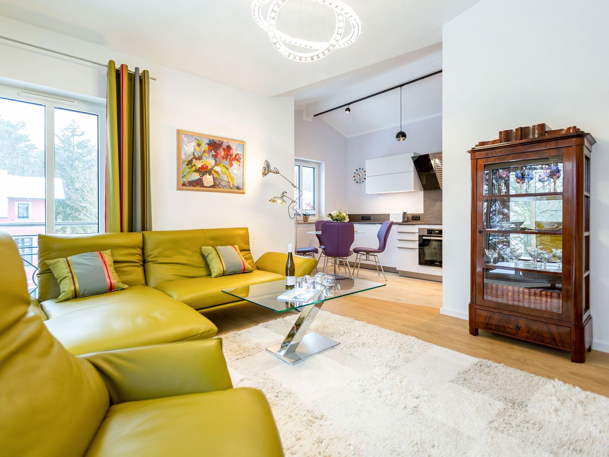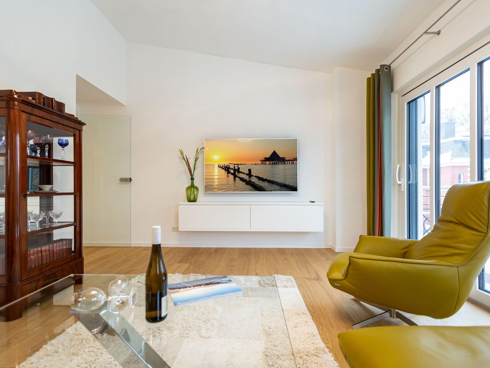 Das Appartement Nummer 8 in der 3. Etage setzt auf seinen 79 Quadratmetern gleich mehrere Akzente: Farbakzente, Lichtakzente und Designakzente. Alles zusammen sorgt dafür, dass sich die bis zu vier Personen in dem Drei-Zimmer-Urlaubsdomizil rundum wohlfühlen. Hier ist nichts 0815. Schon gar nicht die Farben. Dezent, aber dennoch präsent verleihen sie der Wohnung eine behagliche Atmosphäre: Von der lindgrünen Leder-Landschaft zum Faulenzen und Entspannen bis zum Indigo der Stühle rund um den Esstisch. Große, helle Räume sorgen für Leichtigkeit und Komfort. Treten Sie vom Wohnzimmer aus auf den sonnigen Süd-Ost-Balkon (6 Quadratmeter) und atmen Sie die gesunde Ostseeluft tief in sich ein. Ebenfalls an das geräumige Wohnzimmer angeschlossen, ist die offene Küche mit einer voll ausgestattete Küchenzeile und einem schönen Essplatz. Alle Geräte sind Markengeräte. Ein komplettes Geschirr-Service finden Sie in den Schränken. Auch die beiden Schlafzimmer empfangen den Gast mit modernem Design. Jedes verfügt über ein Boxspringdoppelbett (eines 1,80 m x 2,00 m, das zweite 1,60 m x 2,00 m) sowie einen extra angefertigten Kleiderschrank. Alle drei Zimmer des Appartements sind mit einem Flat-TV ausgestattet. In den beiden Badezimmern sind je eine Dusche und eine Toilette vorhanden. Darüber hinaus besitzt das Masterbad eine Badewanne und ein Bidet. Handtücher liegen selbstverständlich bereit und auch die Betten sind bereits bezogen. Zu dem Appartement gehört der Außenstellplatz Nummer 8 im Hof. In einem separaten und abschließbaren Kellerraum befindet sich eine Ladestation für E-Bikes. Der WLAN-Zugang ist kostenfrei. Sie brauchen also nur ankommen, mit dem Fahrstuhl in die 3. Etage fahren und schon sind Sie mitten im Urlaub.