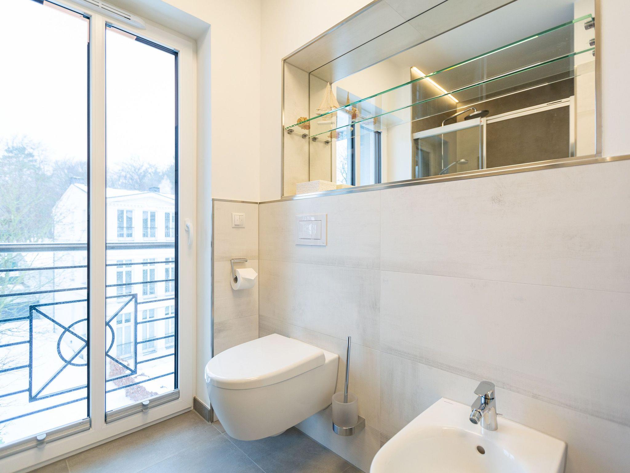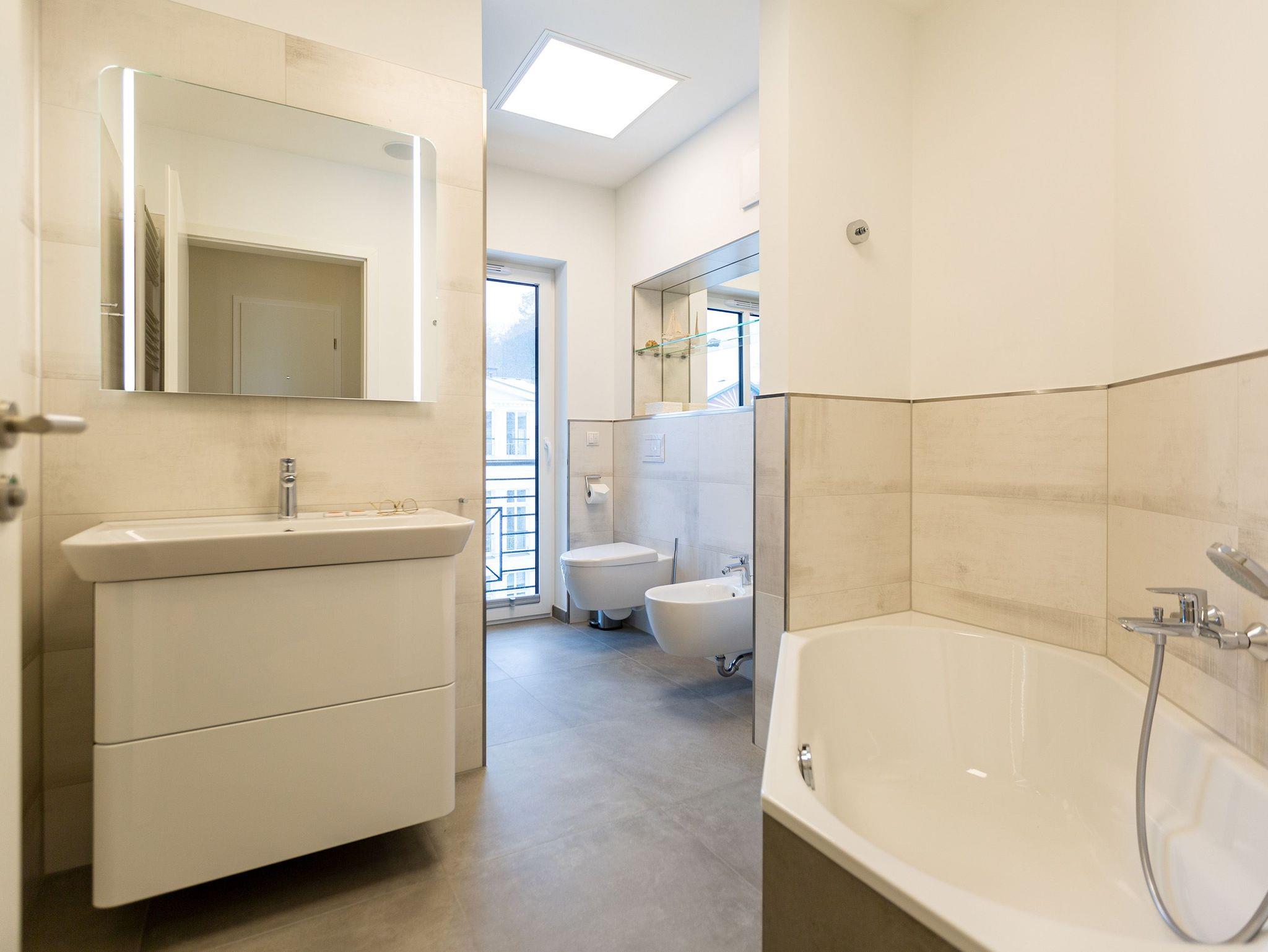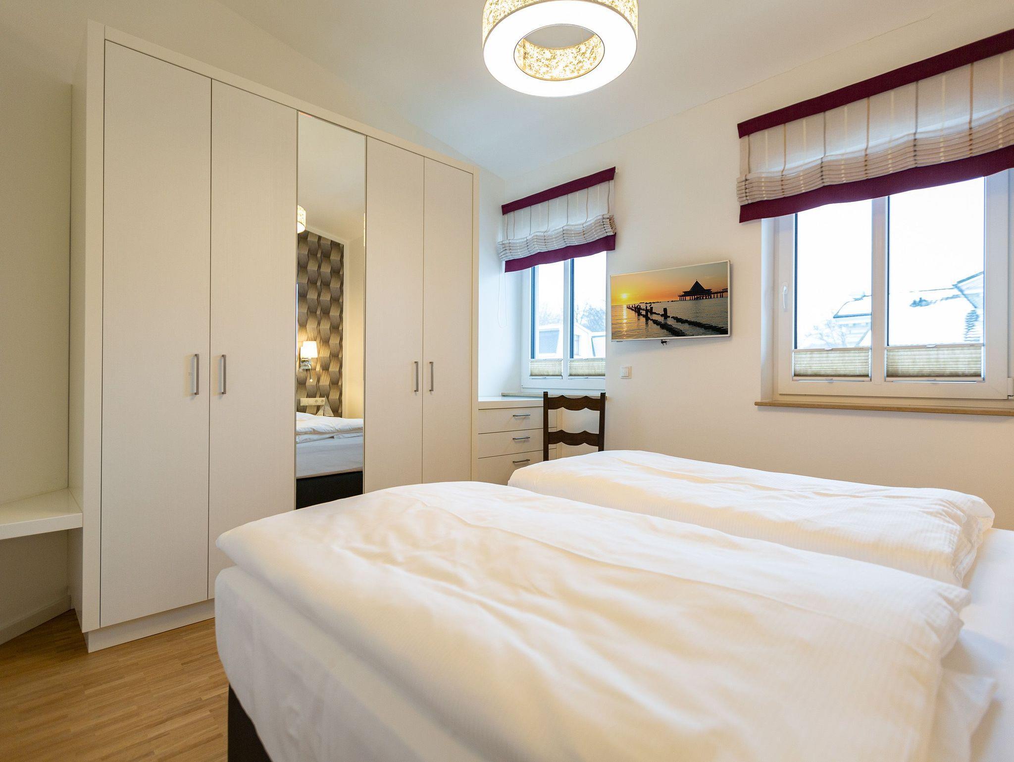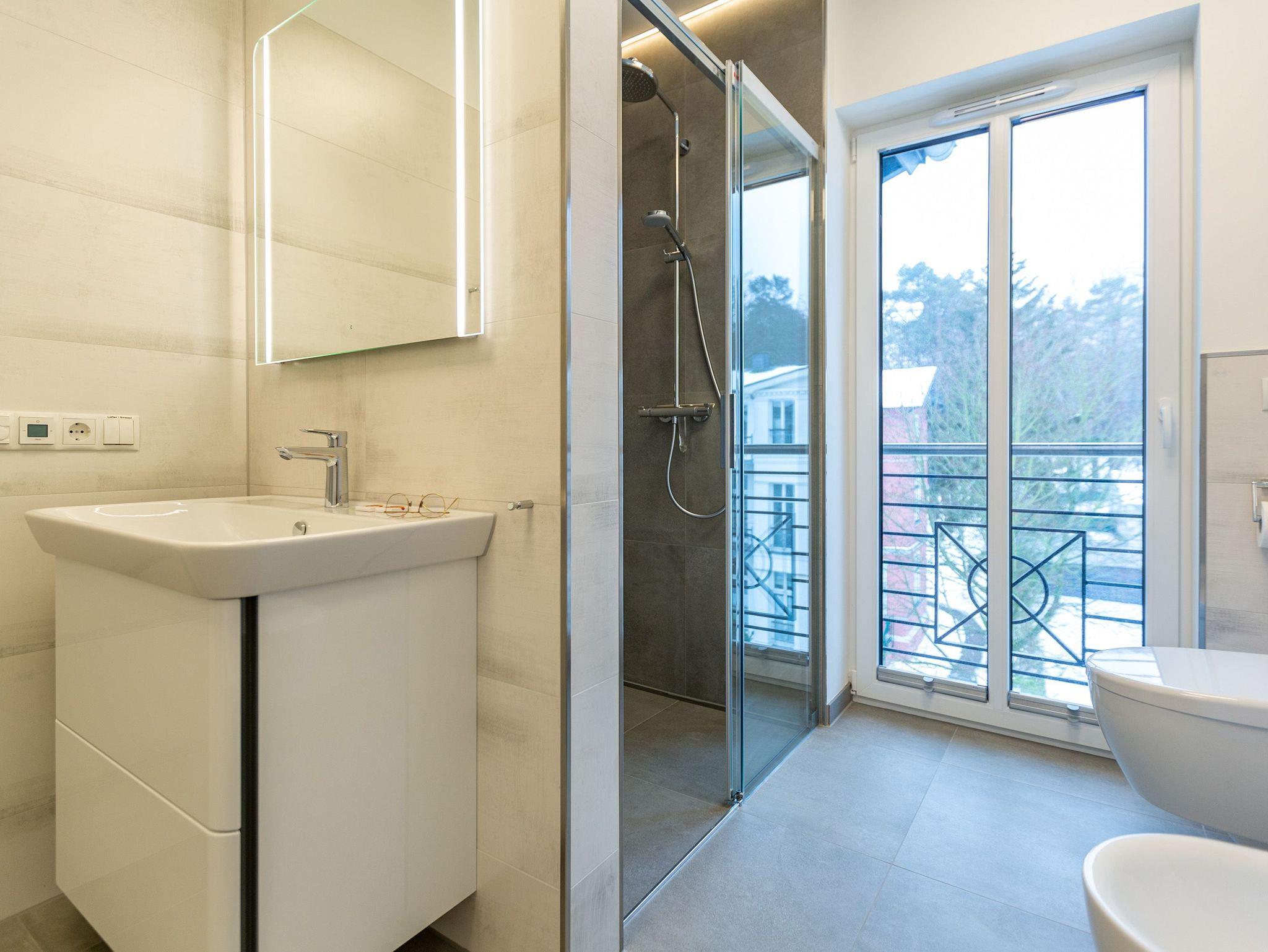 Das Appartement Nummer 8 in der 3. Etage setzt auf seinen 79 Quadratmetern gleich mehrere Akzente: Farbakzente, Lichtakzente und Designakzente. Alles zusammen sorgt dafür, dass sich die bis zu vier Personen in dem Drei-Zimmer-Urlaubsdomizil rundum wohlfühlen. Hier ist nichts 0815. Schon gar nicht die Farben. Dezent, aber dennoch präsent verleihen sie der Wohnung eine behagliche Atmosphäre: Von der lindgrünen Leder-Landschaft zum Faulenzen und Entspannen bis zum Indigo der Stühle rund um den Esstisch. Große, helle Räume sorgen für Leichtigkeit und Komfort. Treten Sie vom Wohnzimmer aus auf den sonnigen Süd-Ost-Balkon (6 Quadratmeter) und atmen Sie die gesunde Ostseeluft tief in sich ein. Ebenfalls an das geräumige Wohnzimmer angeschlossen, ist die offene Küche mit einer voll ausgestattete Küchenzeile und einem schönen Essplatz. Alle Geräte sind Markengeräte. Ein komplettes Geschirr-Service finden Sie in den Schränken. Auch die beiden Schlafzimmer empfangen den Gast mit modernem Design. Jedes verfügt über ein Boxspringdoppelbett (eines 1,80 m x 2,00 m, das zweite 1,60 m x 2,00 m) sowie einen extra angefertigten Kleiderschrank. Alle drei Zimmer des Appartements sind mit einem Flat-TV ausgestattet. In den beiden Badezimmern sind je eine Dusche und eine Toilette vorhanden. Darüber hinaus besitzt das Masterbad eine Badewanne und ein Bidet. Handtücher liegen selbstverständlich bereit und auch die Betten sind bereits bezogen. Zu dem Appartement gehört der Außenstellplatz Nummer 8 im Hof. In einem separaten und abschließbaren Kellerraum befindet sich eine Ladestation für E-Bikes. Der WLAN-Zugang ist kostenfrei. Sie brauchen also nur ankommen, mit dem Fahrstuhl in die 3. Etage fahren und schon sind Sie mitten im Urlaub.