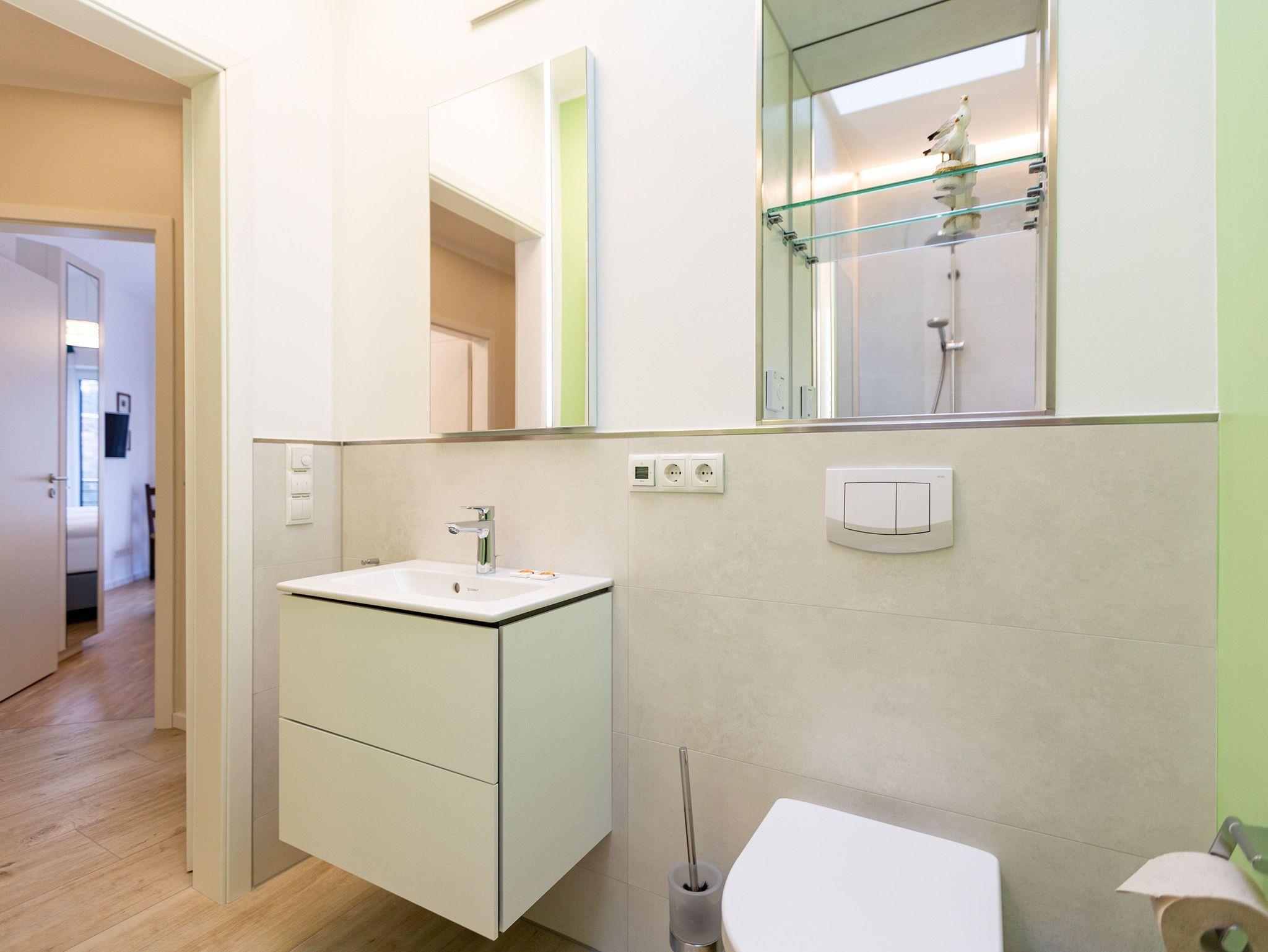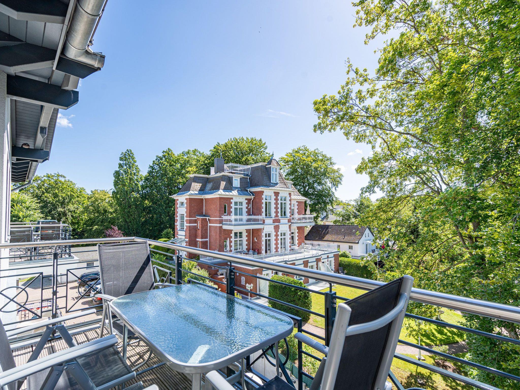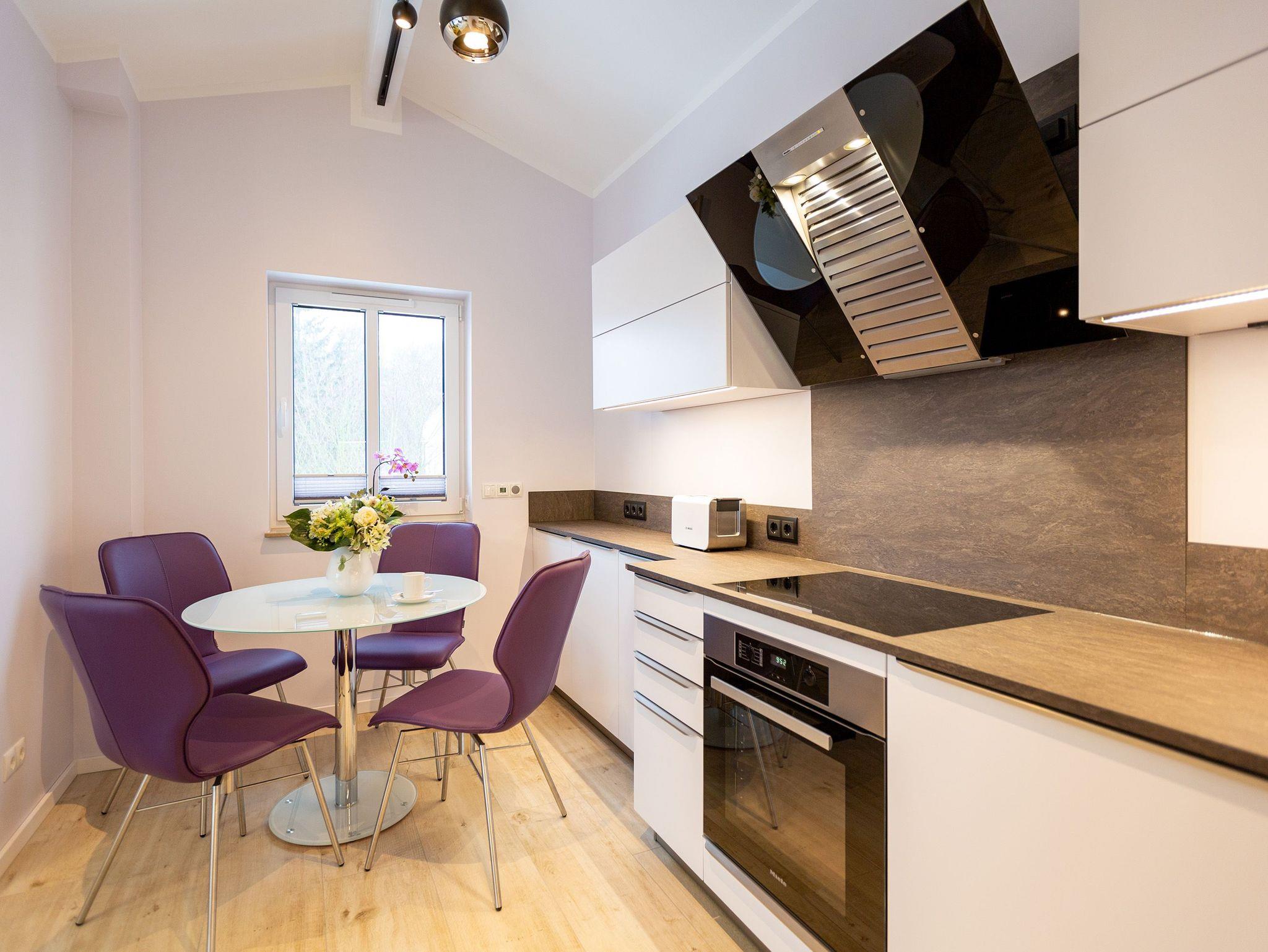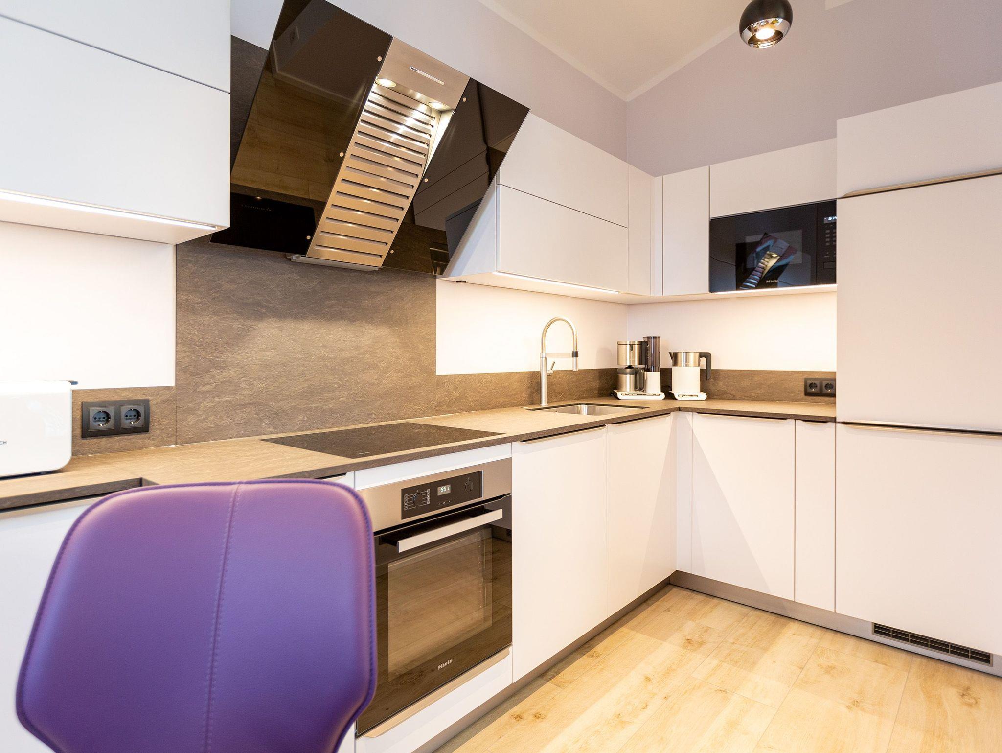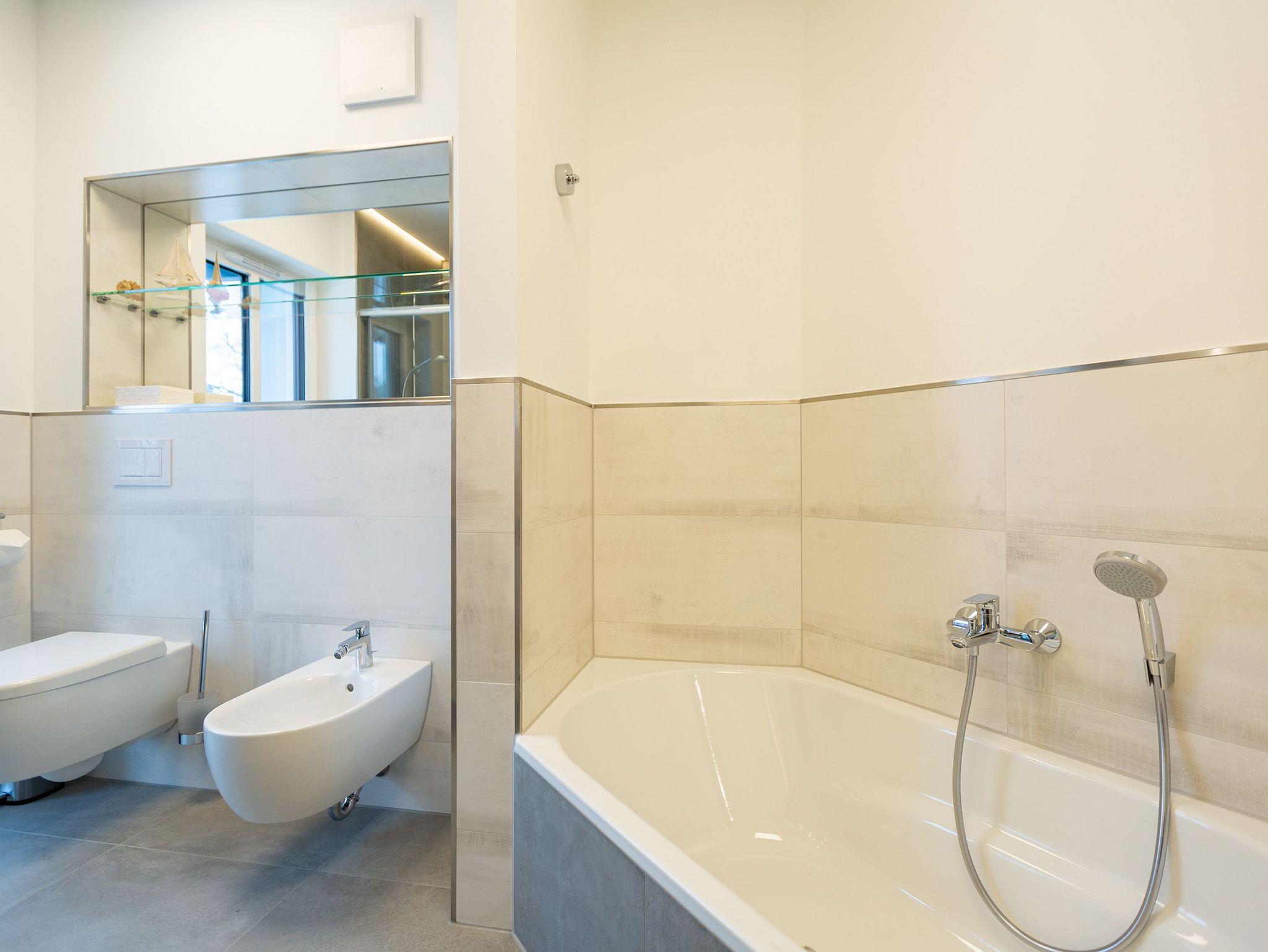 Das Appartement Nummer 8 in der 3. Etage setzt auf seinen 79 Quadratmetern gleich mehrere Akzente: Farbakzente, Lichtakzente und Designakzente. Alles zusammen sorgt dafür, dass sich die bis zu vier Personen in dem Drei-Zimmer-Urlaubsdomizil rundum wohlfühlen. Hier ist nichts 0815. Schon gar nicht die Farben. Dezent, aber dennoch präsent verleihen sie der Wohnung eine behagliche Atmosphäre: Von der lindgrünen Leder-Landschaft zum Faulenzen und Entspannen bis zum Indigo der Stühle rund um den Esstisch. Große, helle Räume sorgen für Leichtigkeit und Komfort. Treten Sie vom Wohnzimmer aus auf den sonnigen Süd-Ost-Balkon (6 Quadratmeter) und atmen Sie die gesunde Ostseeluft tief in sich ein. Ebenfalls an das geräumige Wohnzimmer angeschlossen, ist die offene Küche mit einer voll ausgestattete Küchenzeile und einem schönen Essplatz. Alle Geräte sind Markengeräte. Ein komplettes Geschirr-Service finden Sie in den Schränken. Auch die beiden Schlafzimmer empfangen den Gast mit modernem Design. Jedes verfügt über ein Boxspringdoppelbett (eines 1,80 m x 2,00 m, das zweite 1,60 m x 2,00 m) sowie einen extra angefertigten Kleiderschrank. Alle drei Zimmer des Appartements sind mit einem Flat-TV ausgestattet. In den beiden Badezimmern sind je eine Dusche und eine Toilette vorhanden. Darüber hinaus besitzt das Masterbad eine Badewanne und ein Bidet. Handtücher liegen selbstverständlich bereit und auch die Betten sind bereits bezogen. Zu dem Appartement gehört der Außenstellplatz Nummer 8 im Hof. In einem separaten und abschließbaren Kellerraum befindet sich eine Ladestation für E-Bikes. Der WLAN-Zugang ist kostenfrei. Sie brauchen also nur ankommen, mit dem Fahrstuhl in die 3. Etage fahren und schon sind Sie mitten im Urlaub.