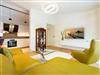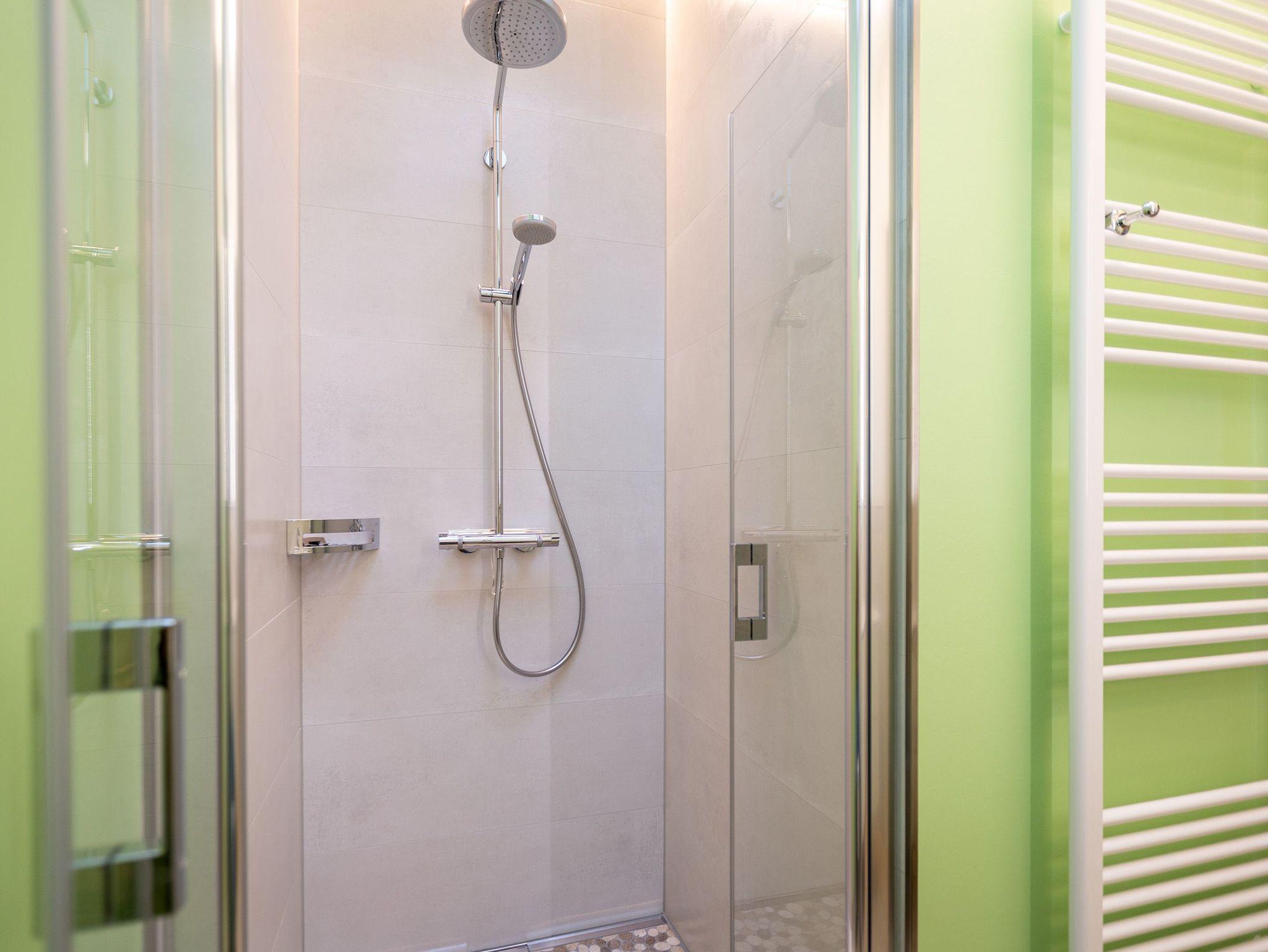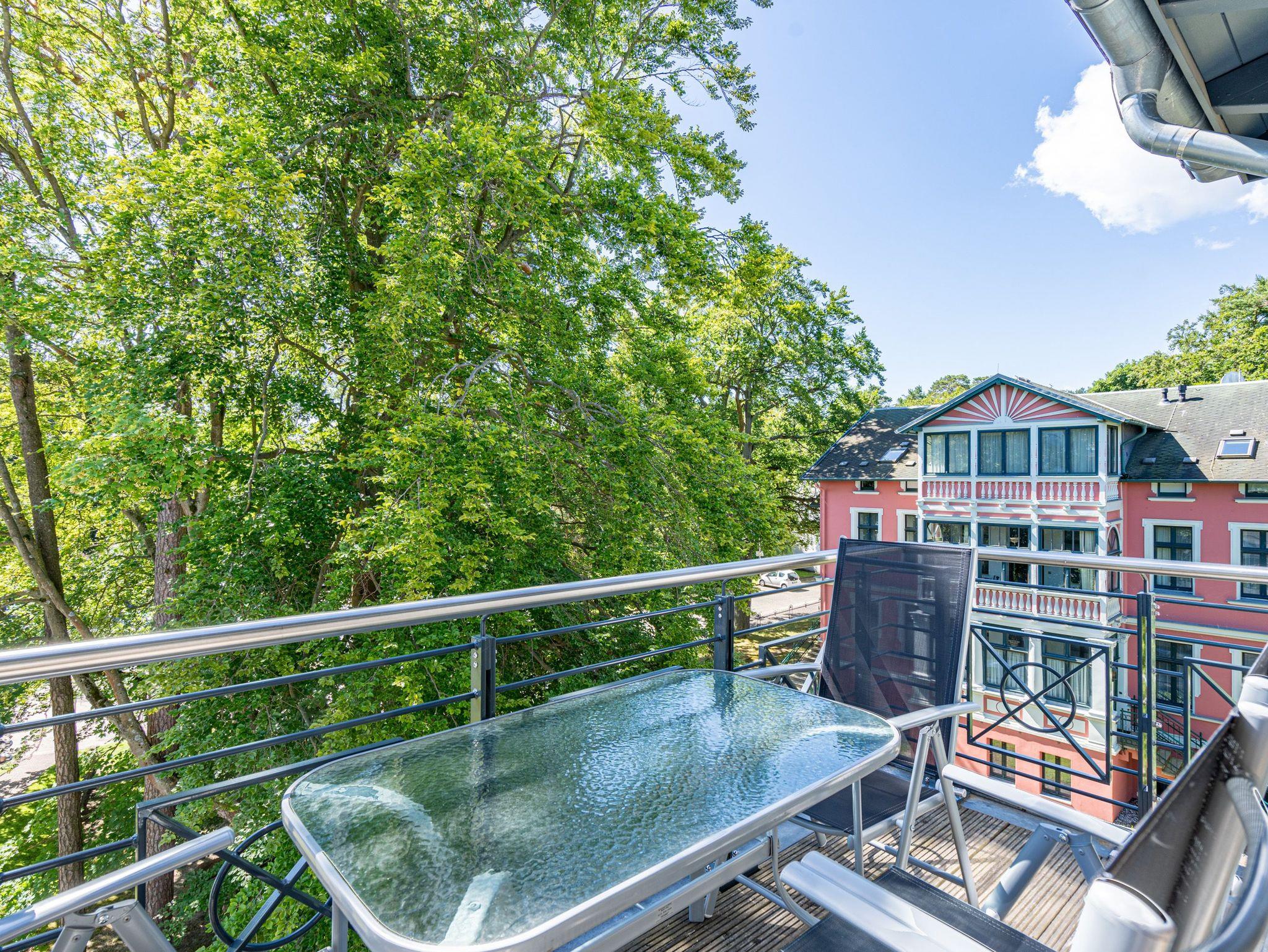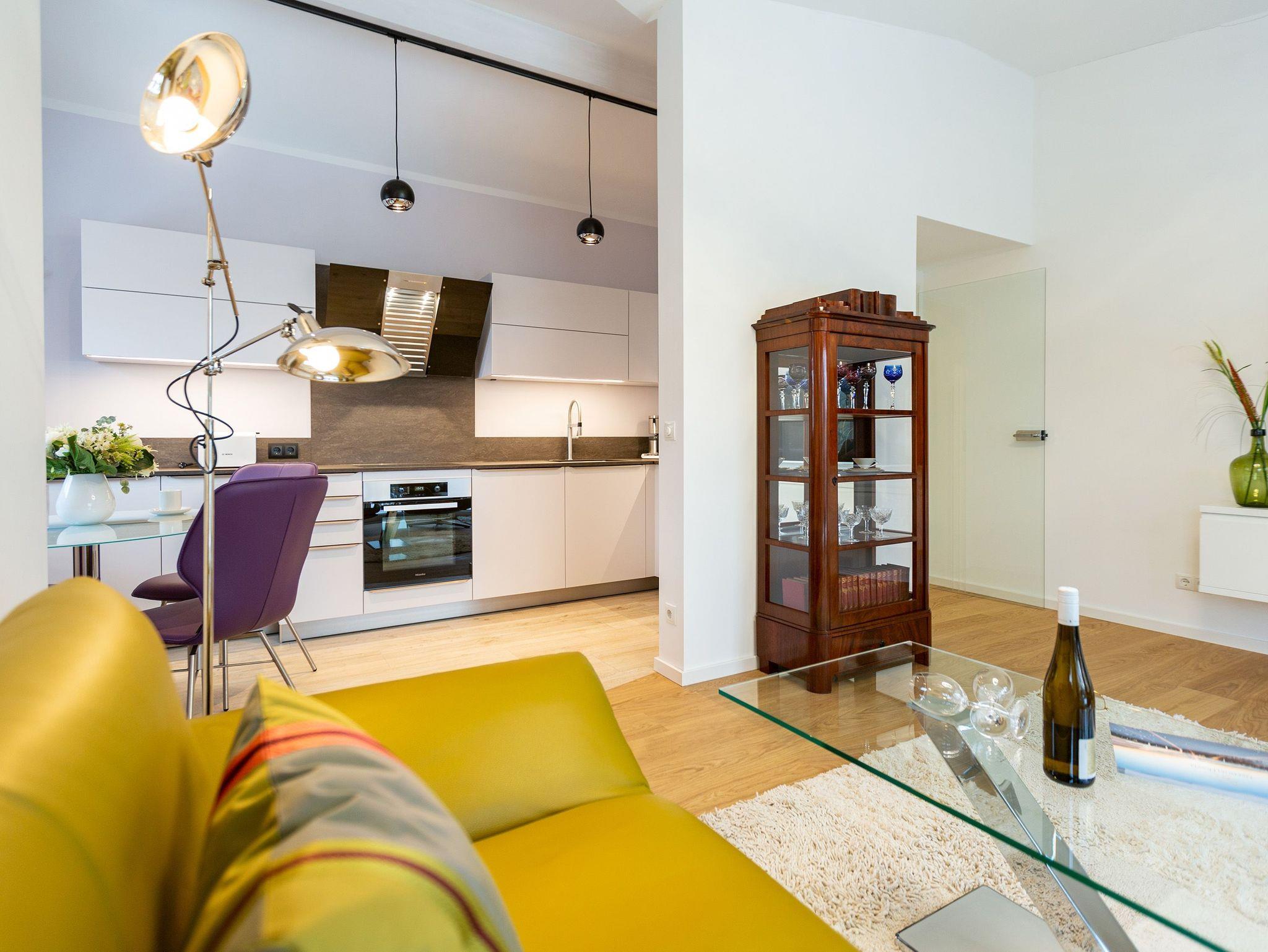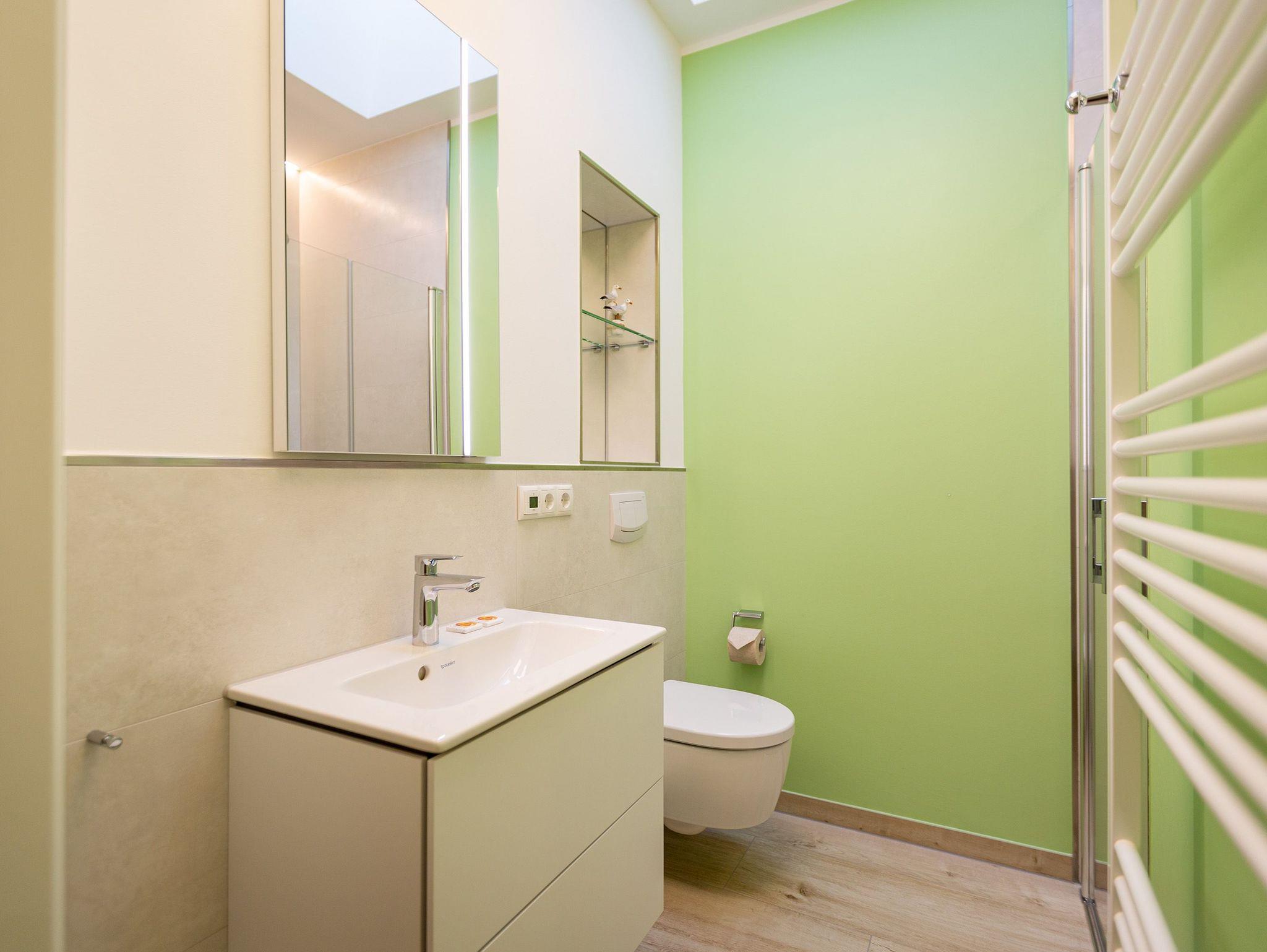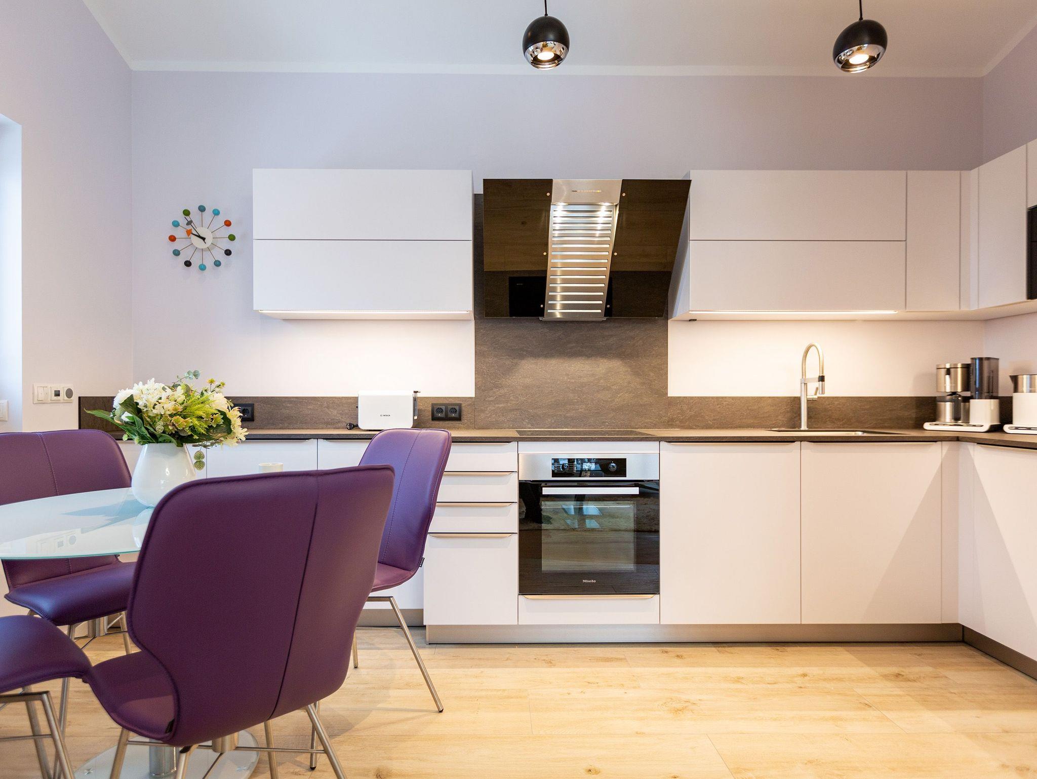 Das Appartement Nummer 8 in der 3. Etage setzt auf seinen 79 Quadratmetern gleich mehrere Akzente: Farbakzente, Lichtakzente und Designakzente. Alles zusammen sorgt dafür, dass sich die bis zu vier Personen in dem Drei-Zimmer-Urlaubsdomizil rundum wohlfühlen. Hier ist nichts 0815. Schon gar nicht die Farben. Dezent, aber dennoch präsent verleihen sie der Wohnung eine behagliche Atmosphäre: Von der lindgrünen Leder-Landschaft zum Faulenzen und Entspannen bis zum Indigo der Stühle rund um den Esstisch. Große, helle Räume sorgen für Leichtigkeit und Komfort. Treten Sie vom Wohnzimmer aus auf den sonnigen Süd-Ost-Balkon (6 Quadratmeter) und atmen Sie die gesunde Ostseeluft tief in sich ein. Ebenfalls an das geräumige Wohnzimmer angeschlossen, ist die offene Küche mit einer voll ausgestattete Küchenzeile und einem schönen Essplatz. Alle Geräte sind Markengeräte. Ein komplettes Geschirr-Service finden Sie in den Schränken. Auch die beiden Schlafzimmer empfangen den Gast mit modernem Design. Jedes verfügt über ein Boxspringdoppelbett (eines 1,80 m x 2,00 m, das zweite 1,60 m x 2,00 m) sowie einen extra angefertigten Kleiderschrank. Alle drei Zimmer des Appartements sind mit einem Flat-TV ausgestattet. In den beiden Badezimmern sind je eine Dusche und eine Toilette vorhanden. Darüber hinaus besitzt das Masterbad eine Badewanne und ein Bidet. Handtücher liegen selbstverständlich bereit und auch die Betten sind bereits bezogen. Zu dem Appartement gehört der Außenstellplatz Nummer 8 im Hof. In einem separaten und abschließbaren Kellerraum befindet sich eine Ladestation für E-Bikes. Der WLAN-Zugang ist kostenfrei. Sie brauchen also nur ankommen, mit dem Fahrstuhl in die 3. Etage fahren und schon sind Sie mitten im Urlaub.