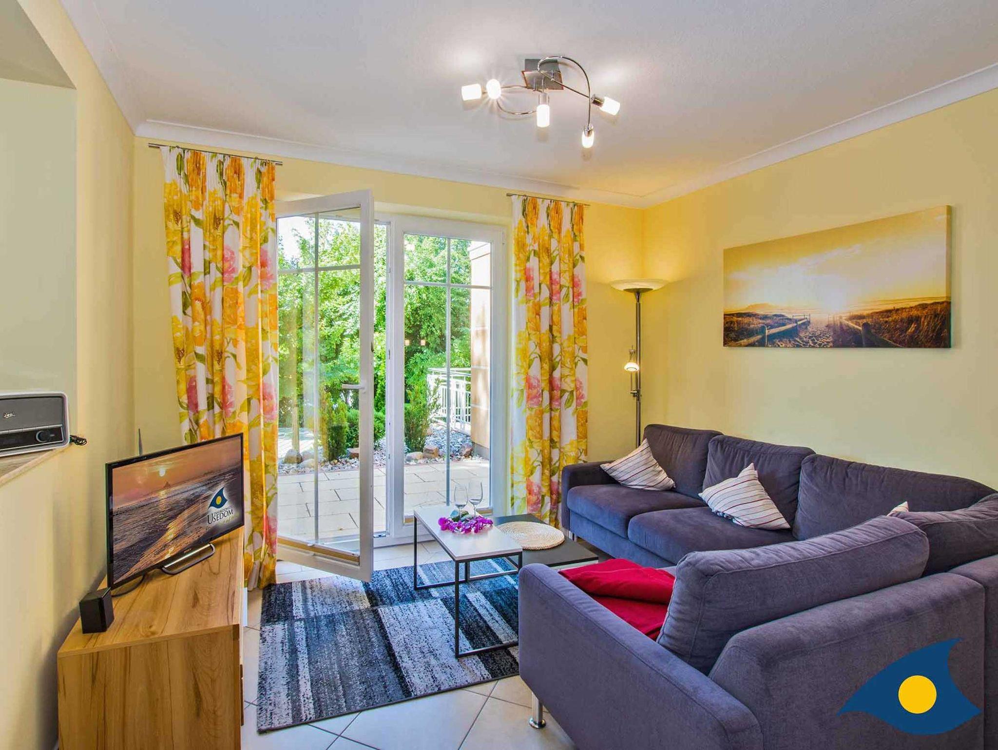 Das helle Wohnzimmer ist mit einem Esstisch für 4 Personen und einer gemütlichen Couchecke eingerichtet. LED-TV und ein Radio mit Bluetooth-Anschluss für ein Smartphone gehören zur Medienausstattung.