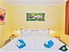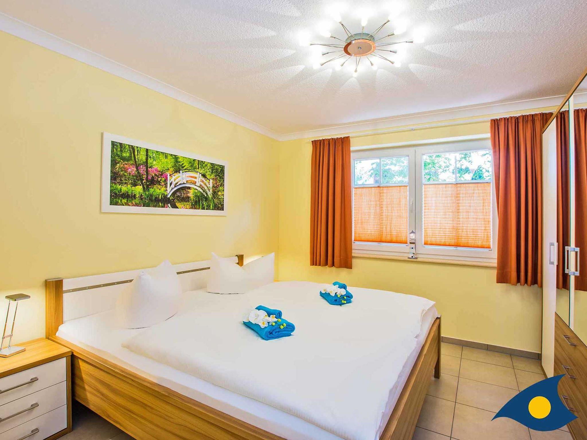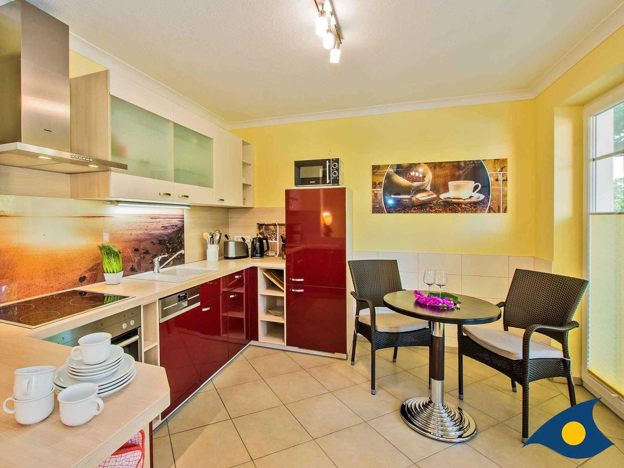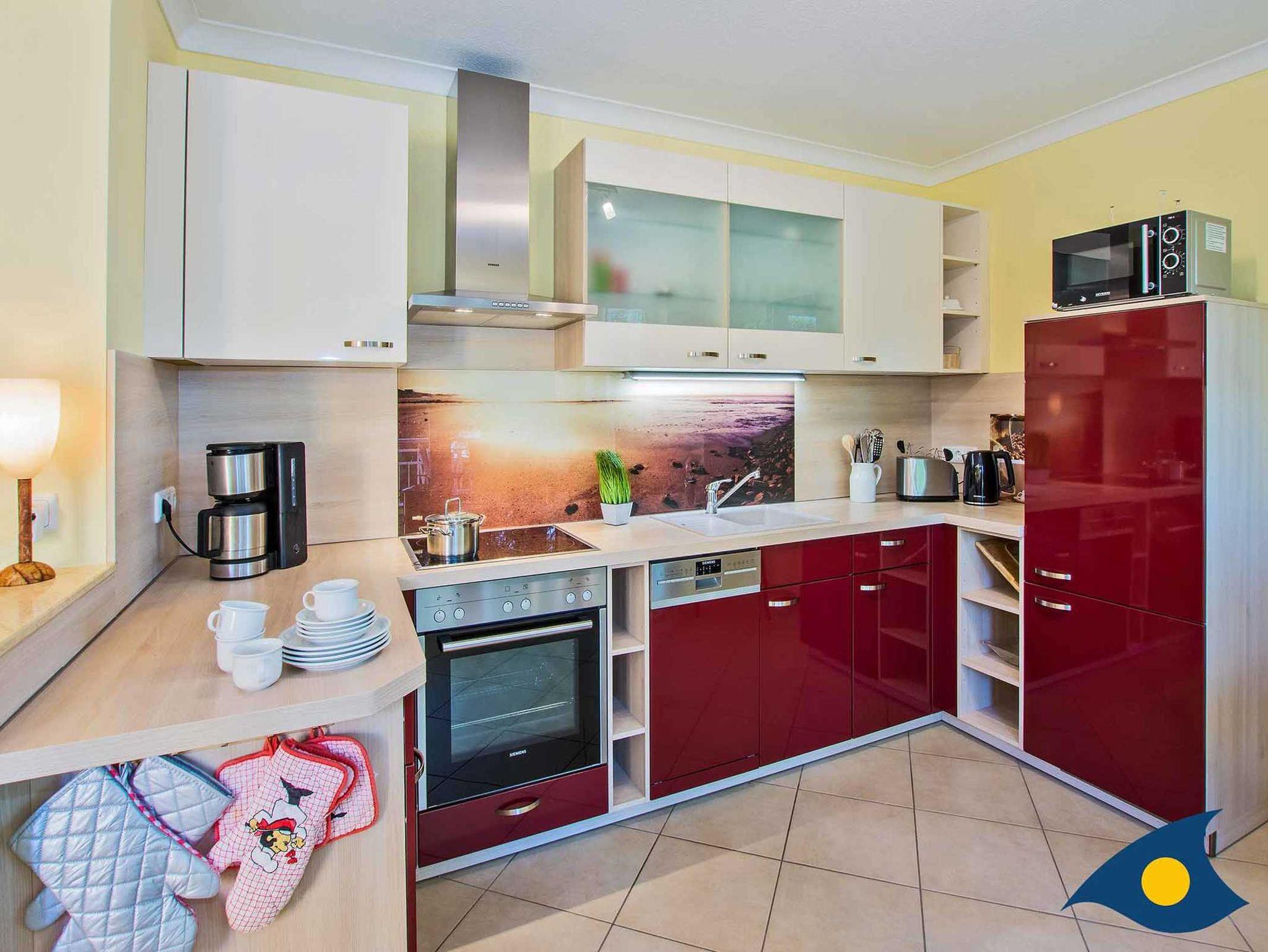 An den Wohnraum schließt sich über einen offenen Durchgang die moderne und komplett ausgestattete Vollküche an. Die beiden Schlafzimmer bieten ausreichend Schrankraum und sind mit Doppelbett bzw. mit zwei Einzelbetten ausgestattet, die bei Bedarf auch leicht zum Doppelbett kombinierbar sind.