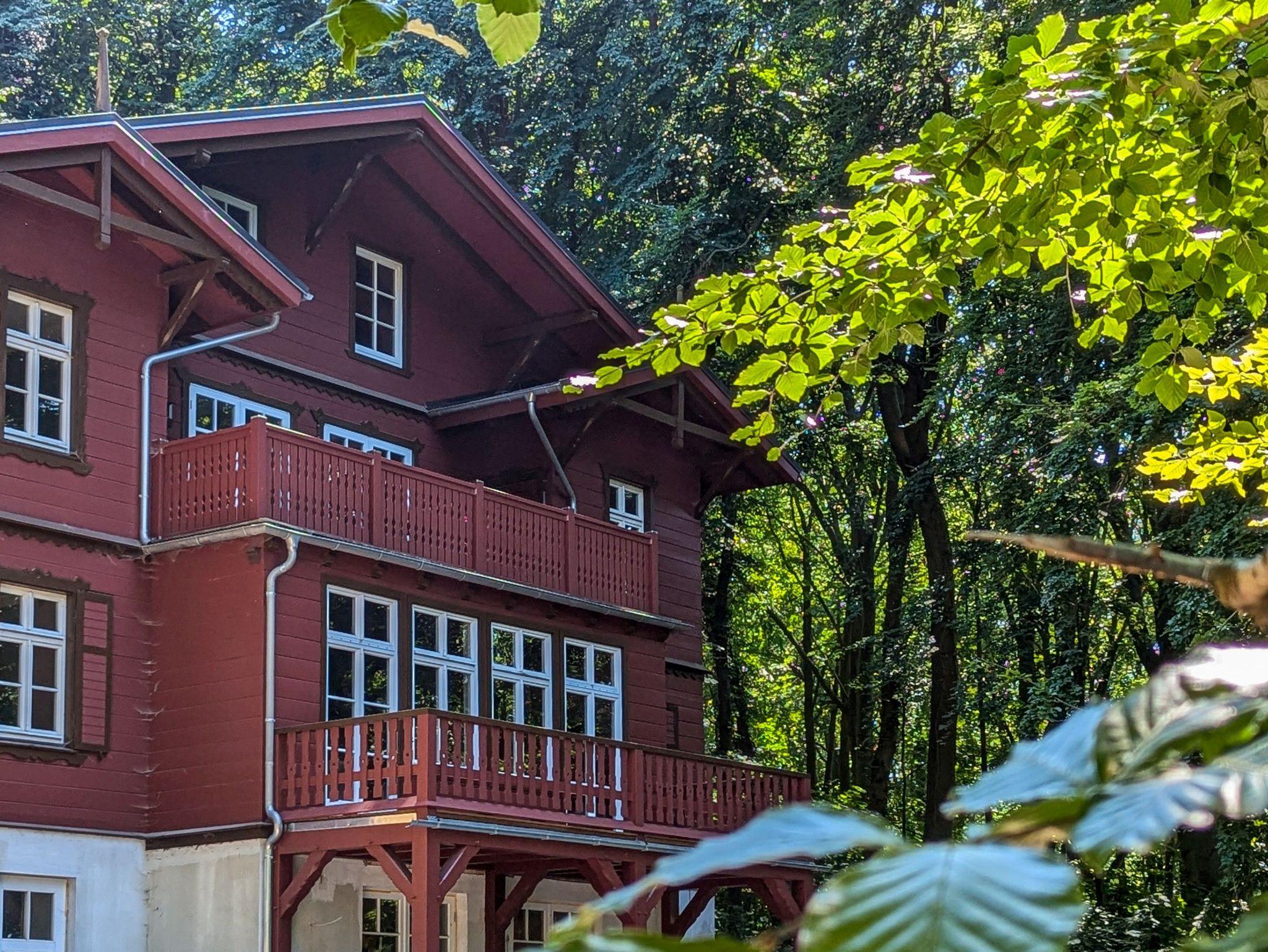 Eine Obergeschoss Wohnung (Größe folgt) mit 2 Schlafzimmern für 4 Personen; Ein Schlafzimmer mit einer Bettengröße von 160er (Blick Lindemannstraße/Hauptstaße/Wald); Ein Schlafzimmer mit einer Bettengröße von 180er mit einem Balkon (Blick in den Wald); Bad mit Dusche, WC und 2 Waschbecken; Küche auf dem Flur; Wohnzimmer mit 1 Sofa, 2 Sessel, Esstisch, 4 Stühlen und Balkon; Der Balkon kann von Schlafzimmer sowie Wohnzimmer betreten werden