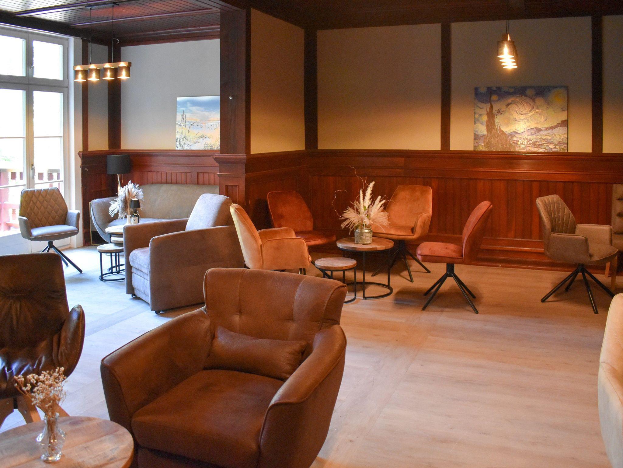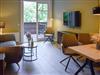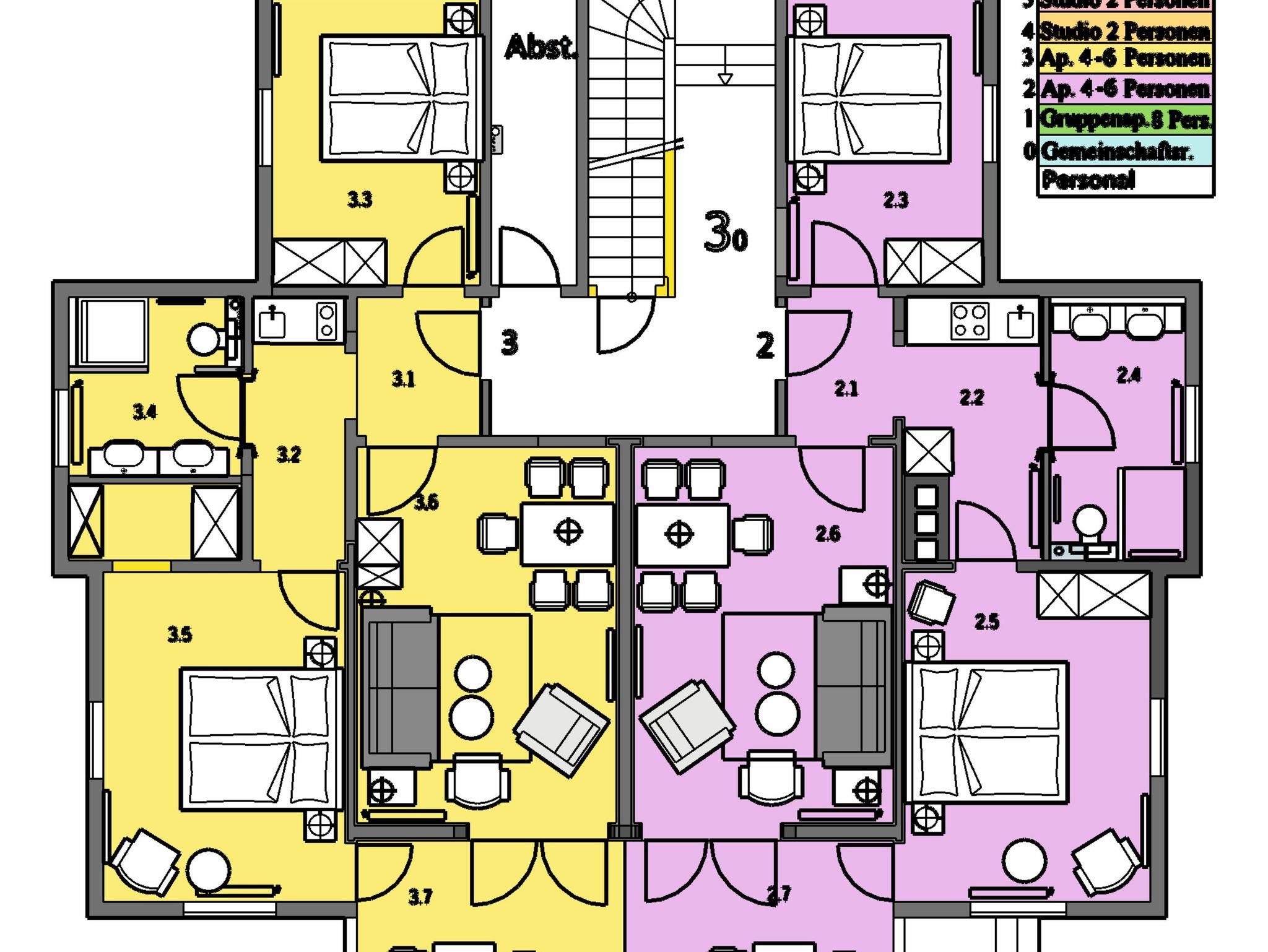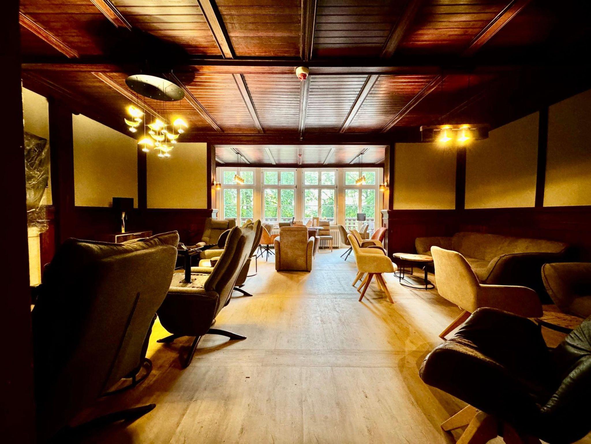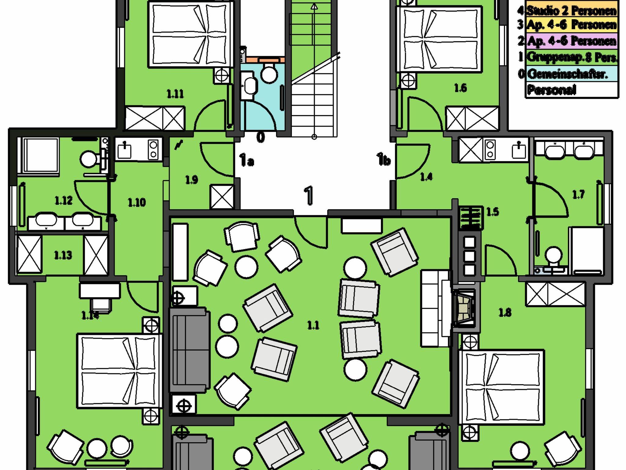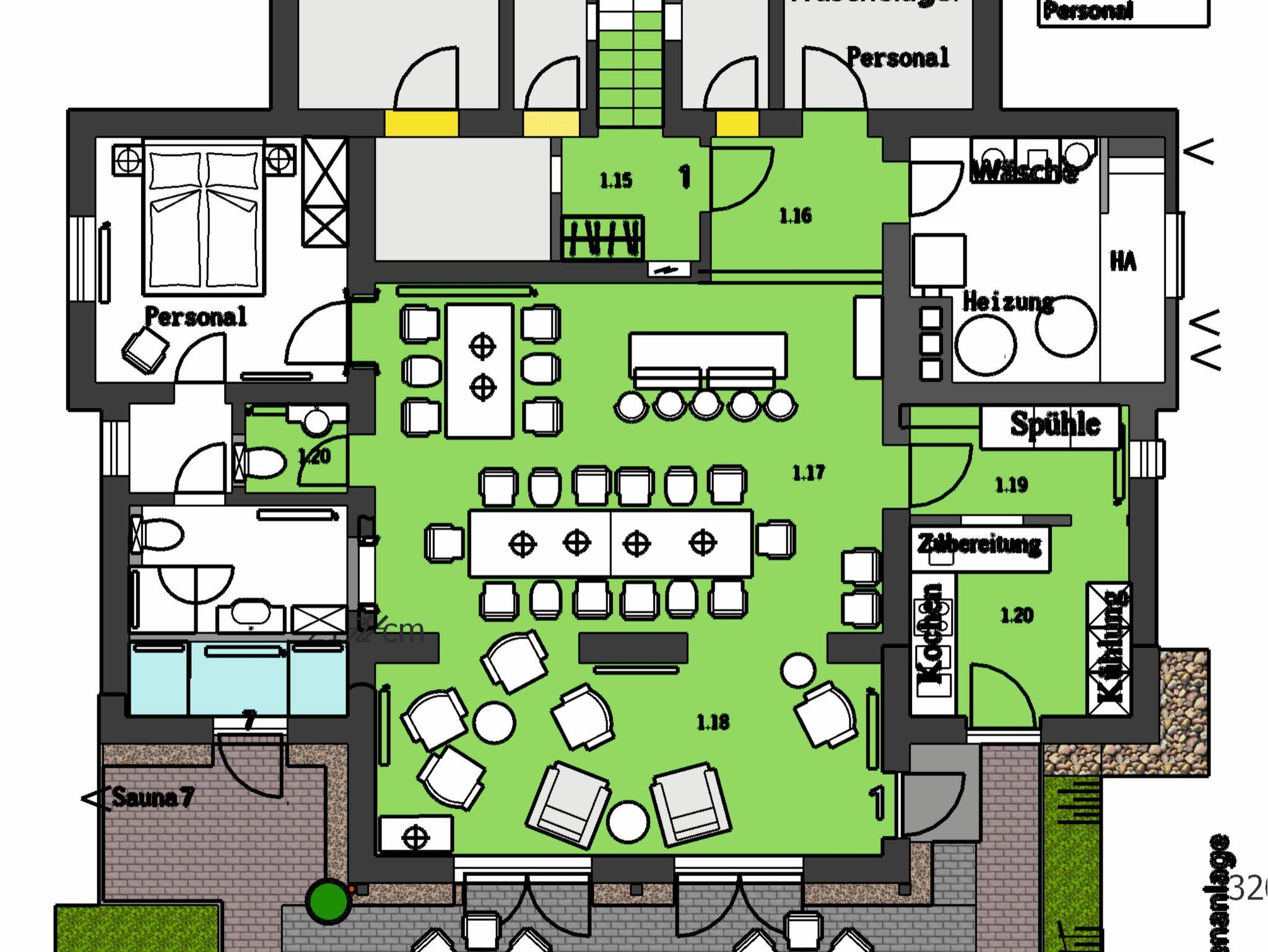 Kleine Wohnung 18 m² mit 1 Schlafzimmer für 2 Personen (Blick Kavaliersweg/Wald); Bad mit Dusche; Großer Essbereich 50 m² mit Tisch für 14 Personen, Tisch für 6 Personen, Bar mit 5 Barhockern, 7 Sesseln; Terrasse mit 2 Tischen für je 6 Personen; Küche 12 m² mit Herd, Spüle, Geschirrspüler, Kühlschrank, Anrichte