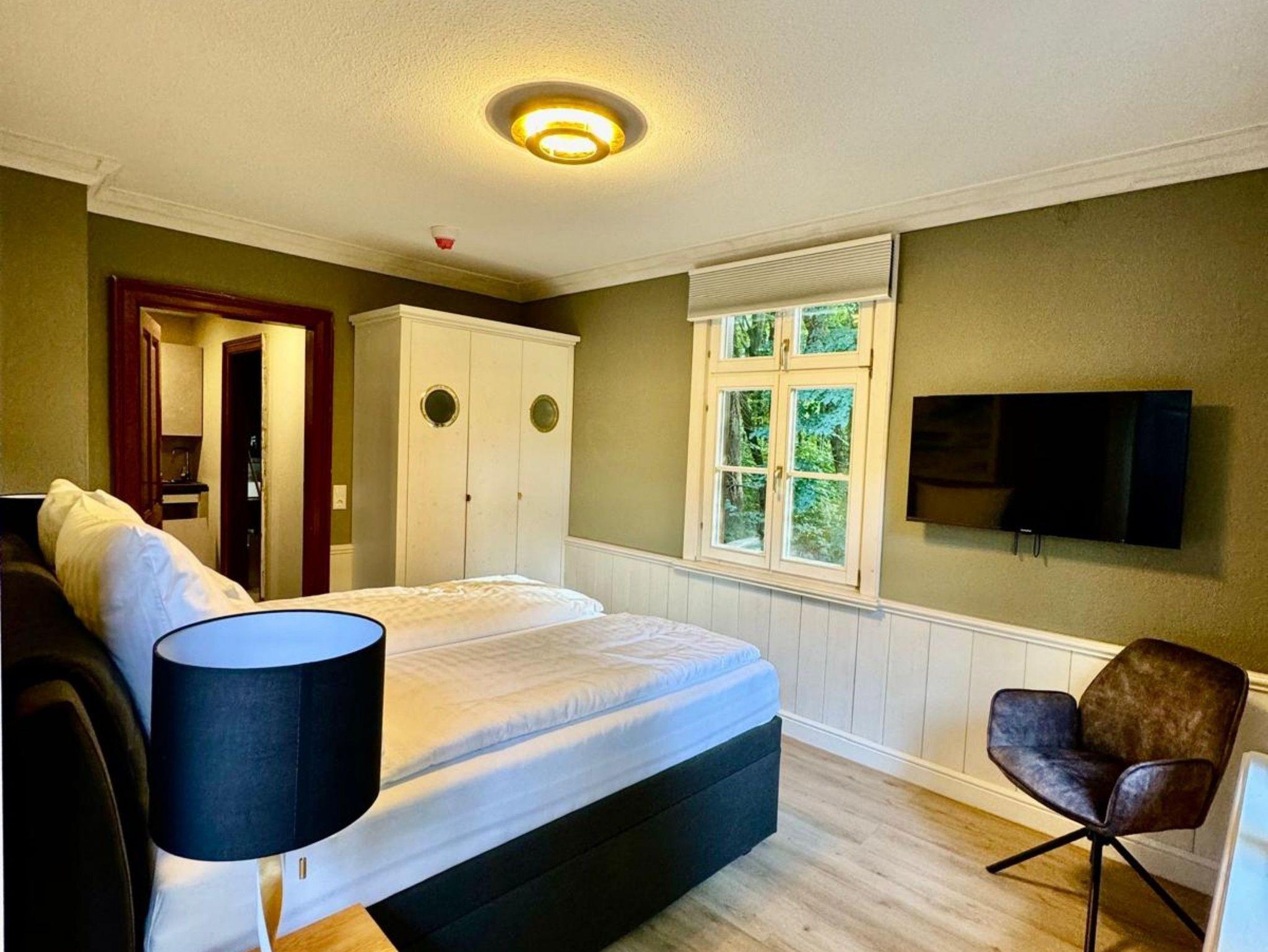 Eine Erdgeschoss Wohnung 37m² mit 2 Schlafzimmern für 4 Personen; Ein Schlafzimmer mit einer Bettengröße von 160er mit einem begehbaren Kleiderschrank (Blick Hauptstaße/Wald); Ein Schlafzimmer mit einer Bettengröße von 180er (Blick in den Wald); Bad mit Dusche, WC und 2 Waschbecken; Küche auf dem Flur