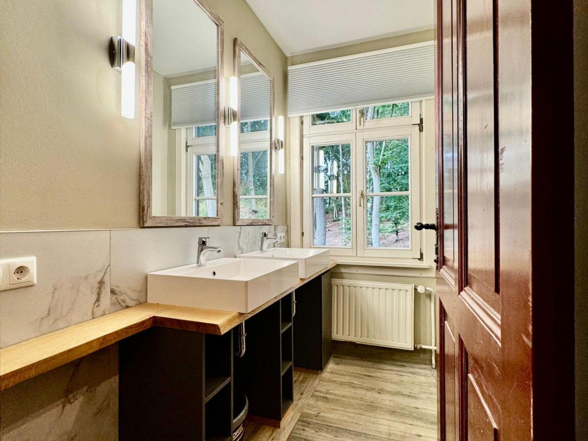 Eine Erdgeschoss Wohnung 37m² mit 2 Schlafzimmern für 4 Personen; Ein Schlafzimmer mit einer Bettengröße von 160er (Blick Hauptstaße/Lindemannstraße/Wald); Ein Schlafzimmer mit einer Bettengröße von 180er (Blick in den Wald); Bad mit Dusche, WC und 2 Waschbecken; Küche auf dem Flur