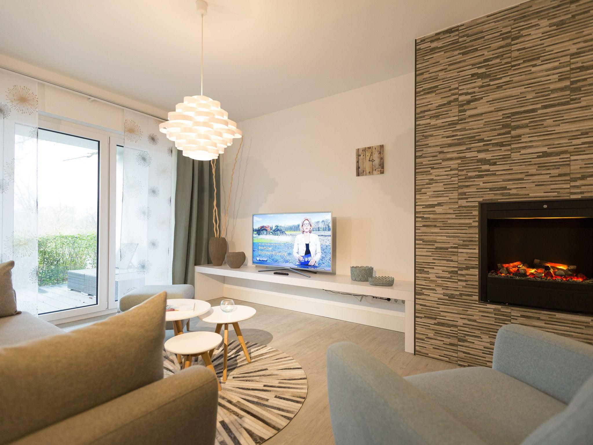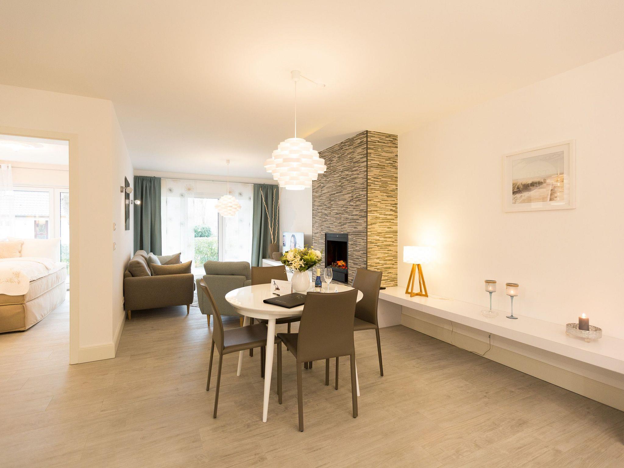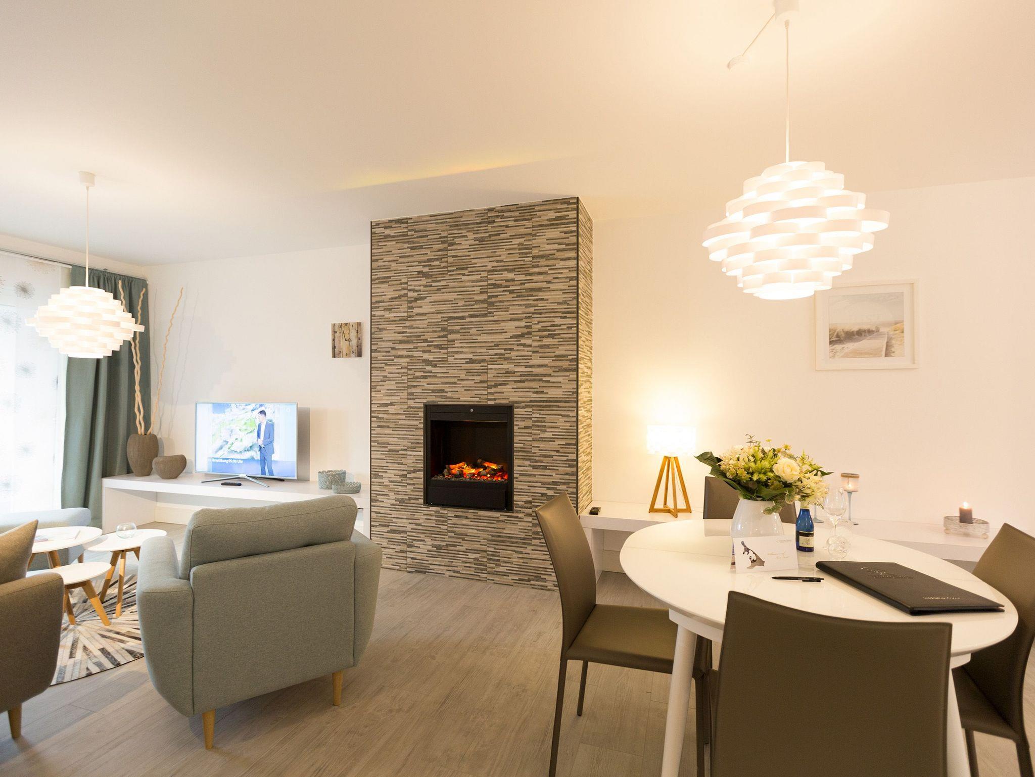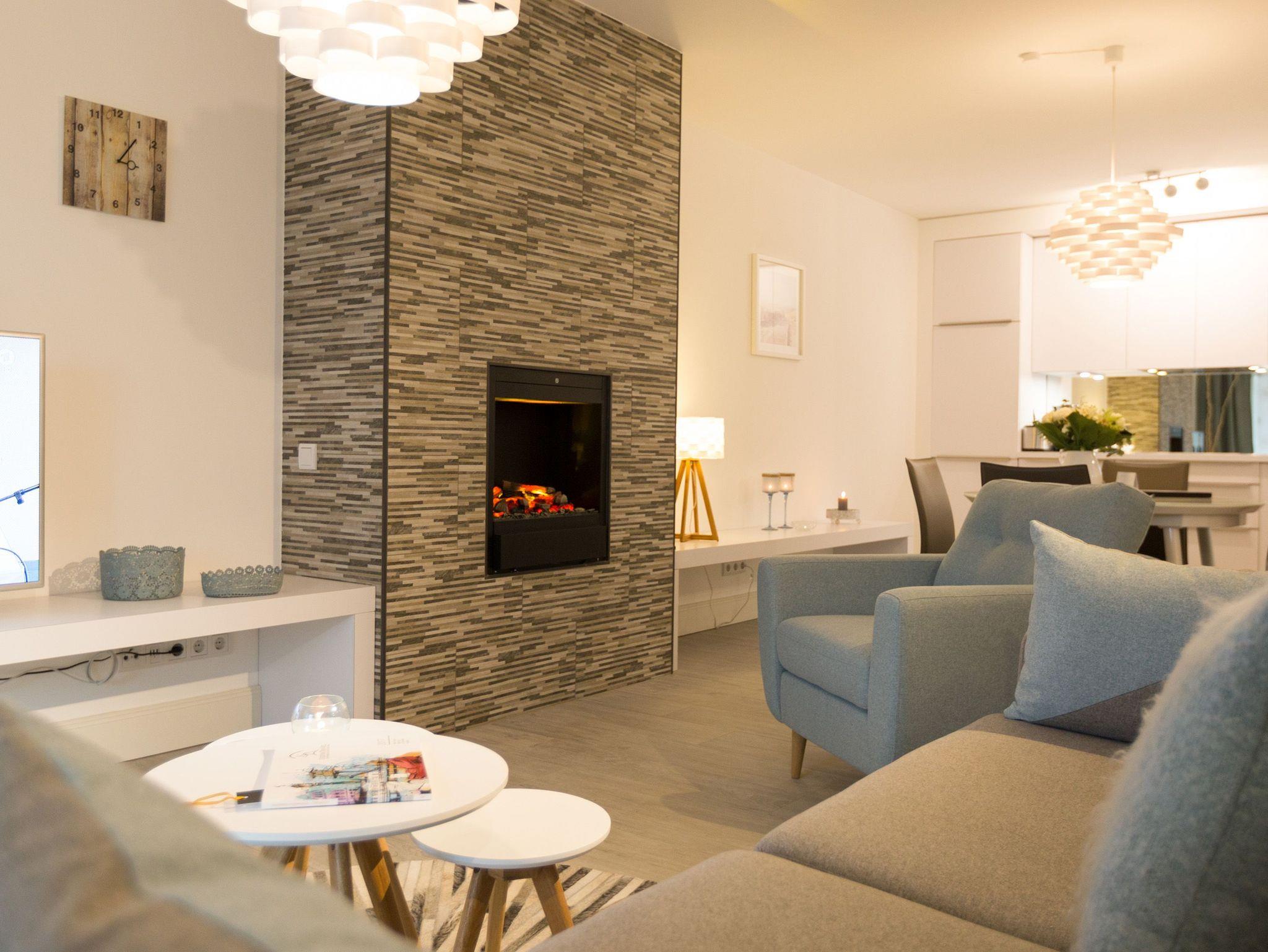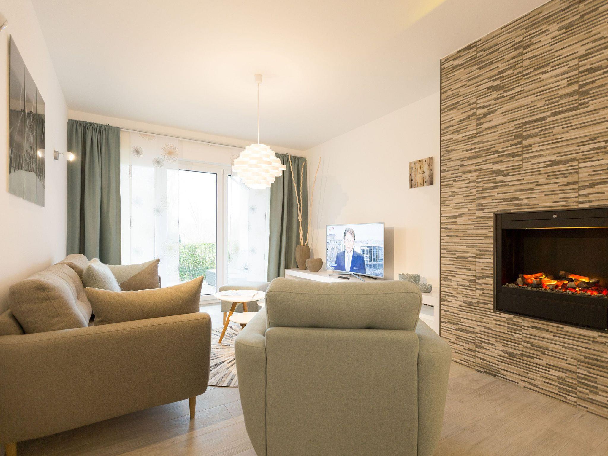 Er ist ein echter Hingucker schon beim Eintreten in dieses elegante und stilvolle Urlaubsappartement im Erdgeschoss der Dünenresidenz Heringsdorf ? der große, in Stein gefasste Elektro-Kamin. Sein warmes Licht sorgt nicht nur an kühlen Tagen für wohlige Behaglichkeit. Es wartet eine Wohlfühlwelt auf Sie, die auf 80 Quadratmetern reichlich Platz für bis zu vier Erwachsene bietet. Das gesamte Interieur ist harmonisch aufeinander abgestimmt. Stylisch sind auf alle Fälle die nordischen Design-Lampen. Abschalten und den Alltagsstress vergessen, lässt es sich auf der Sitzgruppe mit gemütlicher Couch und Blick auf den Kamin oder den großen Flat-TV wunderbar. Machen Sie die großen, bodentiefen Wohnzimmerfenster auf, lassen sie das Meeresrauschen vom nur 50 Meter entfernten Ostseestrand und die lichten Sonnenstrahlen in ihr Domizil oder entspannen Sie auf der 20 Quadratmeter großen Südterrasse. Zum Wohnbereich gehört eine helle, offene Küche mit großem Esstisch. Mit allem ausgestattet, was das Kochherz höher schlagen lässt, können Sie hier das gemütliche Zusammensitzen und Schlemmen wahrhaft zelebrieren. Haben Sie Spaß und einen erholsamen Schlaf in den beiden Schlafzimmern. Denn hier locken bequeme Doppelboxspringbetten (einmal 1,80 m x 2,00 m und einmal 1,60 m x 2,00 m), um Ihnen die Nächte zu versüßen. Das Badezimmer ist sehr geräumig und mit Waschtisch, WC und großer Echtglas-Dusche ausgestattet. Die Betten sind bezogen und Handtücher liegen bei Ankunft bereit. Zu der Wohnung gehört ein Pkw-Stellplatz in der Tiefgarage (max. Einfahrtshöhe 1,93 m).
