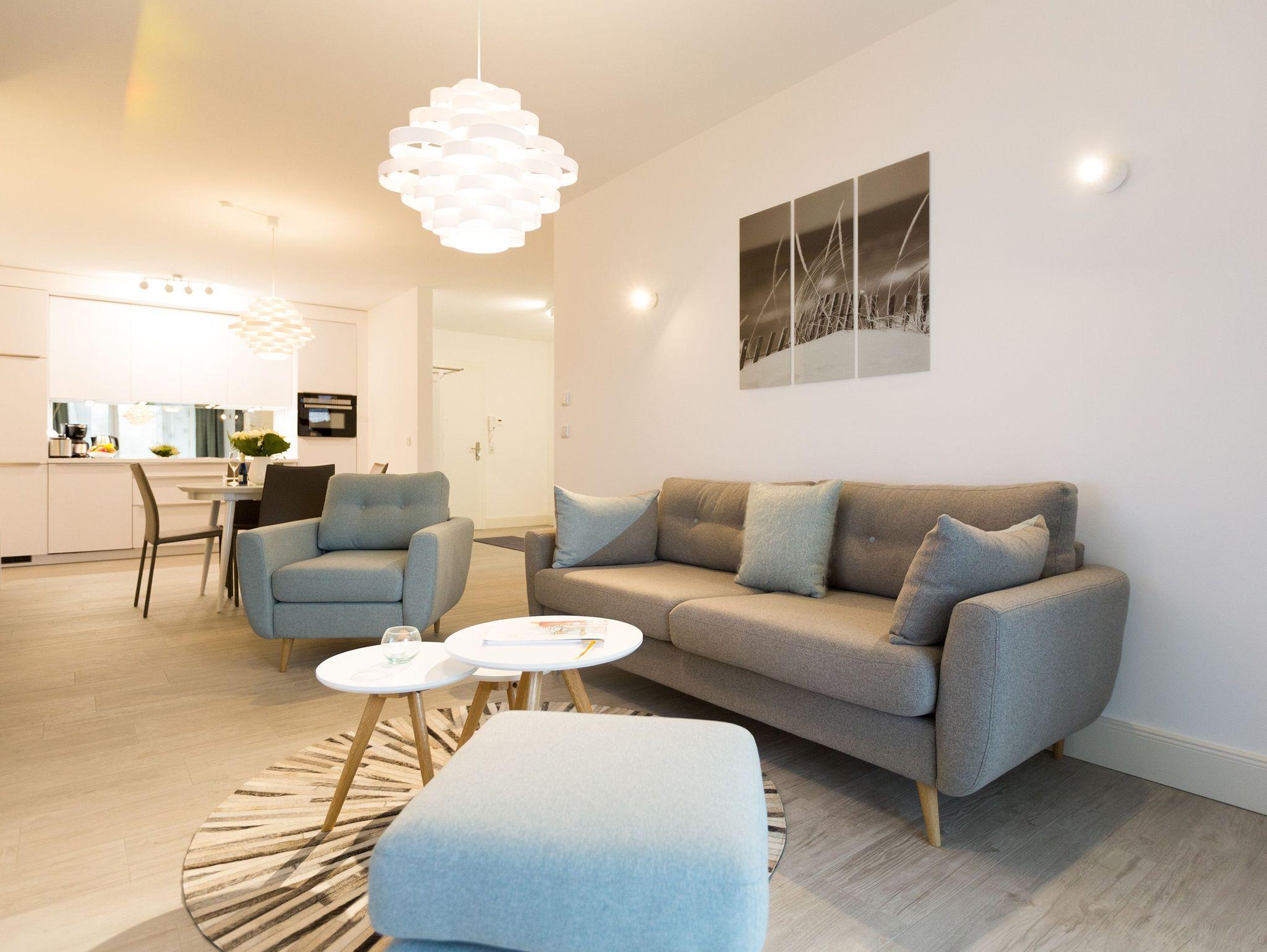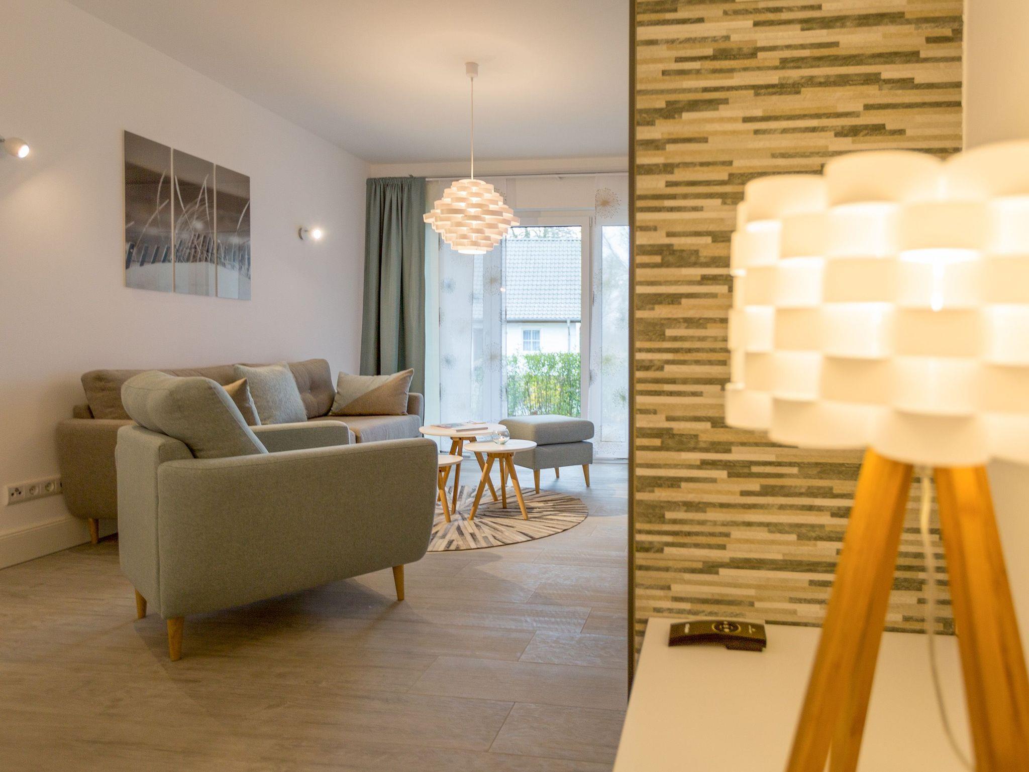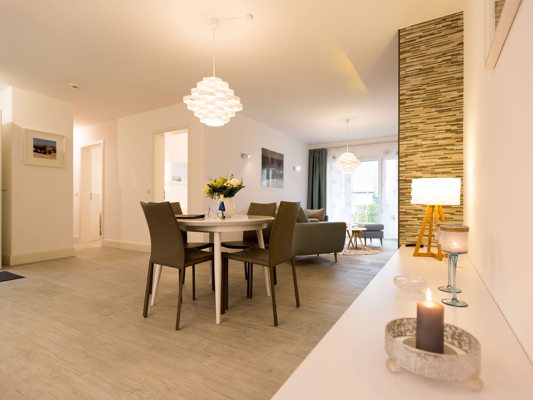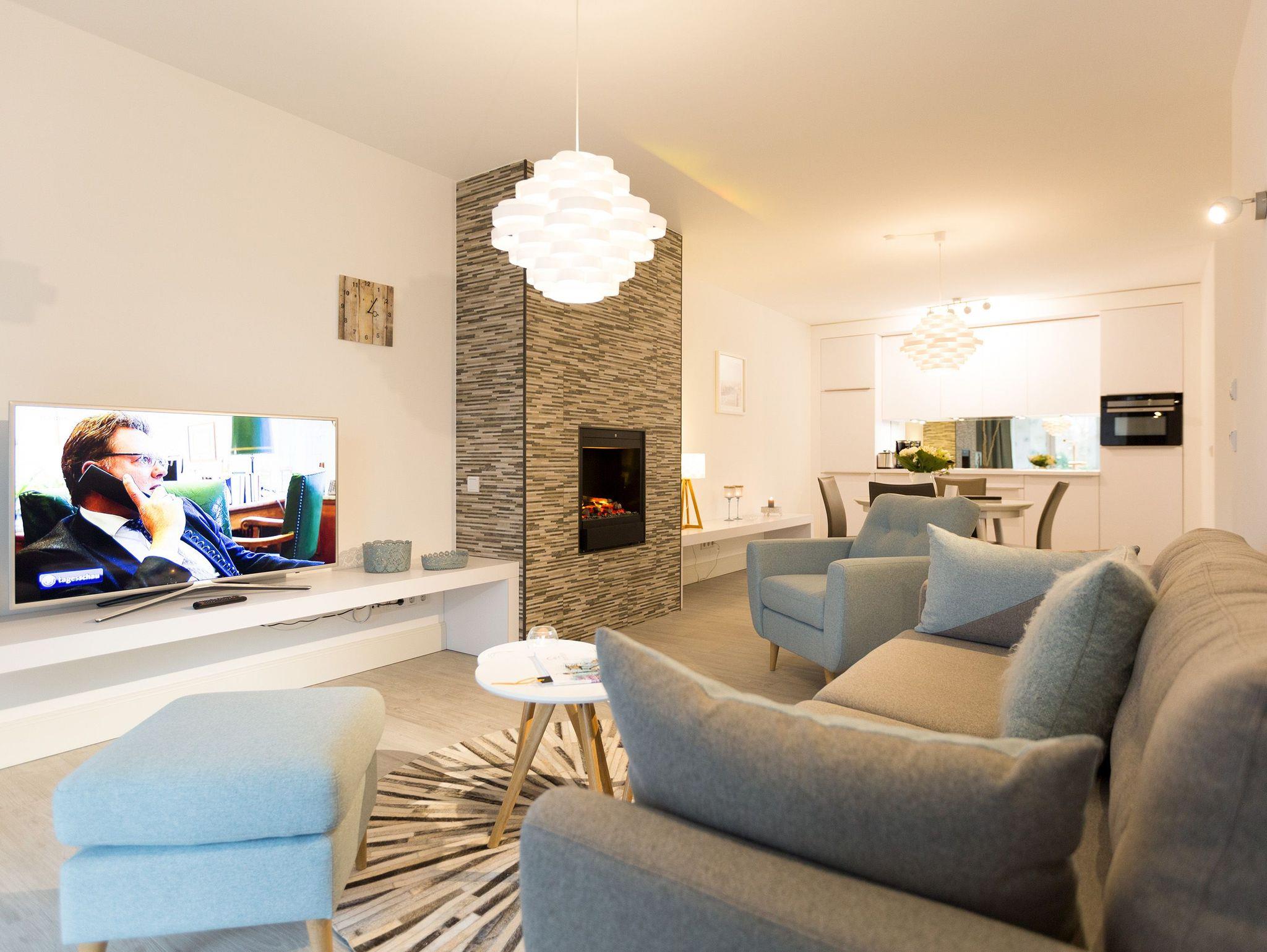 Er ist ein echter Hingucker schon beim Eintreten in dieses elegante und stilvolle Urlaubsappartement im Erdgeschoss der Dünenresidenz Heringsdorf der große, in Stein gefasste Elektro-Kamin. Sein warmes Licht sorgt nicht nur an kühlen Tagen für wohlige Behaglichkeit. Es wartet eine Wohlfühlwelt auf Sie, die auf 80 Quadratmetern reichlich Platz für bis zu vier Erwachsene bietet. Das gesamte Interieur ist harmonisch aufeinander abgestimmt. Stylisch sind auf alle Fälle die nordischen Design-Lampen. Abschalten und den Alltagsstress vergessen, lässt es sich auf der Sitzgruppe mit gemütlicher Couch und Blick auf den Kamin oder den großen Flat-TV wunderbar. Machen Sie die großen, bodentiefen Wohnzimmerfenster auf, lassen sie das Meeresrauschen vom nur 50 Meter entfernten Ostseestrand und die lichten Sonnenstrahlen in ihr Domizil oder entspannen Sie auf der 20 Quadratmeter großen Südterrasse. Zum Wohnbereich gehört eine helle, offene Küche mit großem Esstisch. Mit allem ausgestattet, was das Kochherz höher schlagen lässt, können Sie hier das gemütliche Zusammensitzen und Schlemmen wahrhaft zelebrieren. Haben Sie Spaß und einen erholsamen Schlaf in den beiden Schlafzimmern. Denn hier locken bequeme Doppelboxspringbetten (einmal 1,80 m x 2,00 m und einmal 1,60 m x 2,00 m), um Ihnen die Nächte zu versüßen. Das Badezimmer ist sehr geräumig und mit Waschtisch, WC und großer Echtglas-Dusche ausgestattet. Die Betten sind bezogen und Handtücher liegen bei Ankunft bereit. Zu der Wohnung gehört ein Pkw-Stellplatz in der Tiefgarage (max. Einfahrtshöhe 1,93 m).