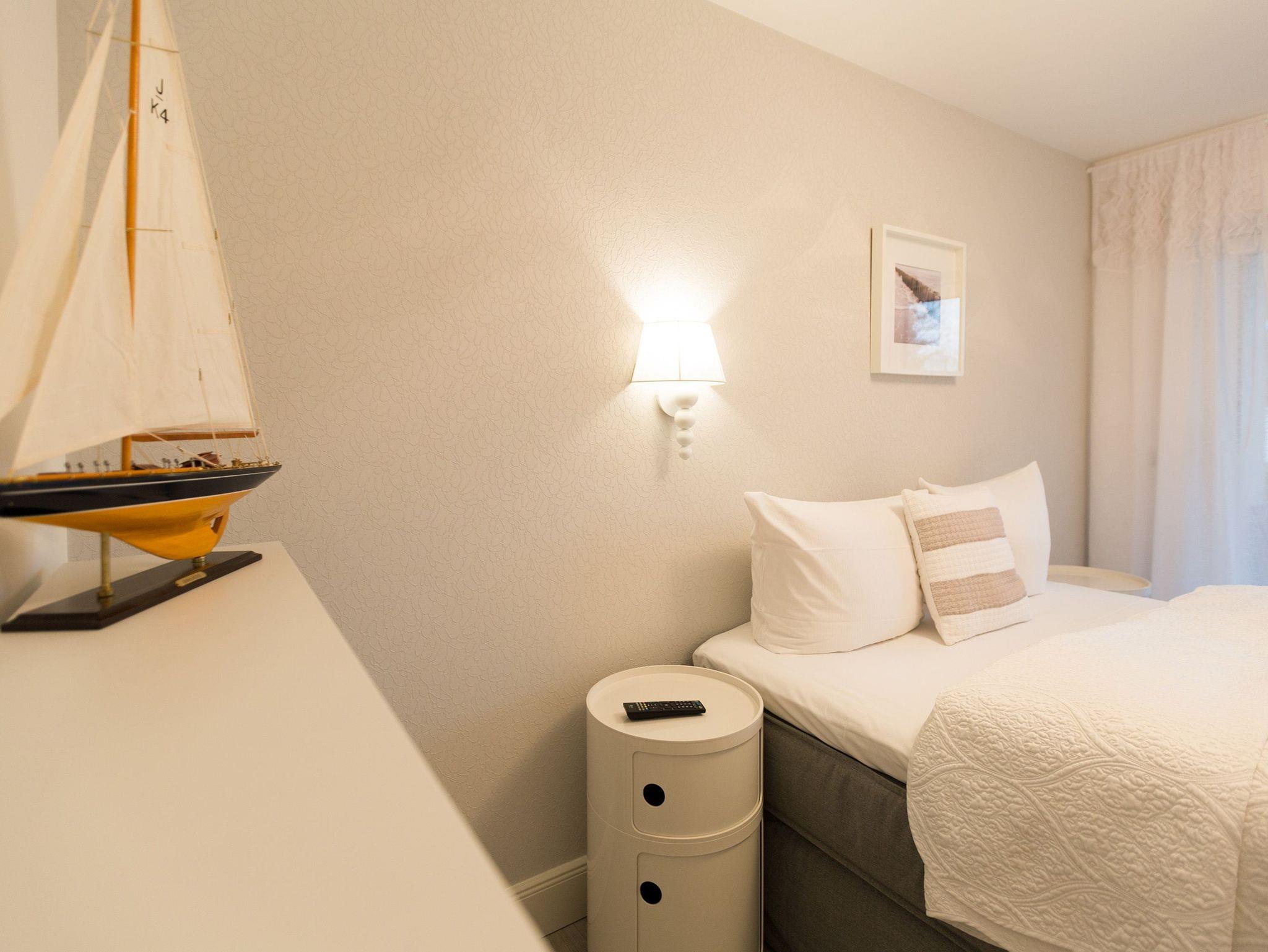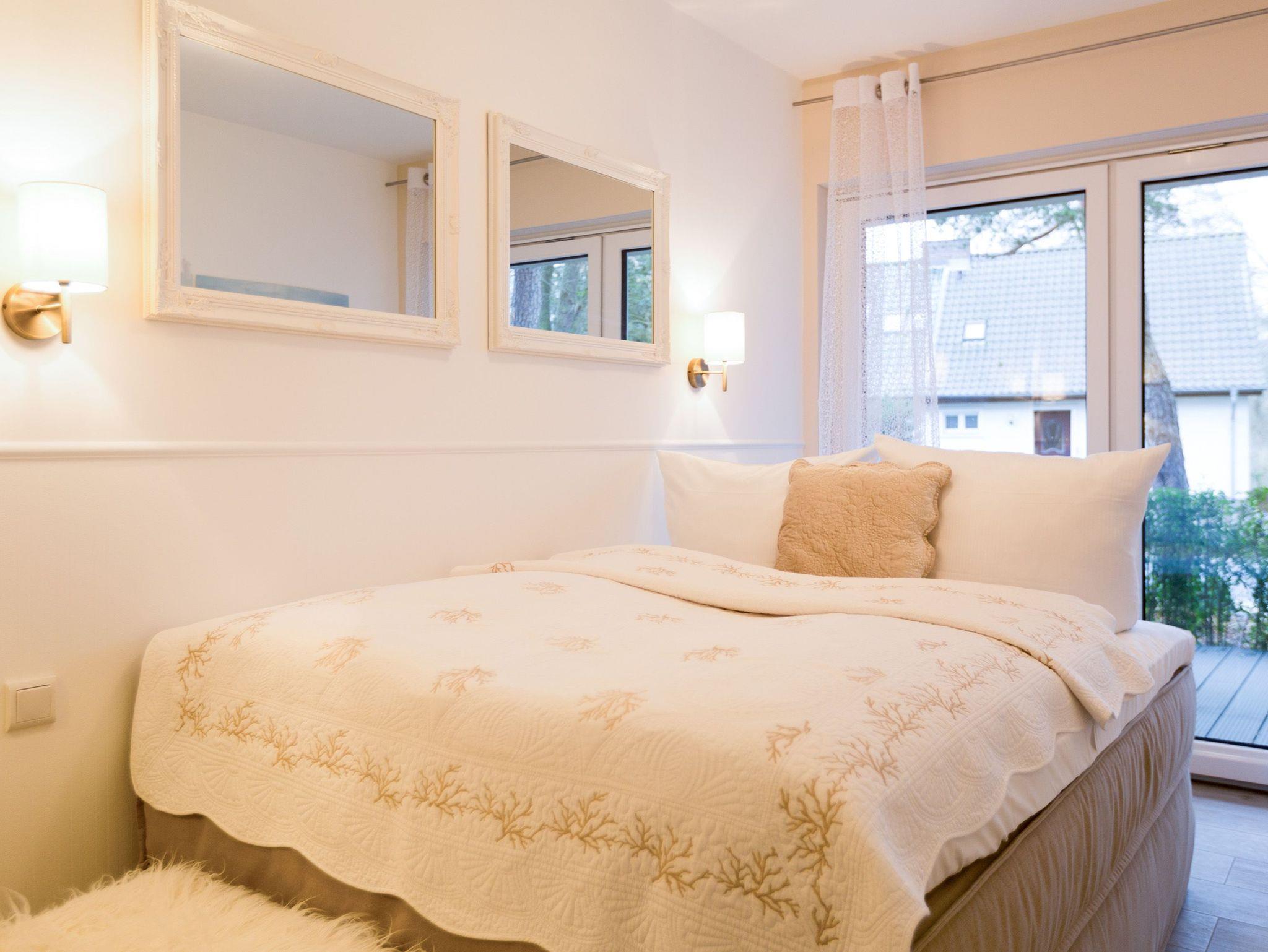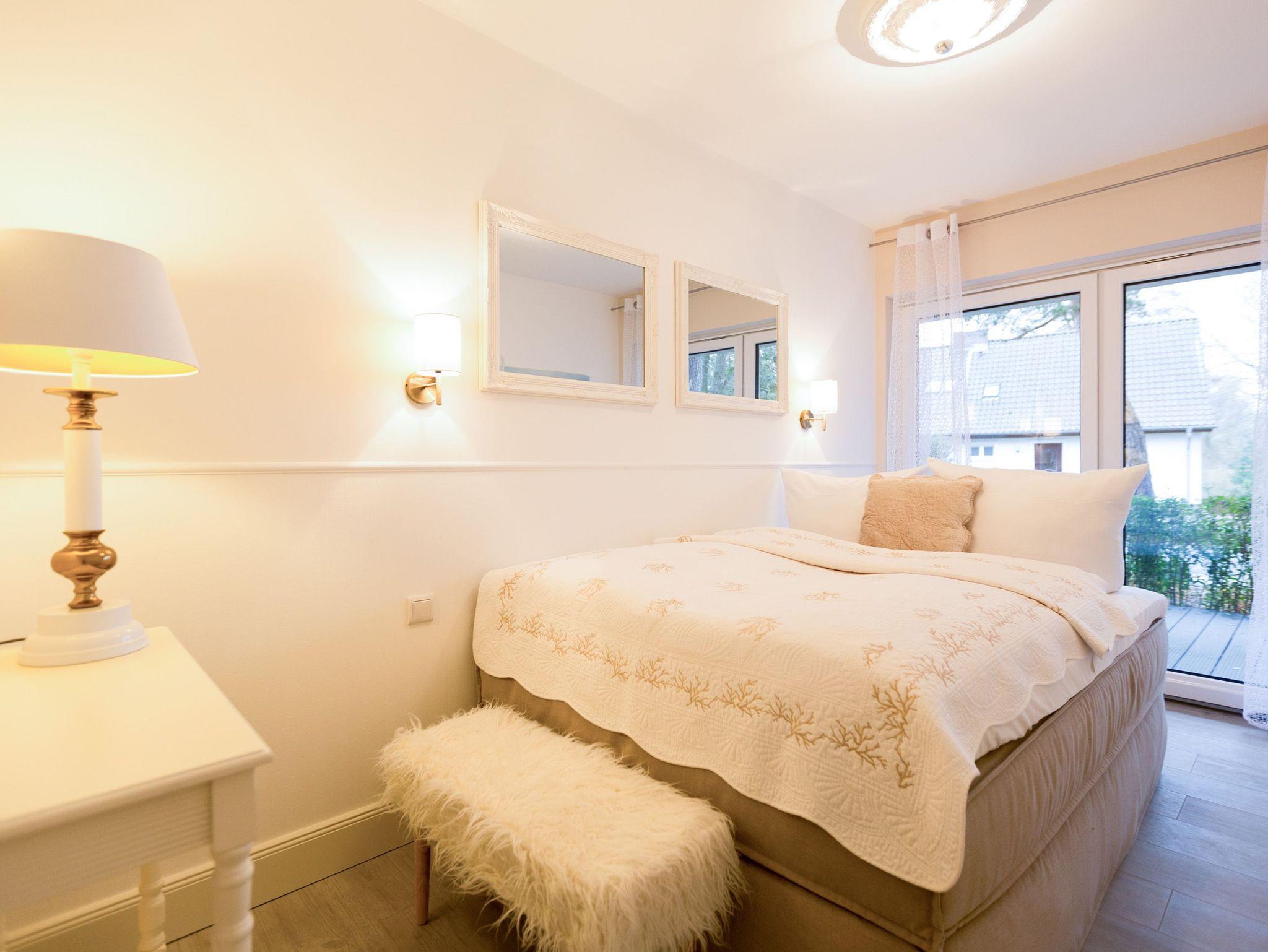 Er ist ein echter Hingucker schon beim Eintreten in dieses elegante und stilvolle Urlaubsappartement im Erdgeschoss der Dünenresidenz Heringsdorf der große, in Stein gefasste Elektro-Kamin. Sein warmes Licht sorgt nicht nur an kühlen Tagen für wohlige Behaglichkeit. Es wartet eine Wohlfühlwelt auf Sie, die auf 80 Quadratmetern reichlich Platz für bis zu vier Erwachsene bietet. Das gesamte Interieur ist harmonisch aufeinander abgestimmt. Stylisch sind auf alle Fälle die nordischen Design-Lampen. Abschalten und den Alltagsstress vergessen, lässt es sich auf der Sitzgruppe mit gemütlicher Couch und Blick auf den Kamin oder den großen Flat-TV wunderbar. Machen Sie die großen, bodentiefen Wohnzimmerfenster auf, lassen sie das Meeresrauschen vom nur 50 Meter entfernten Ostseestrand und die lichten Sonnenstrahlen in ihr Domizil oder entspannen Sie auf der 20 Quadratmeter großen Südterrasse. Zum Wohnbereich gehört eine helle, offene Küche mit großem Esstisch. Mit allem ausgestattet, was das Kochherz höher schlagen lässt, können Sie hier das gemütliche Zusammensitzen und Schlemmen wahrhaft zelebrieren. Haben Sie Spaß und einen erholsamen Schlaf in den beiden Schlafzimmern. Denn hier locken bequeme Doppelboxspringbetten (einmal 1,80 m x 2,00 m und einmal 1,60 m x 2,00 m), um Ihnen die Nächte zu versüßen. Das Badezimmer ist sehr geräumig und mit Waschtisch, WC und großer Echtglas-Dusche ausgestattet. Die Betten sind bezogen und Handtücher liegen bei Ankunft bereit. Zu der Wohnung gehört ein Pkw-Stellplatz in der Tiefgarage (max. Einfahrtshöhe 1,93 m).