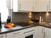 In der Küche, die durch eine Schiebetür vom Wohn-/Schlafraum getrennt ist, finden Sie die vollständige hochwertige Markenausstattung für ihren Aufenthalt. Daran schließt sich im Wohn-/Schlafraum ein großer Esstisch an.