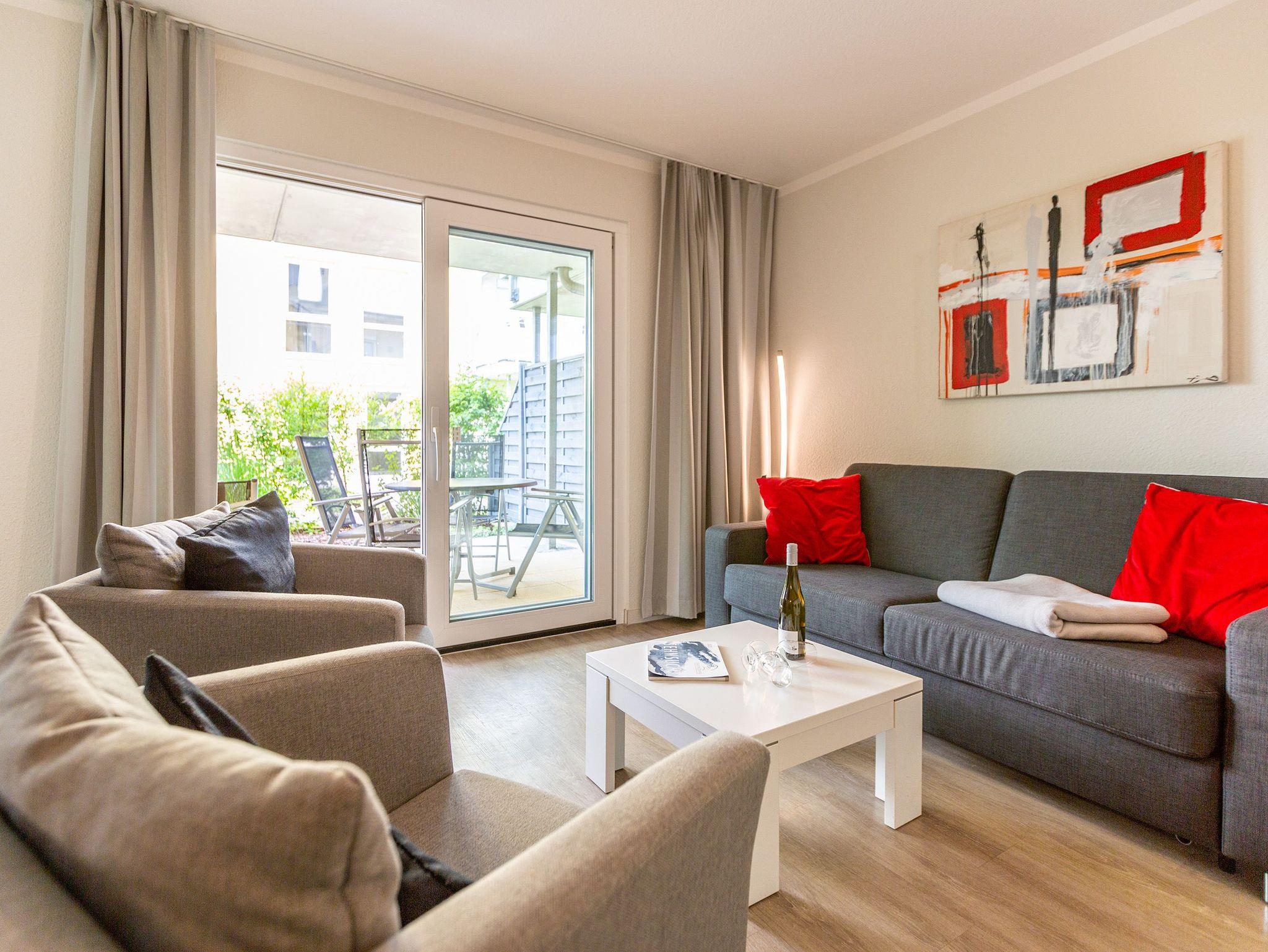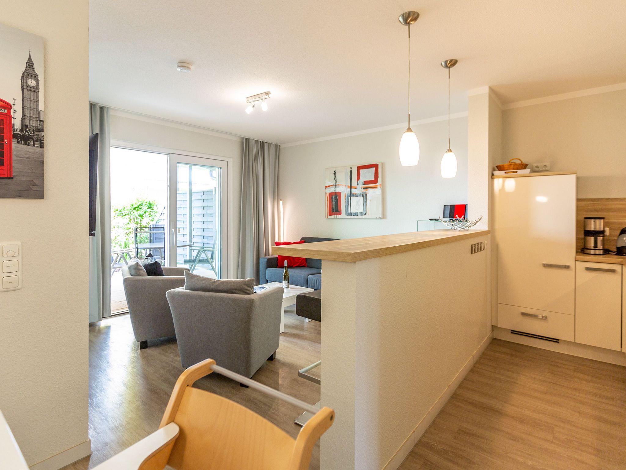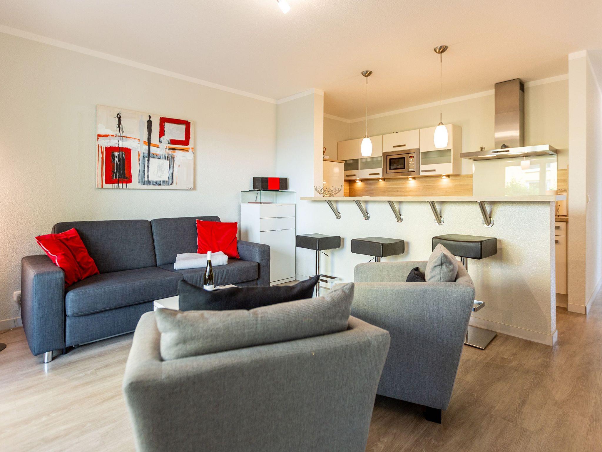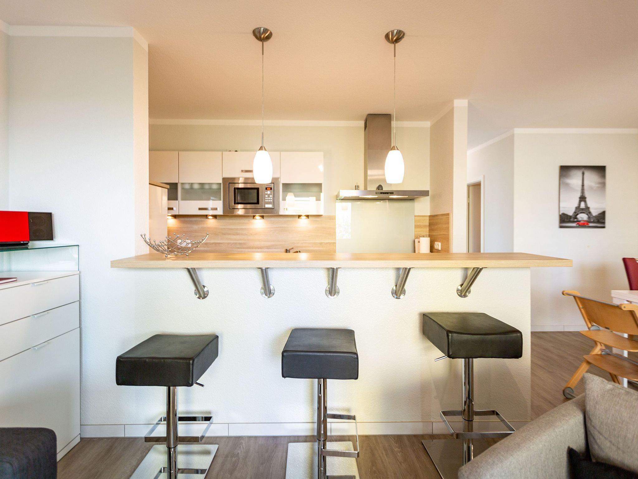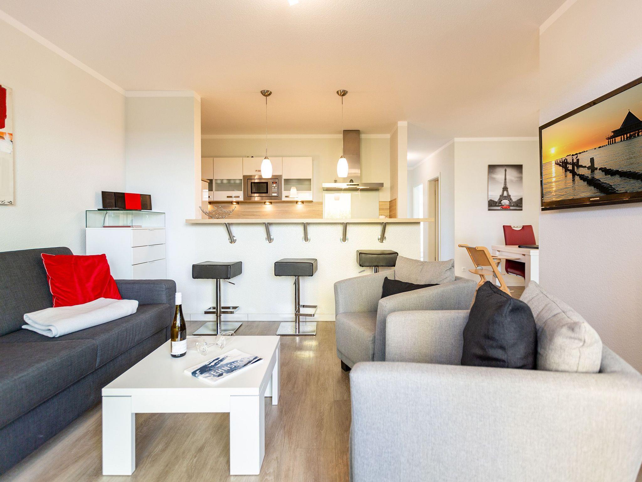 Ein moderner Wohn-Ess-Bereich empfängt den Urlaubsfreudigen in diesem schönen Domizil. Die elegante und stilvolle Einrichtung sorgt für eine gemütliche Atmosphäre. Eine schöne Ledersitzgruppe aus Sofa und Sessel ist ein echter Farbtupfer und lädt zum ausgiebigen Relaxen ein. Die Wohnung im Erdgeschoss des Domizils am Hang bietet auf 67 Quadratmetern viel Platz zum Urlauben. Bis zu vier Personen und ein Kleinkind (im Kinderreisebett) werden dieses kleine Fleckchen Usedom gar nicht wieder verlassen wollen. Die großzügige Südterrasse, die vom Wohnzimmer aus zugängig ist, mit Sonnenliegen und Esstisch ausgestattet, ist das Highlight dieses Appartements. Hier können Sie Sonne satt tanken. Die mit hochwertigen Markengeräten voll ausgestattete Küche ist zum Wohnraum hin offen, aber mit einem stylischen Tresen mit hohen Hockern von diesem abgegrenzt. Am schönen und großen Esstisch können Sie sämtliche Mahlzeiten mit viel Genuss zu sich nehmen. Zwei Schlafzimmer hat die Wohnung Nummer 2. In beiden wartet ein komfortables Boxspringdoppelbett (1,80 m x 2,00 m) nur darauf, Ihnen erholsame Träume zu schenken. Beide Zimmer haben einen Flat-TV mit DVD-Player und Zugang zu einem eigenen, kleinen Balkon, auf dem Sie schon morgens die Sonne genießen können. Die Schränke bieten viel Ablagefläche für die Urlaubsgarderobe. Das Appartement verfügt außerdem über zwei Badezimmer mit ebenerdiger und geräumiger Dusche, Waschtisch und WC. Das Masterbad ist von einem der beiden Schlafzimmer aus zugängig. In beiden Bädern liegen Handtücher für Sie bereit. Zudem sind die Betten bei Anreise für Sie bezogen. Zu der Wohnung gehört ein Tiefgaragenstellplatz. Es gibt auch einen Fahrradabstellraum. Das WLAN-Netz ist kostenfrei nutzbar.