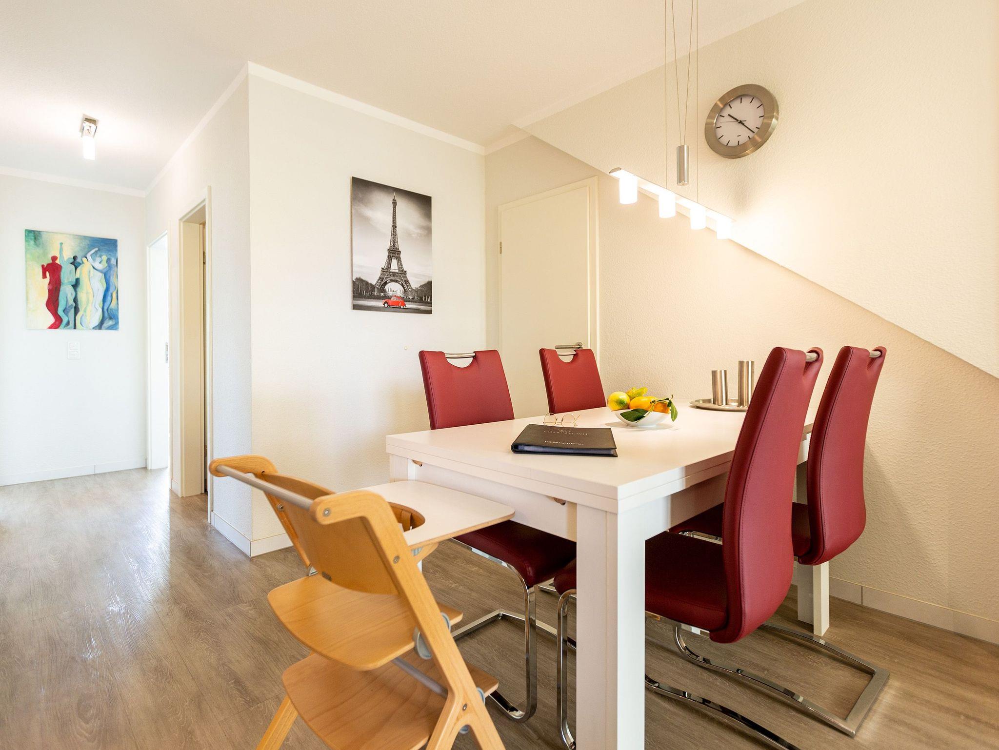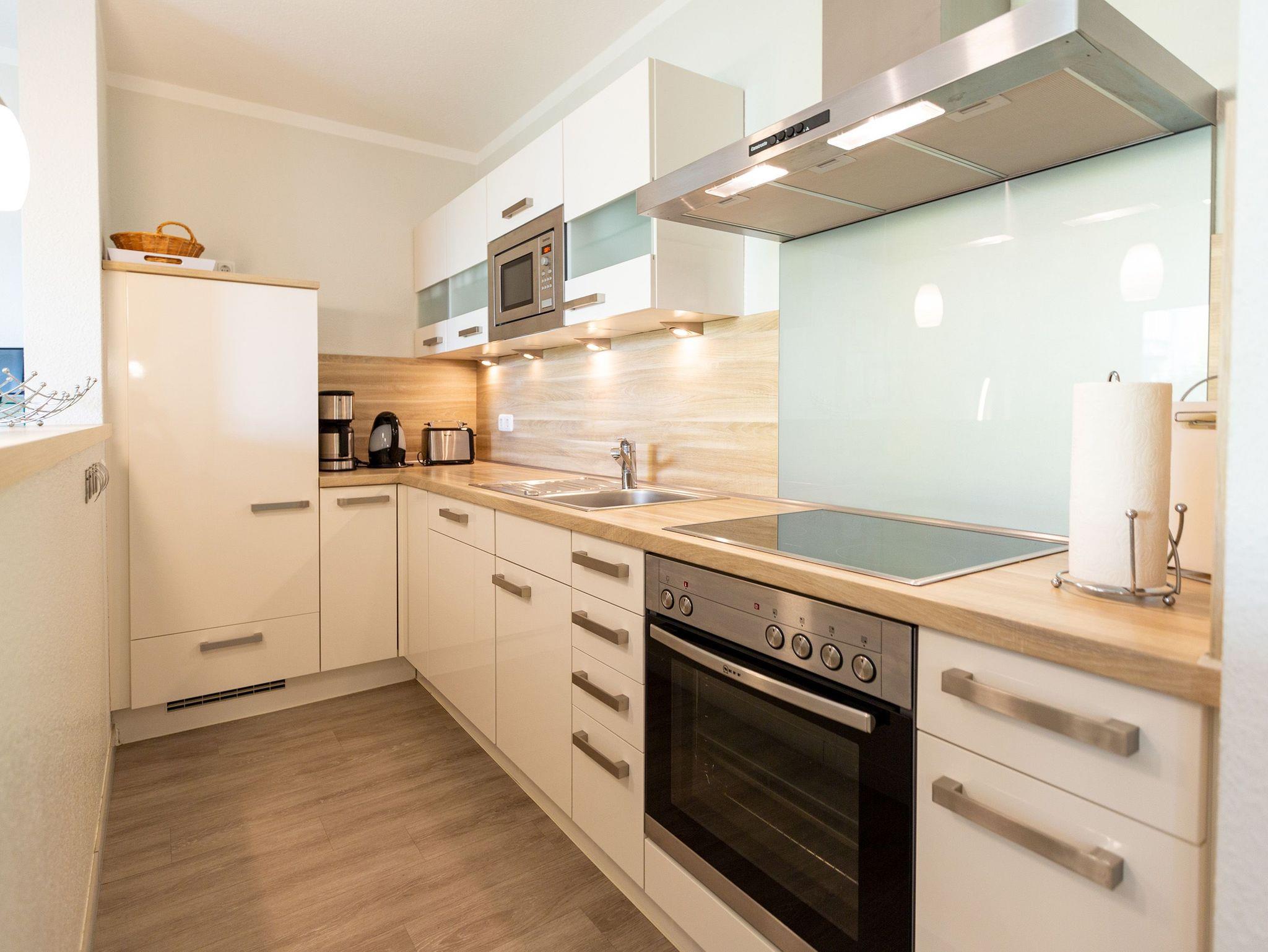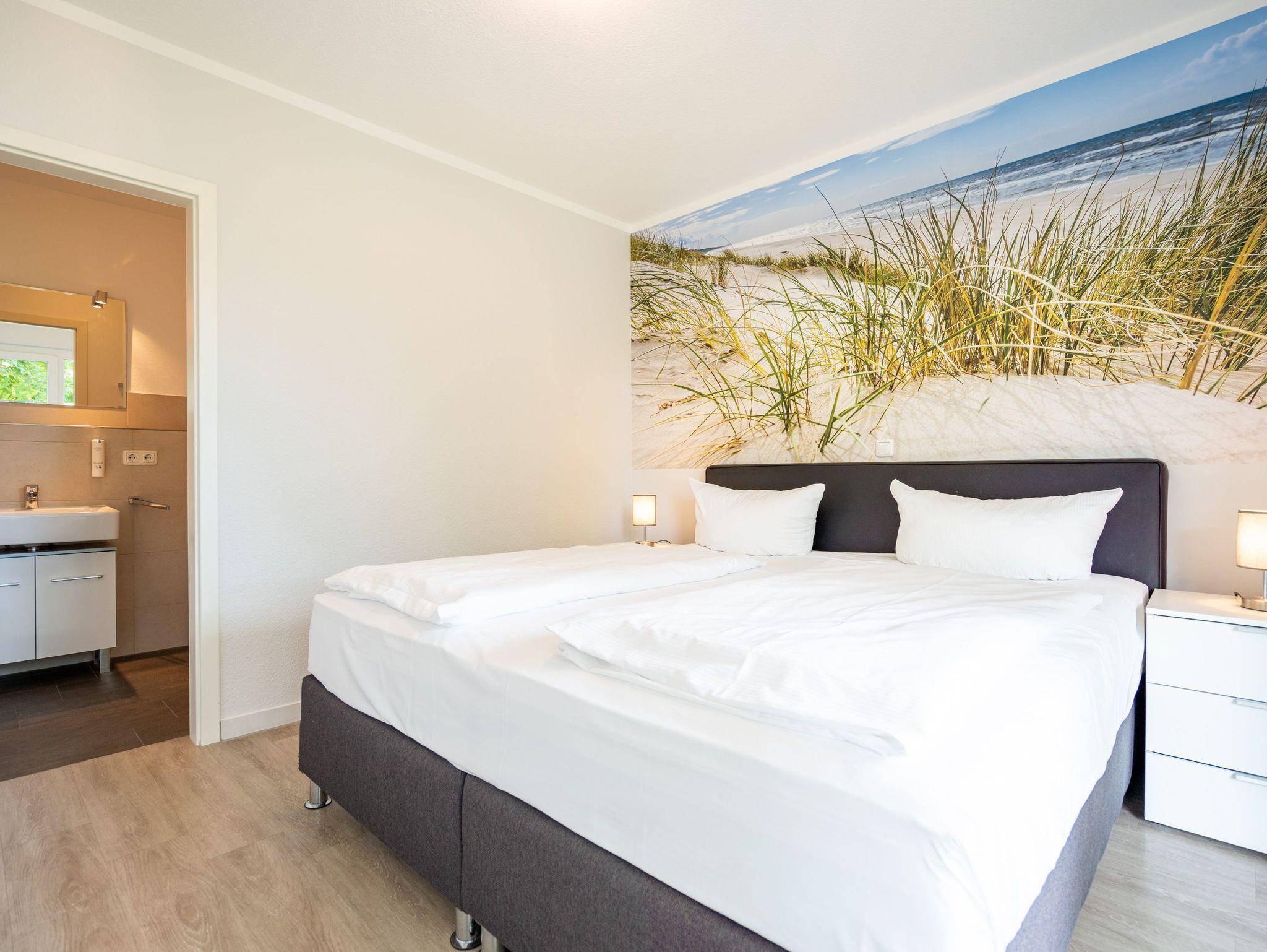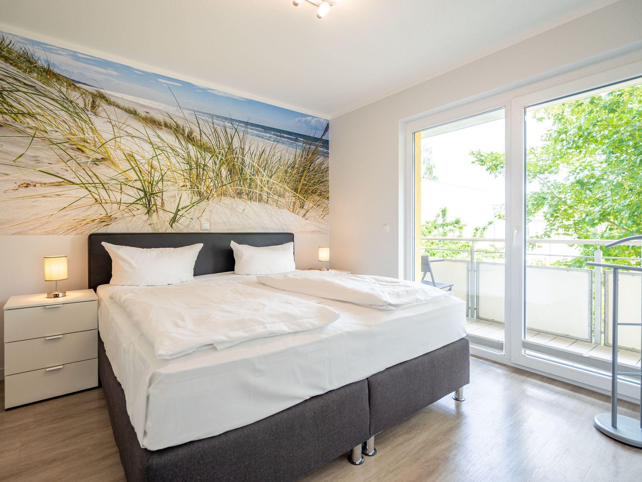 Ein moderner Wohn-Ess-Bereich empfängt den Urlaubsfreudigen in diesem schönen Domizil. Die elegante und stilvolle Einrichtung sorgt für eine gemütliche Atmosphäre. Eine schöne Ledersitzgruppe aus Sofa und Sessel ist ein echter Farbtupfer und lädt zum ausgiebigen Relaxen ein. Die Wohnung im Erdgeschoss des Domizils am Hang bietet auf 67 Quadratmetern viel Platz zum Urlauben. Bis zu vier Personen und ein Kleinkind (im Kinderreisebett) werden dieses kleine Fleckchen Usedom gar nicht wieder verlassen wollen. Die großzügige Südterrasse, die vom Wohnzimmer aus zugängig ist, mit Sonnenliegen und Esstisch ausgestattet, ist das Highlight dieses Appartements. Hier können Sie Sonne satt tanken. Die mit hochwertigen Markengeräten voll ausgestattete Küche ist zum Wohnraum hin offen, aber mit einem stylischen Tresen mit hohen Hockern von diesem abgegrenzt. Am schönen und großen Esstisch können Sie sämtliche Mahlzeiten mit viel Genuss zu sich nehmen. Zwei Schlafzimmer hat die Wohnung Nummer 2. In beiden wartet ein komfortables Boxspringdoppelbett (1,80 m x 2,00 m) nur darauf, Ihnen erholsame Träume zu schenken. Beide Zimmer haben einen Flat-TV mit DVD-Player und Zugang zu einem eigenen, kleinen Balkon, auf dem Sie schon morgens die Sonne genießen können. Die Schränke bieten viel Ablagefläche für die Urlaubsgarderobe. Das Appartement verfügt außerdem über zwei Badezimmer mit ebenerdiger und geräumiger Dusche, Waschtisch und WC. Das Masterbad ist von einem der beiden Schlafzimmer aus zugängig. In beiden Bädern liegen Handtücher für Sie bereit. Zudem sind die Betten bei Anreise für Sie bezogen. Zu der Wohnung gehört ein Tiefgaragenstellplatz. Es gibt auch einen Fahrradabstellraum. Das WLAN-Netz ist kostenfrei nutzbar.