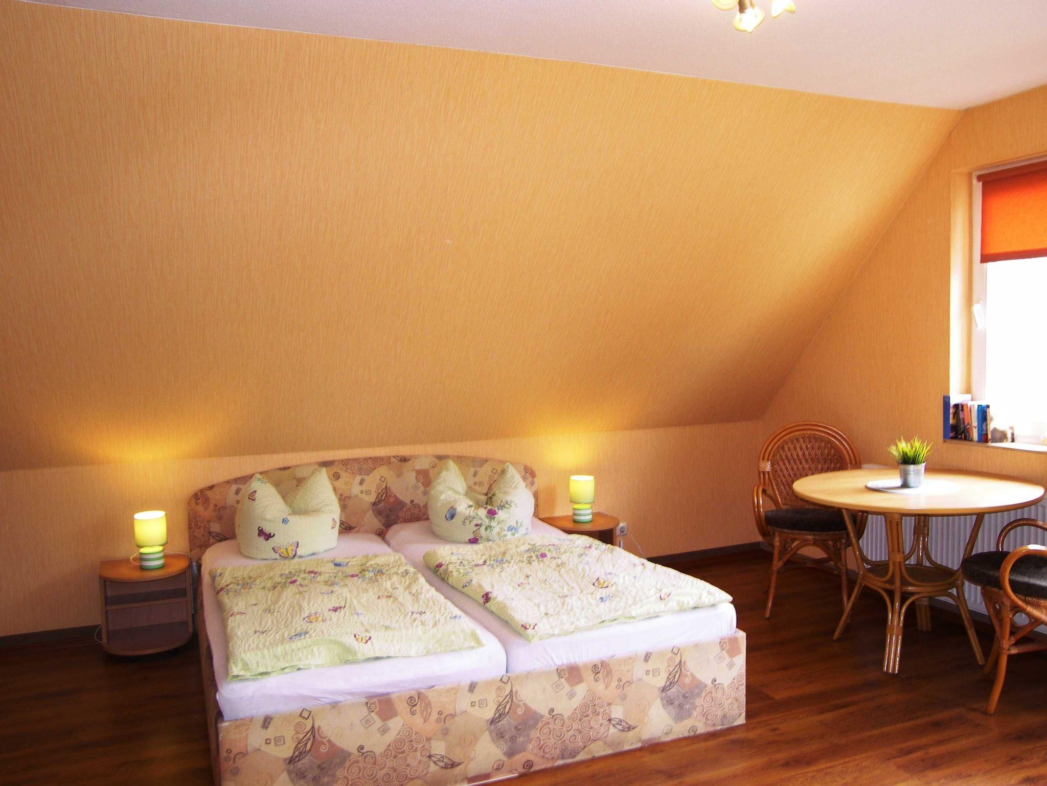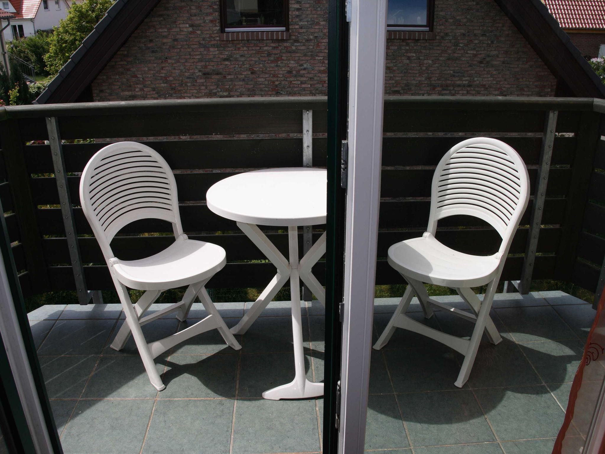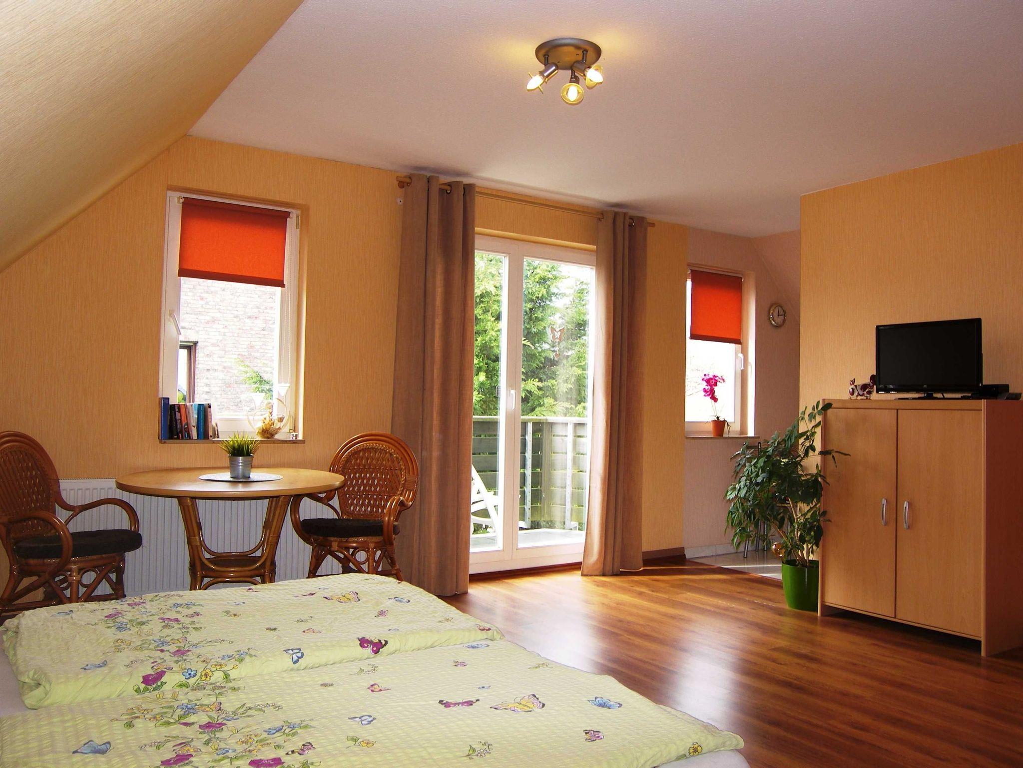 Die moderne 1-Zimmer-Ferienwohnung liegt im 1. OG/Dachgeschoß ist ca. 30 qm groß und verfügt über ein Doppelbett, einen Esstisch mit zwei Stühlen, Kleiderschrank, Flat-TV, Radiowecker und einen schönen Balkon mit Sitzmöbeln zur Südwest-Seite. Eine Aufbettung für ein Kind bis max. 12 Jahre kann auf einem Reiseklappbett erfolgen.