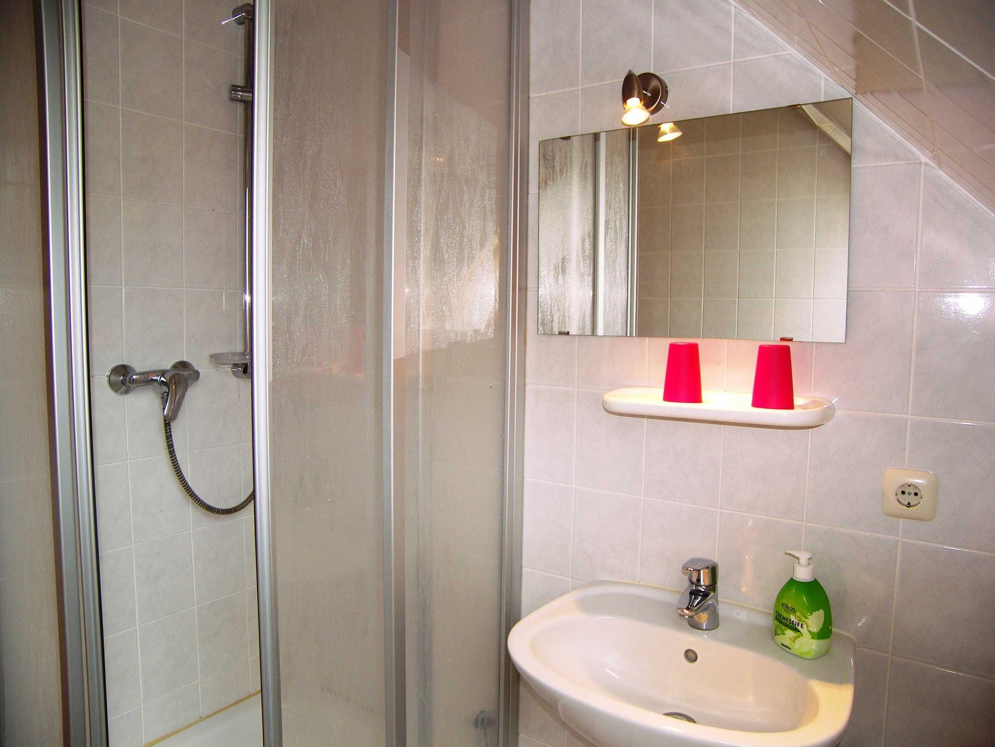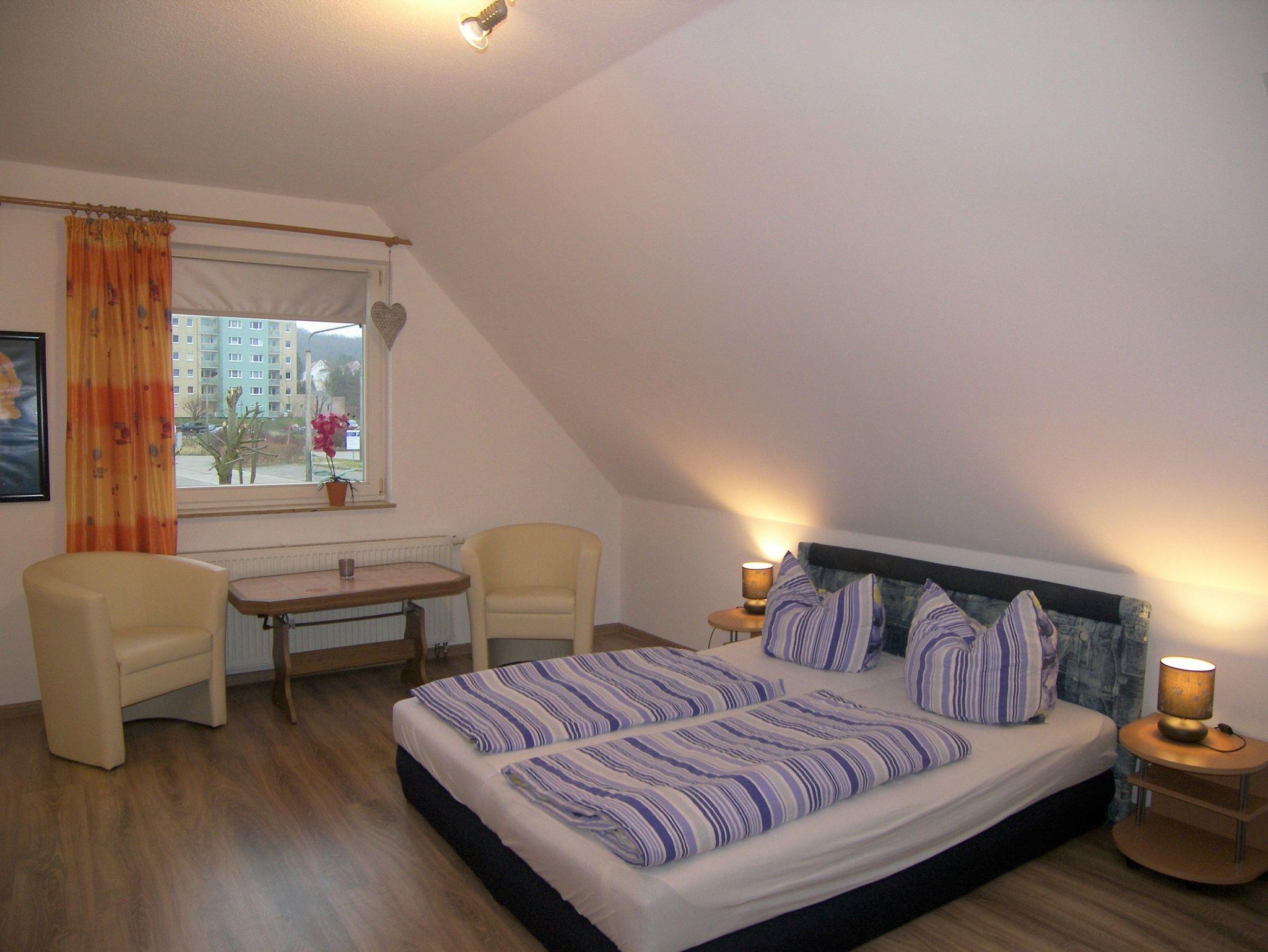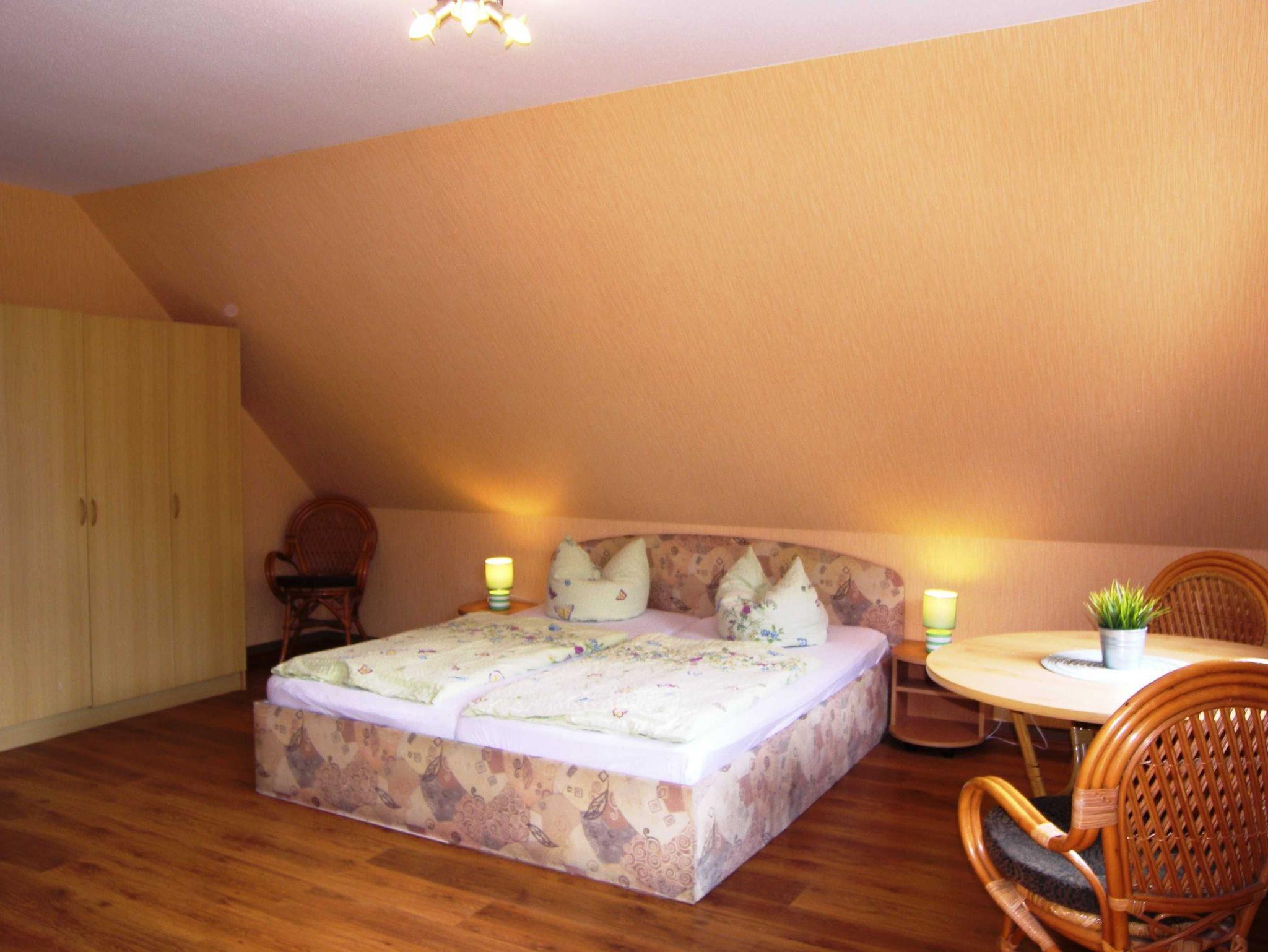 Die moderne 1-Zimmer-Ferienwohnung liegt im 1. OG/Dachgeschoß ist ca. 30 qm groß und verfügt über ein Doppelbett, einen Esstisch mit zwei Stühlen, Kleiderschrank, Flat-TV, Radiowecker und einen schönen Balkon mit Sitzmöbeln zur Südwest-Seite. Eine Aufbettung für ein Kind bis max. 12 Jahre kann auf einem Reiseklappbett erfolgen.