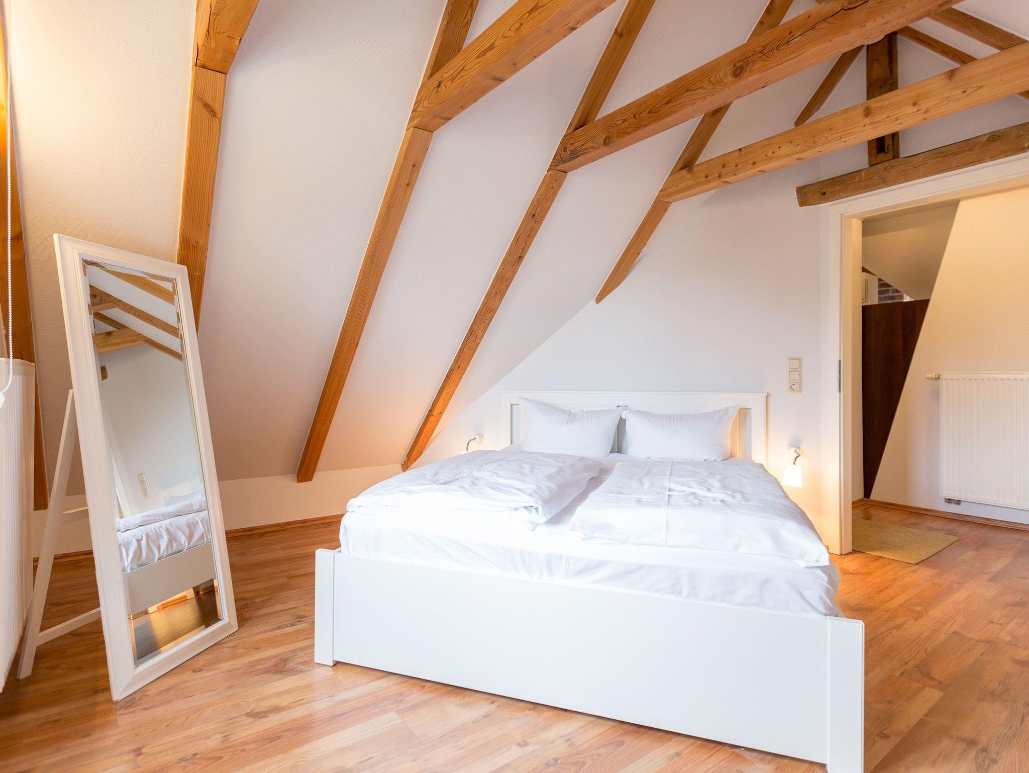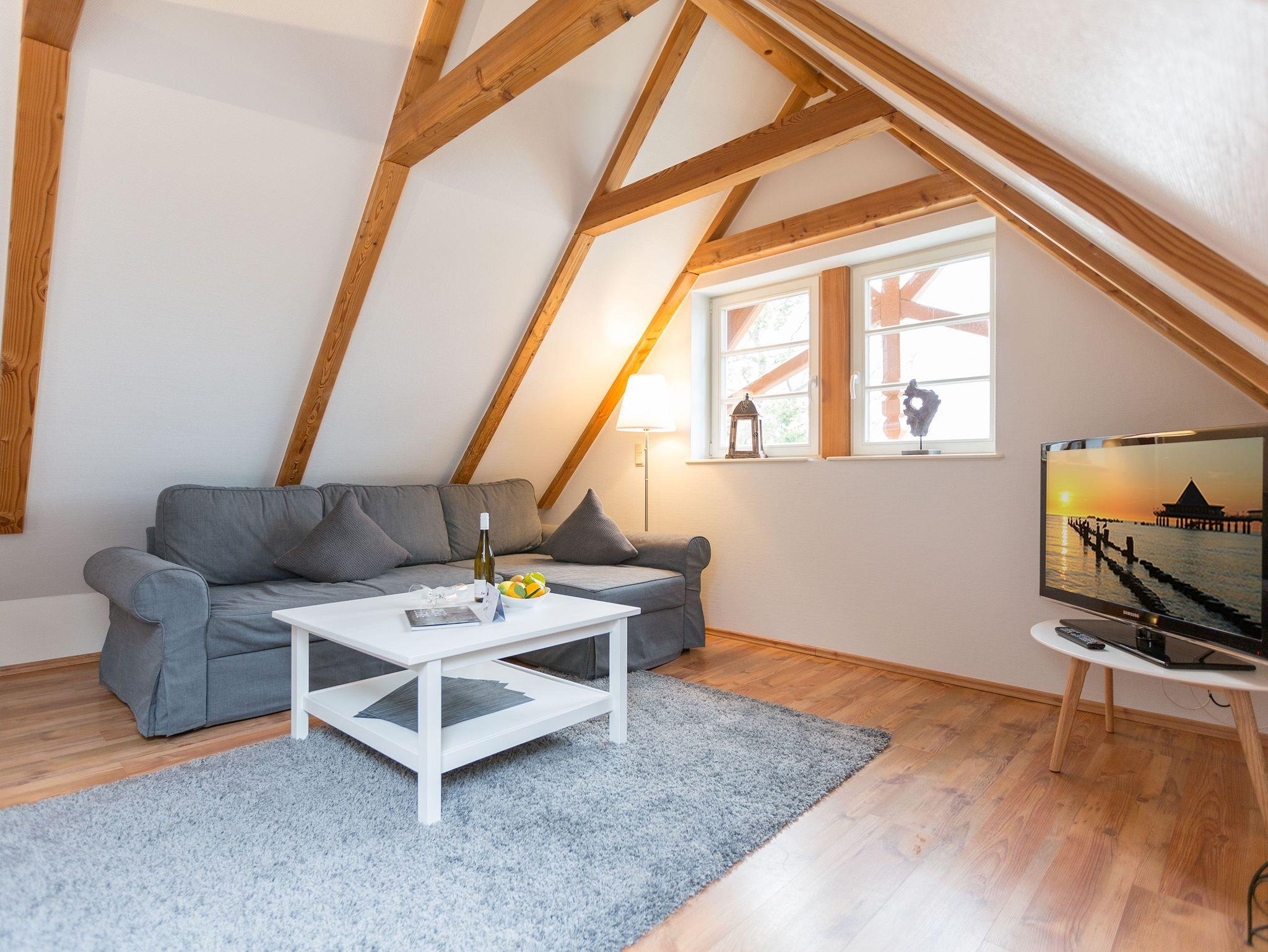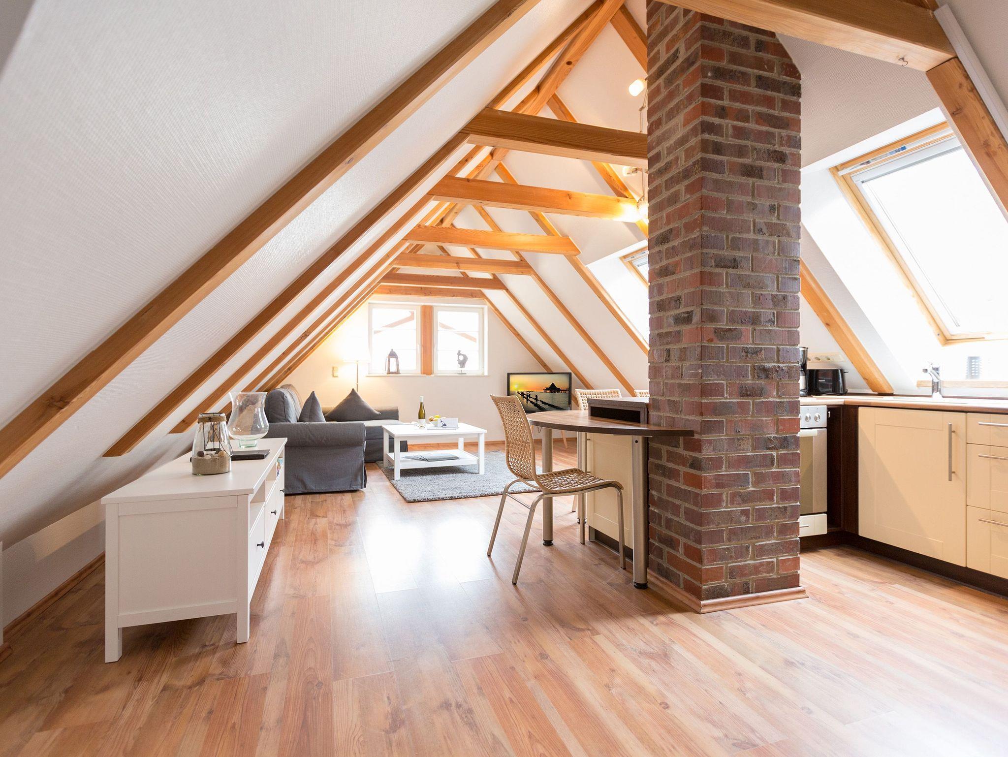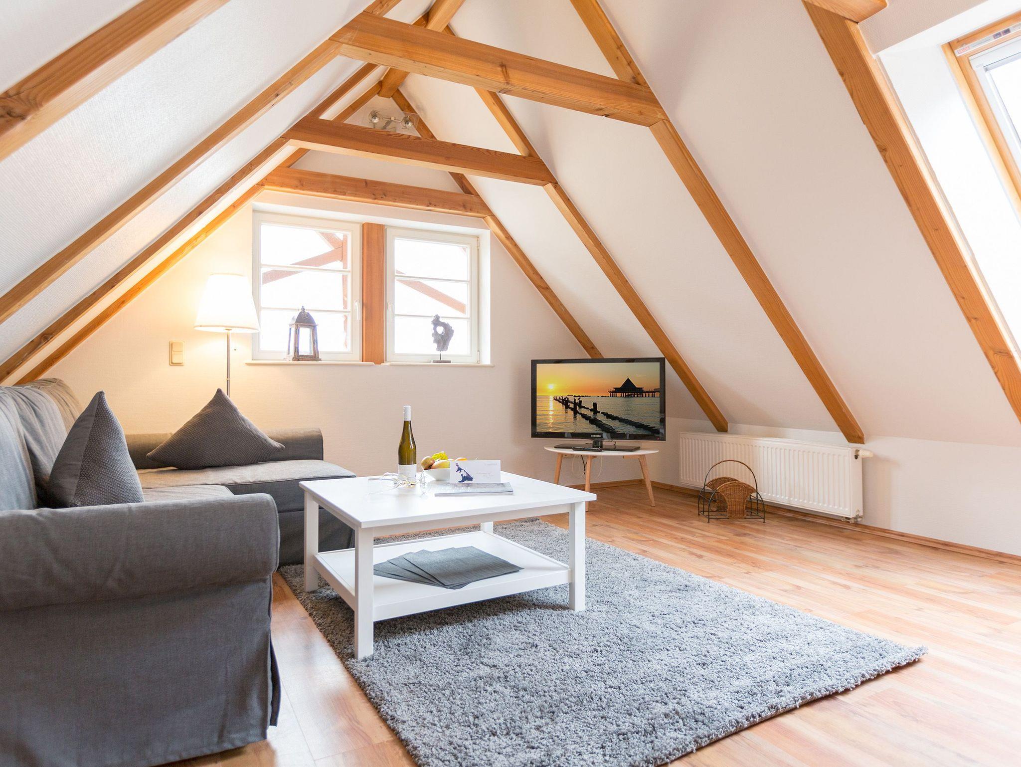 Klein, aber fein und ganz gemütlich unter dem Dach - die helle, freundliche Ferienwohnung im Dachgeschoss der Villa ist 45 qm groß. Baulich bedingt müssen größer gewachsene Gäste im Flurbereich ihren Kopf kurz einziehen weil die ursprüngliche Balkenlage im Dachgeschoss erhalten wurde. Modern, komfortabel und geschmackvoll eingerichtet, bietet es zwei Personen und einem Kleinkind (bis 3 Jahre) Platz zum Wohlfühlen. Das Appartement verfügt über ein Wohnzimmer mit Küchenzeile, ein Schlafzimmer mit Doppelbett und ein Bad mit Dusche und WC. Auf Wunsch stellen wir für unsere kleinen Gäste ein Kinderreisebett (ohne zusätzliche Matratze [&] Bettzeug) und einen Kinderhochstuhl (gegen einen Aufpreis) zur Verfügung.