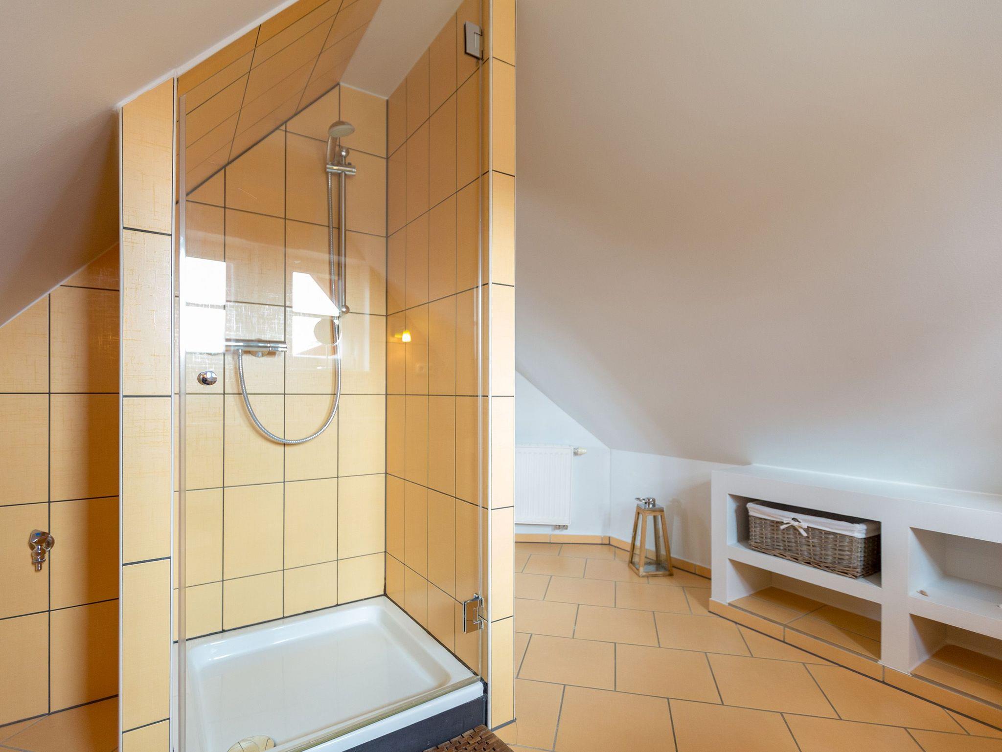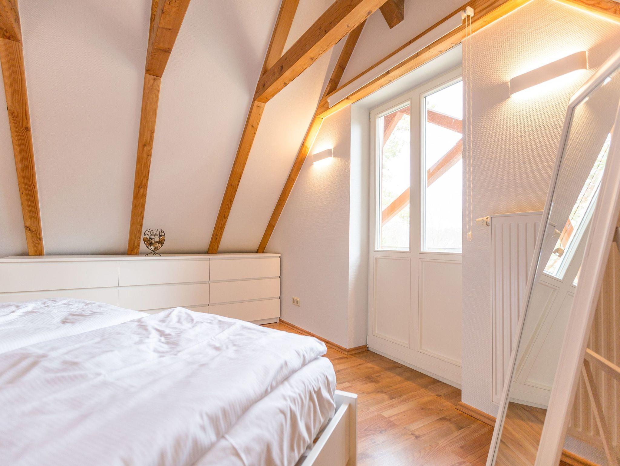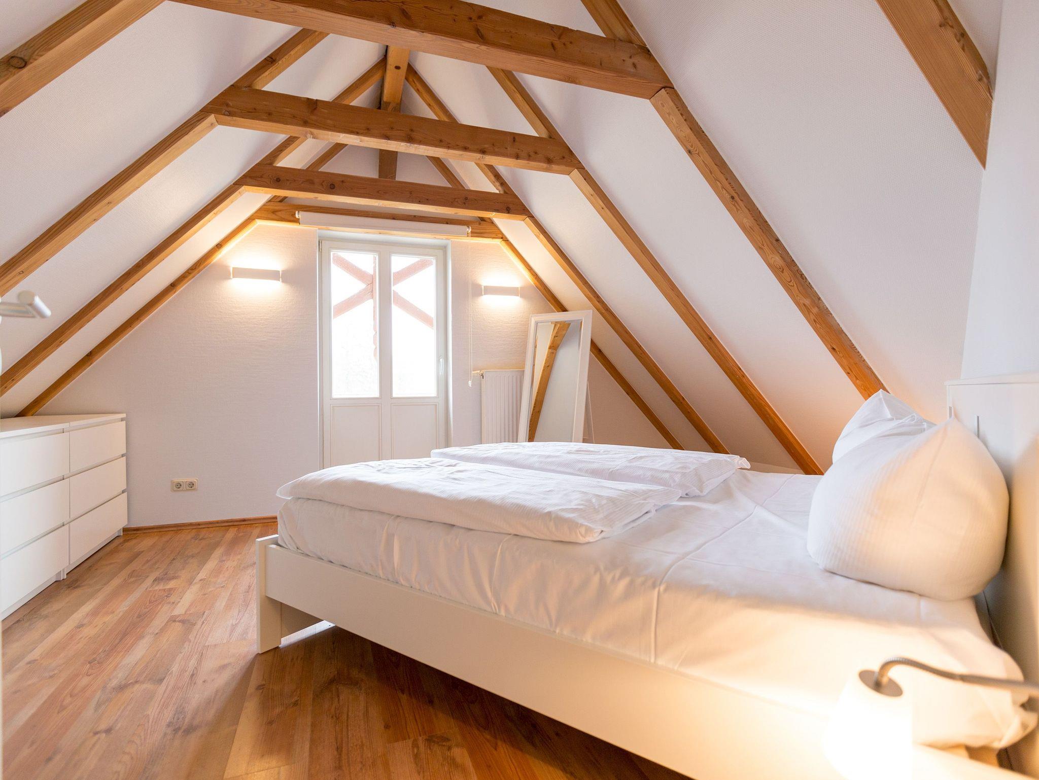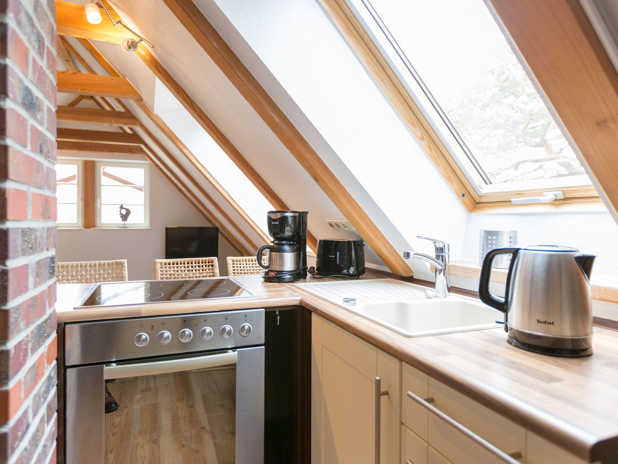 Klein, aber fein und ganz gemütlich unter dem Dach - die helle, freundliche Ferienwohnung im Dachgeschoss der Villa ist 45 qm groß. Baulich bedingt müssen größer gewachsene Gäste im Flurbereich ihren Kopf kurz einziehen weil die ursprüngliche Balkenlage im Dachgeschoss erhalten wurde. Modern, komfortabel und geschmackvoll eingerichtet, bietet es zwei Personen und einem Kleinkind (bis 3 Jahre) Platz zum Wohlfühlen. Das Appartement verfügt über ein Wohnzimmer mit Küchenzeile, ein Schlafzimmer mit Doppelbett und ein Bad mit Dusche und WC. Auf Wunsch stellen wir für unsere kleinen Gäste ein Kinderreisebett (ohne zusätzliche Matratze [&] Bettzeug) und einen Kinderhochstuhl (gegen einen Aufpreis) zur Verfügung.