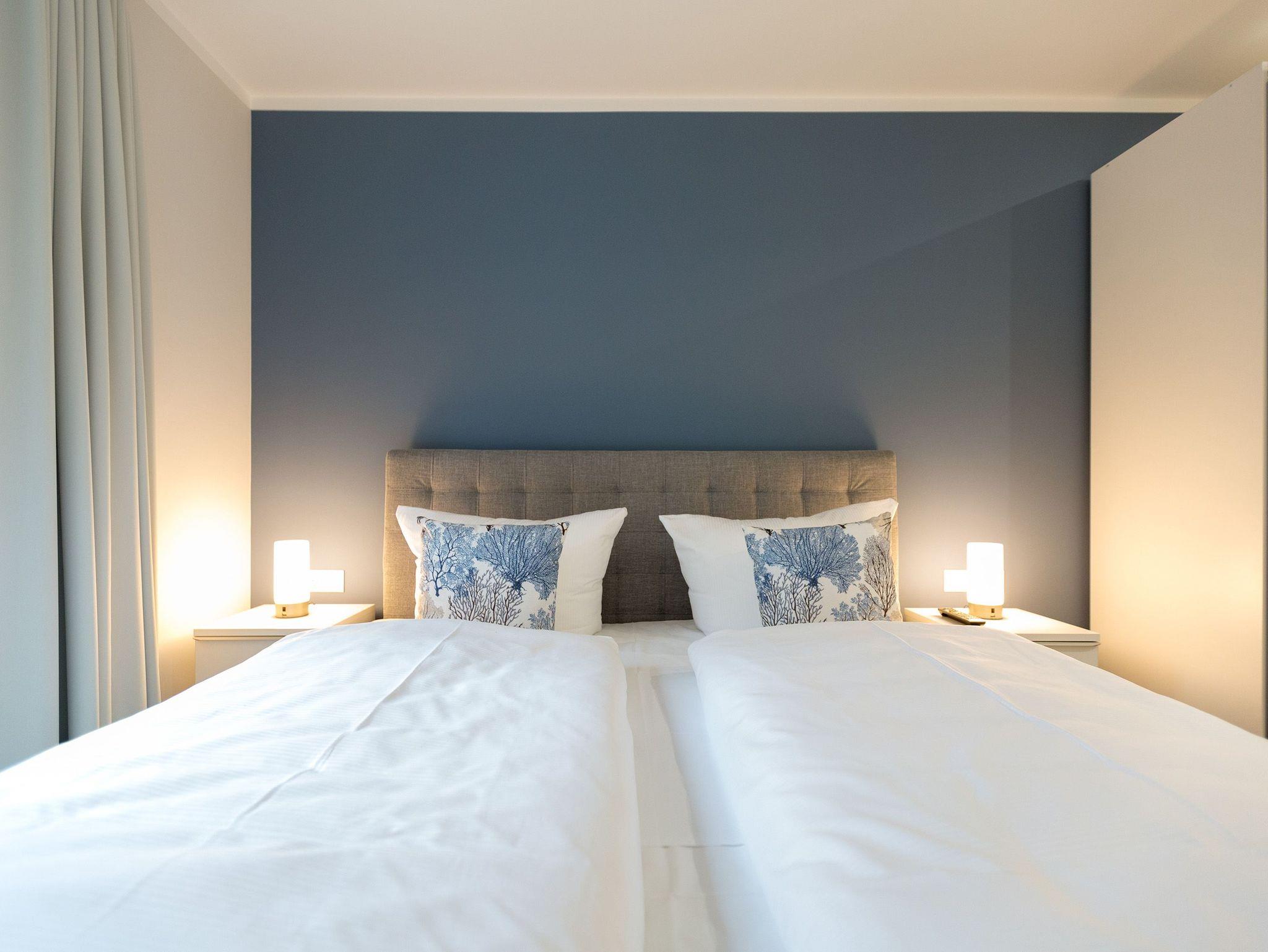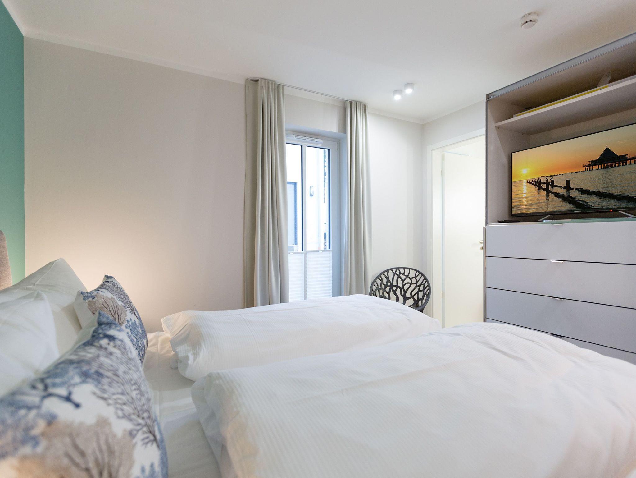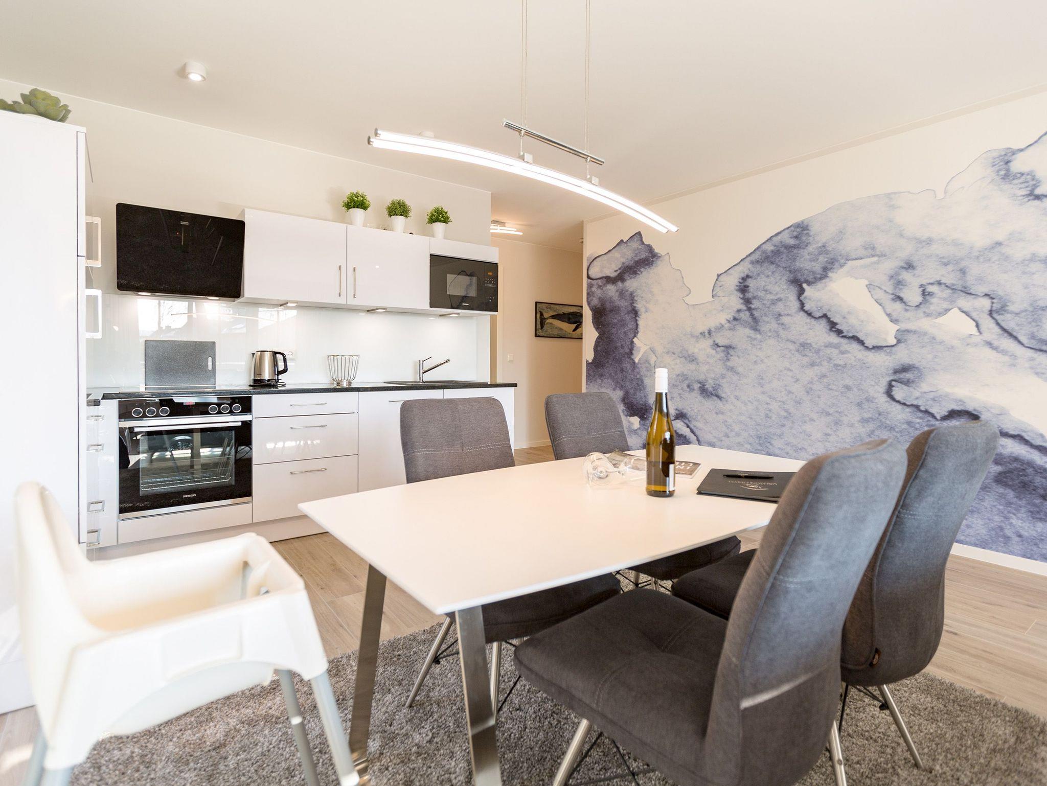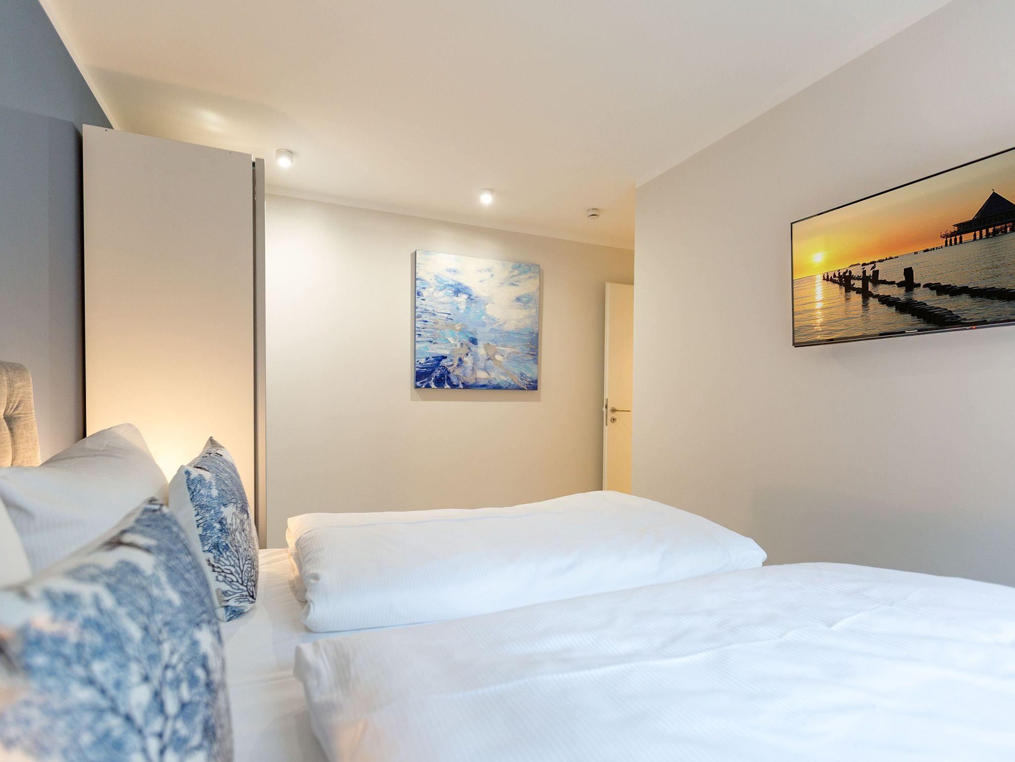 Urlauben wie im Paradies ? dieses Drei-Zimmer-Feriendomizil im Erdgeschoss macht den Traum von purer Entspannung wahr. Und das mit Stil. Die 84 Quadratmeter laden vier Personen und ein Kleinkind bis 3 Jahre (im Kinderreisebett) zum ausgiebigen Entspannen und Genießen ein. Viel Platz und viel Licht erwarten Sie. Die Einrichtung der gesamten Wohnung ist stylisch und modern. Nordisches Design verleiht dem Appartement eine edle und helle Atmosphäre. Das große Wohn-Ess-Zimmer ist ein wunderbarer Ort für gemeinsame Stunden beim Relaxen oder Essen. Ein komfortables Sofa mit Sessel ist für entspannte Fernsehzeiten vor dem großen Flat-TV oder gemütliche Momente vor dem Kaminofen ideal geeignet. Fallenlassen, abschalten und neue Energie tanken. Das können Sie auch am schönen großen Esstisch. Kochen Sie in der offenen Küche gemeinsam. Die Küche ist mit allen Geräten und mit edlem Geschirr voll ausgestattet. Die Sonne können Sie nicht nur am Strand, sondern auch auf ihrer eigenen Terrasse (10 Quadratmeter) genießen. Die Südost-Ausrichtung sorgt dafür, dass Sie hier schon morgens zum Frühstück Sonne haben. Die Wohnung verfügt zudem über eine zweite, kleine Terrasse (3 Quadratmeter). Damit jeder genügend Platz für sich und seine Bedürfnisse hat, gibt es zwei Schlafzimmer und auch zwei Bäder. Einigen müssen Sie sich dann nur noch, wer welche Farbe bevorzugt. Ausgestattet sind beide Schlafzimmer mit bequemen Boxspringdoppelbetten (1,80 m x 2,00 m), geräumigen Schränken und einem Flat-TV. In beiden Bädern gibt es eine Dusche, einen Waschtisch und ein WC. Zum absoluten Wellness-Highlight wird dieses Urlaubsdomizil durch die Finnische Sauna in einem der Bäder. So können Sie den Urlaub auch bei schlechtem Wetter oder im Winter genießen. Für Ihr Auto ist in der Tiefgarage ein Stellplatz reserviert. Und bei Ankunft sind auch die Betten bereits bezogen und Handtücher liegen bereit.