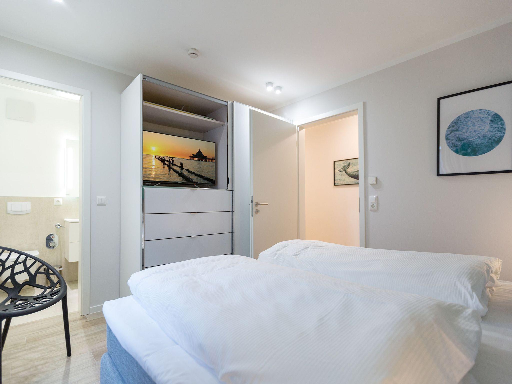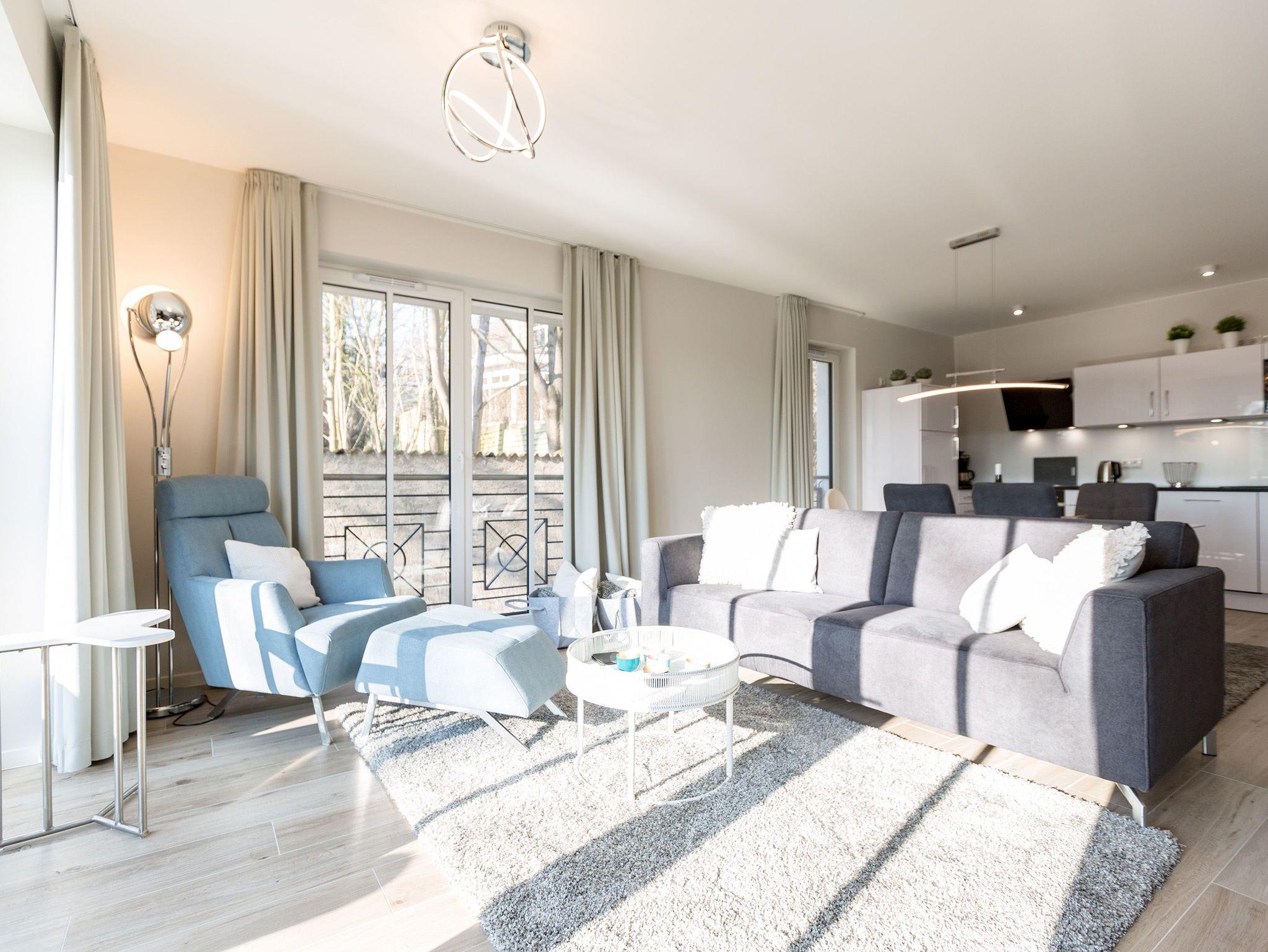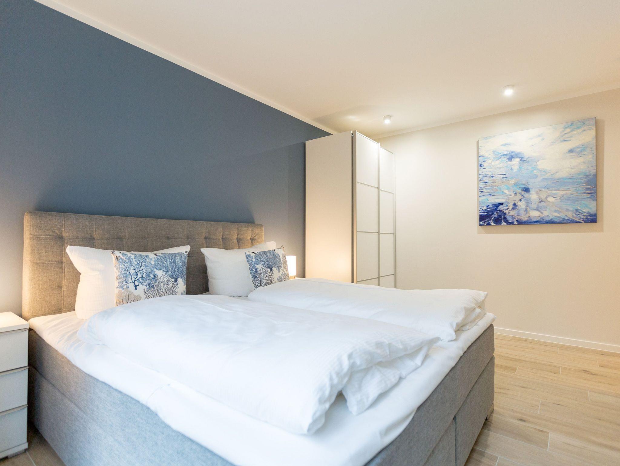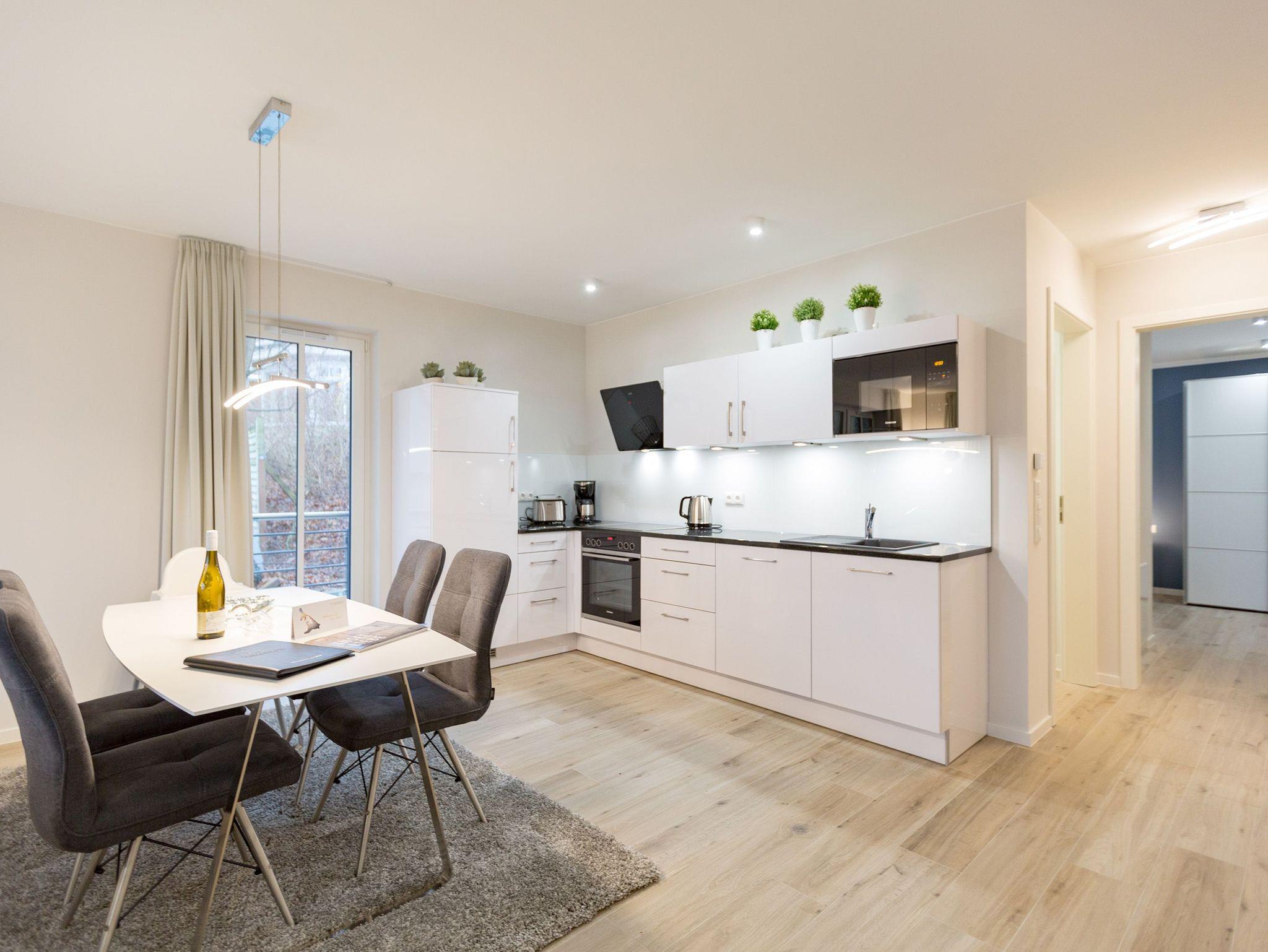 Urlauben wie im Paradies ? dieses Drei-Zimmer-Feriendomizil im Erdgeschoss macht den Traum von purer Entspannung wahr. Und das mit Stil. Die 84 Quadratmeter laden vier Personen und ein Kleinkind bis 3 Jahre (im Kinderreisebett) zum ausgiebigen Entspannen und Genießen ein. Viel Platz und viel Licht erwarten Sie. Die Einrichtung der gesamten Wohnung ist stylisch und modern. Nordisches Design verleiht dem Appartement eine edle und helle Atmosphäre. Das große Wohn-Ess-Zimmer ist ein wunderbarer Ort für gemeinsame Stunden beim Relaxen oder Essen. Ein komfortables Sofa mit Sessel ist für entspannte Fernsehzeiten vor dem großen Flat-TV oder gemütliche Momente vor dem Kaminofen ideal geeignet. Fallenlassen, abschalten und neue Energie tanken. Das können Sie auch am schönen großen Esstisch. Kochen Sie in der offenen Küche gemeinsam. Die Küche ist mit allen Geräten und mit edlem Geschirr voll ausgestattet. Die Sonne können Sie nicht nur am Strand, sondern auch auf ihrer eigenen Terrasse (10 Quadratmeter) genießen. Die Südost-Ausrichtung sorgt dafür, dass Sie hier schon morgens zum Frühstück Sonne haben. Die Wohnung verfügt zudem über eine zweite, kleine Terrasse (3 Quadratmeter). Damit jeder genügend Platz für sich und seine Bedürfnisse hat, gibt es zwei Schlafzimmer und auch zwei Bäder. Einigen müssen Sie sich dann nur noch, wer welche Farbe bevorzugt. Ausgestattet sind beide Schlafzimmer mit bequemen Boxspringdoppelbetten (1,80 m x 2,00 m), geräumigen Schränken und einem Flat-TV. In beiden Bädern gibt es eine Dusche, einen Waschtisch und ein WC. Zum absoluten Wellness-Highlight wird dieses Urlaubsdomizil durch die Finnische Sauna in einem der Bäder. So können Sie den Urlaub auch bei schlechtem Wetter oder im Winter genießen. Für Ihr Auto ist in der Tiefgarage ein Stellplatz reserviert. Und bei Ankunft sind auch die Betten bereits bezogen und Handtücher liegen bereit.